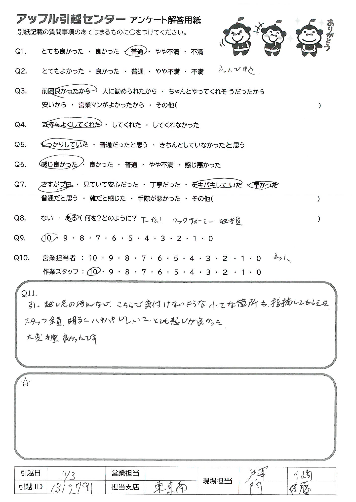 A.応対もきちんとしていてとても好印象でした。 物を雑に扱うことなどは全くなく、丁寧ながらもスピーディで見ていても安心感がありました。予定外の荷物も嫌な顔ひとつ見せずに運んでくださり、運ぶ物の位置なども親切に確認してくださったり、気配りを感じたのでまた利用したいなと思いました。知人にもオススメしたいです。