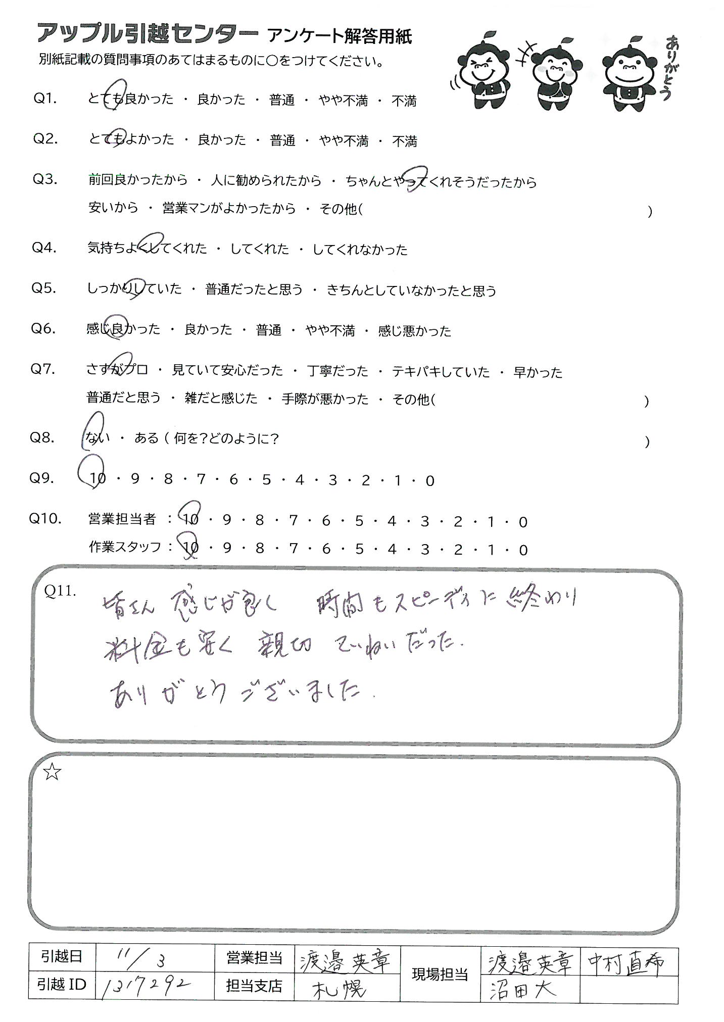 引越し日:2021年11月03日 エリア:北海道札幌市白石区