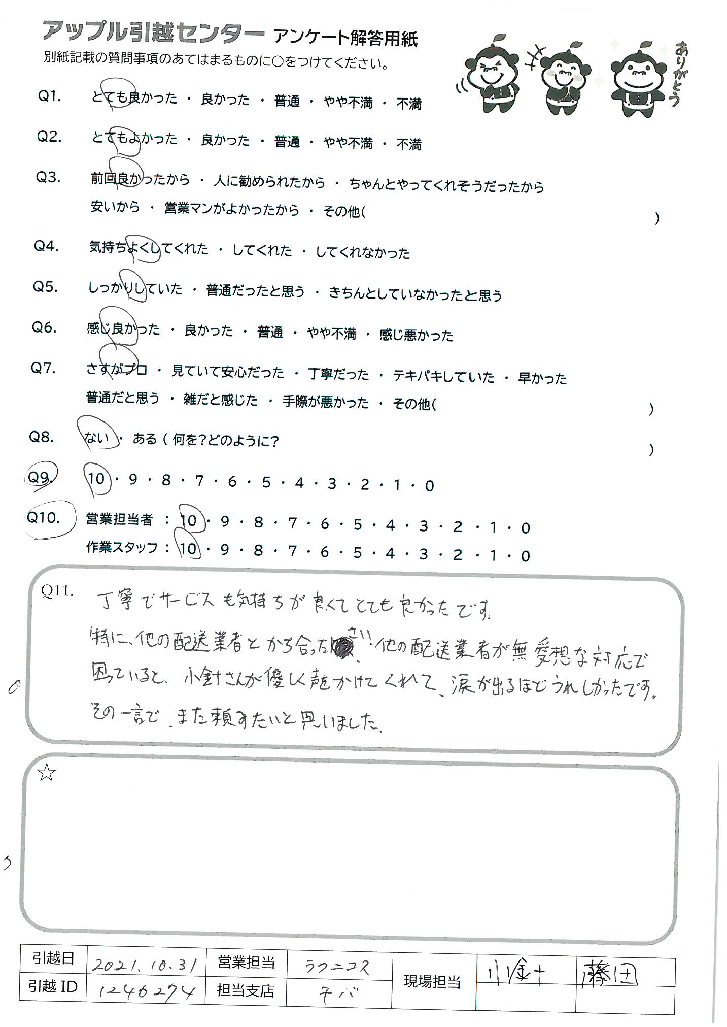 A.丁寧でサービスも気持ちが良くてとても良かったです。 特に、他の配送業者とかち合ったさい、他の配送業者が無愛想な対応で、困っていると、小針さんが優しく声をかけてくれて、涙が出るほどうれしかったです。 その一言で、また頼みたいと思いました。