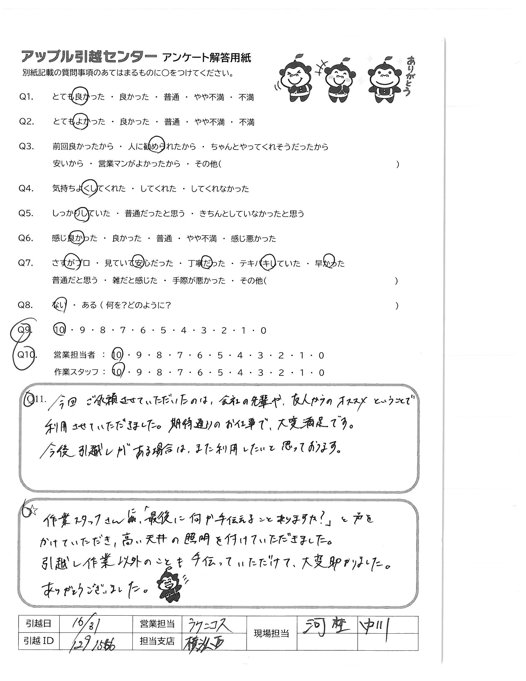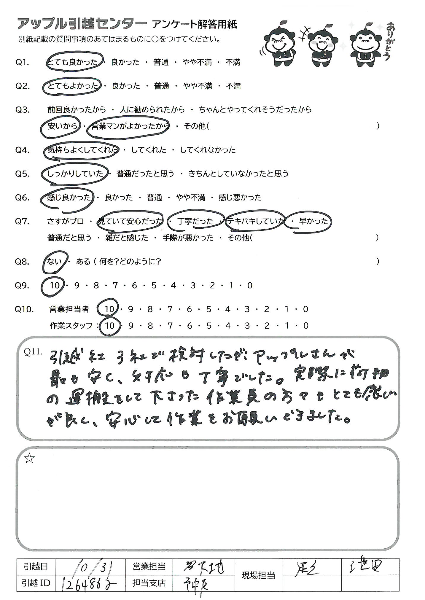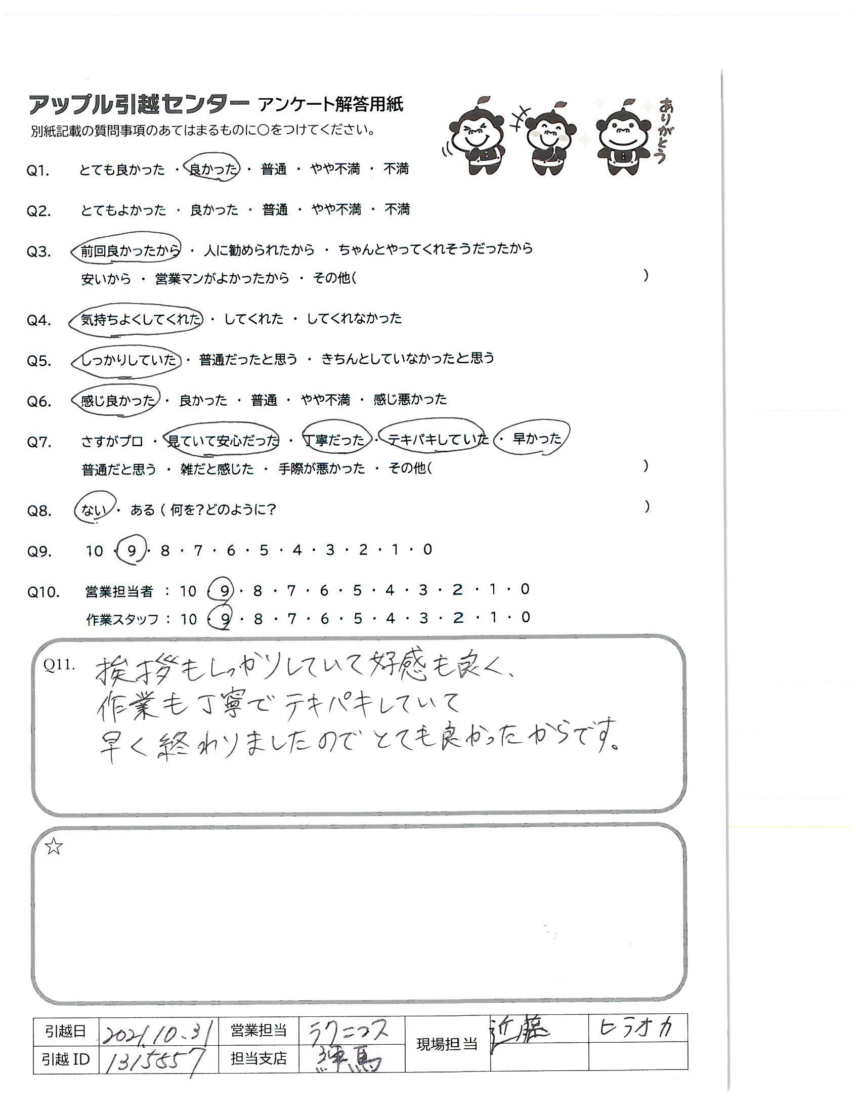 A.引越社3社で検討したが、アップルさんが最も安く、対応も丁寧でした。実際に荷物の運搬をして下さった作業員の方々もとても感じが良く、安心して作業をお願いできました。