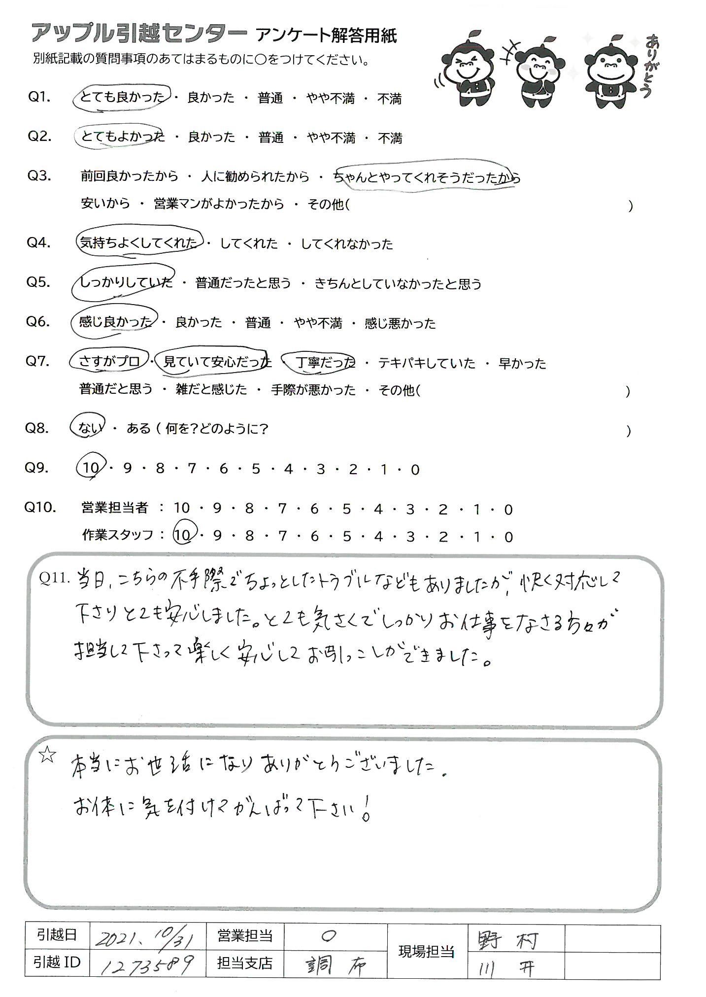 A.当日、こちらの不手際でちょっとしたトラブルなどもありましたが、快く対応して下さりとても安心しました。とても気さくでしっかりお仕事をなさる方々が担当して下さって楽しく安心してお引っこしができました。