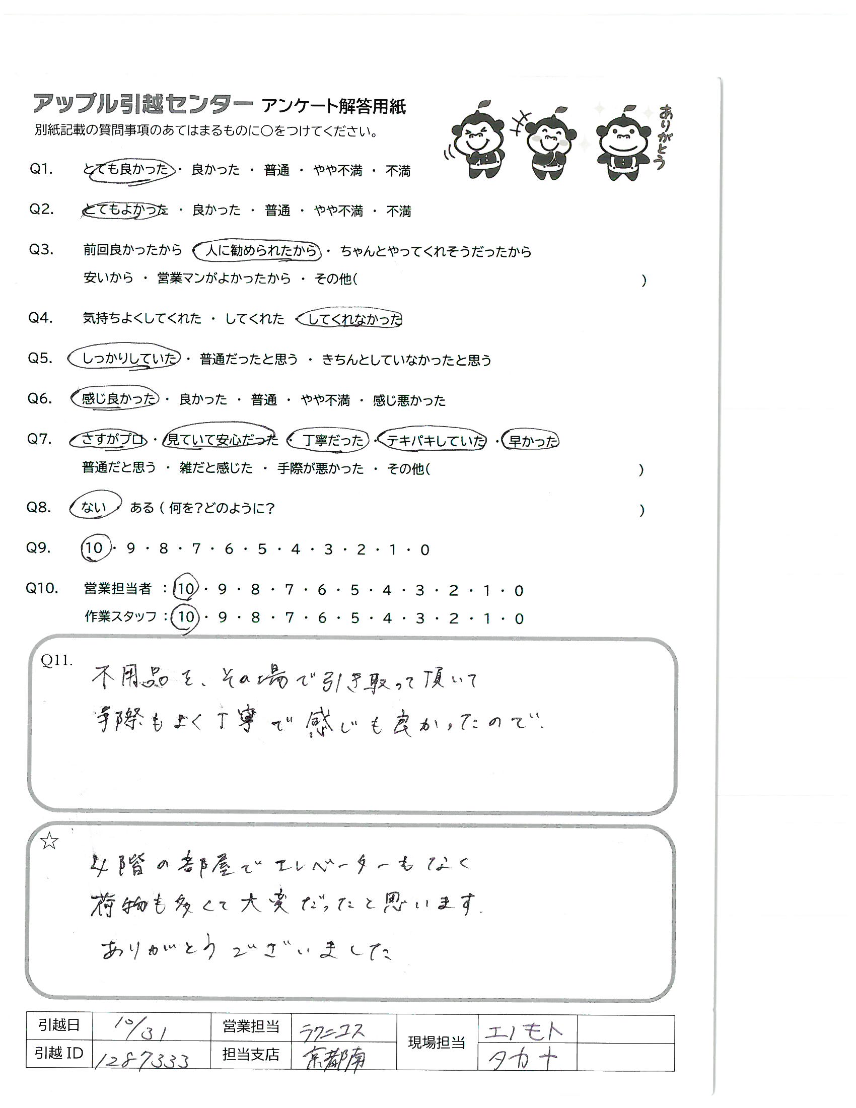 A.不用品をその場で引き取って頂いて 手際もよく丁寧で感じも良かったので。