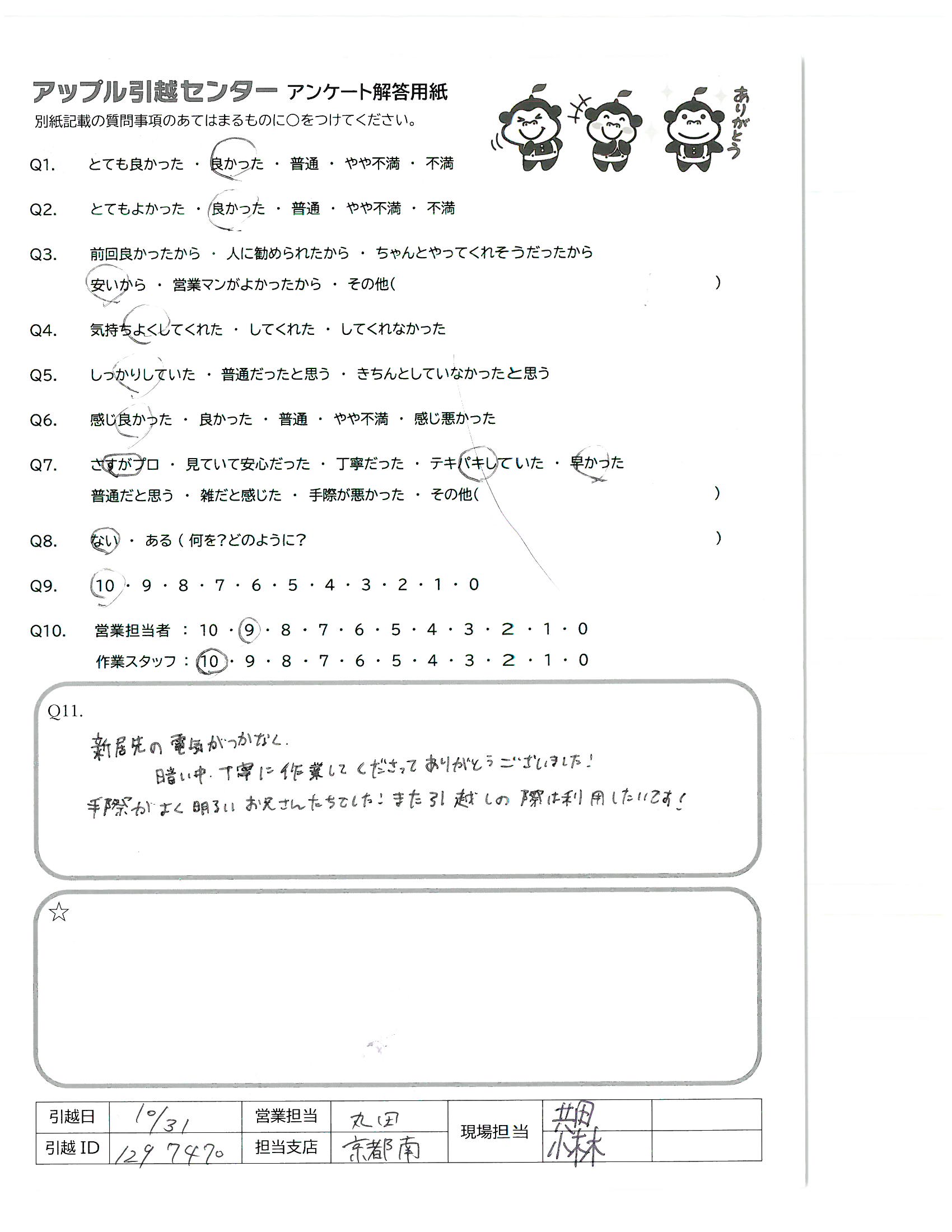 A.新居先の電気がつかなく、 暗い中丁寧に作業してくださってありがとうございました! 手際がよく明るいお兄さんたちでした!また引越しの際は利用したいです!