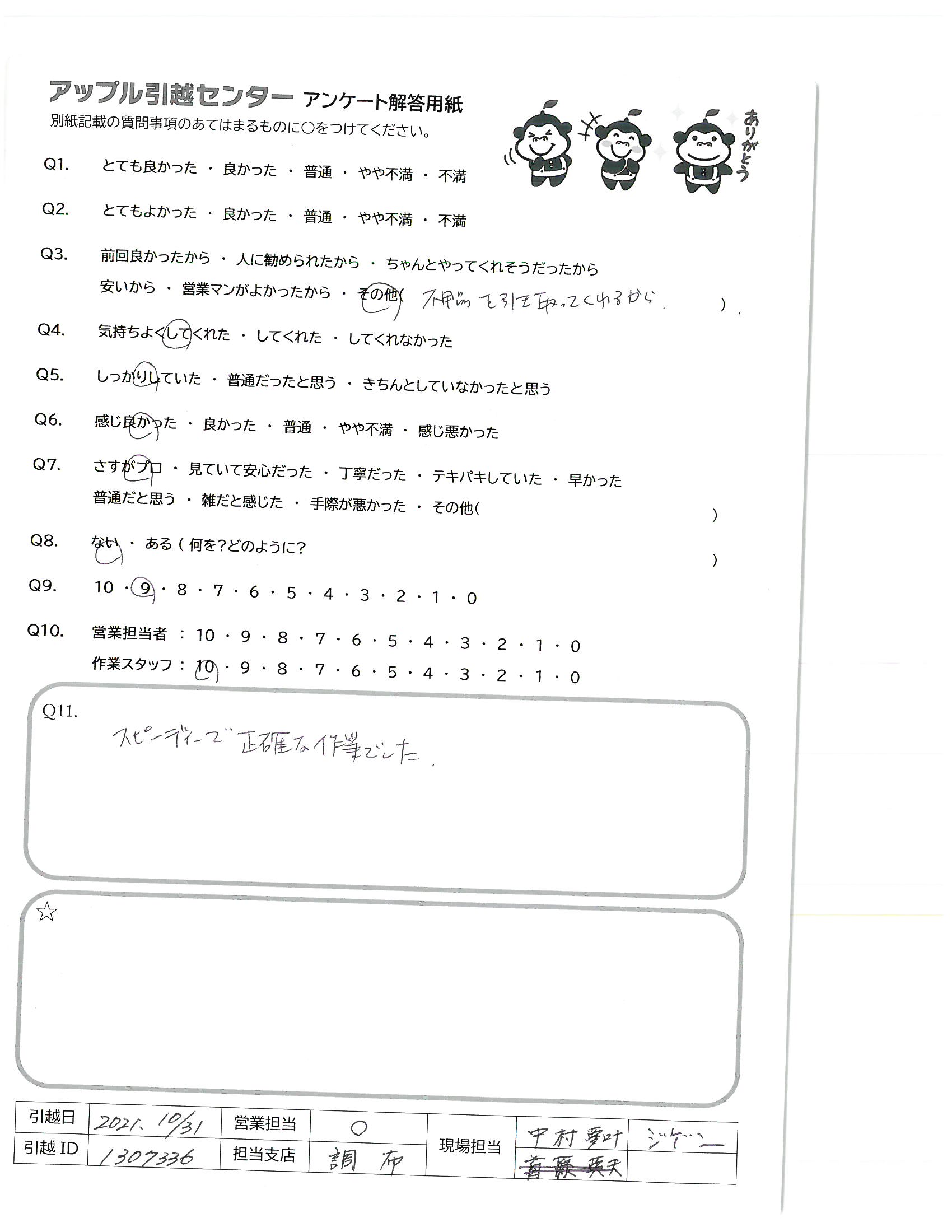 引越し日:2021年10月31日 エリア:愛知県名古屋市西区