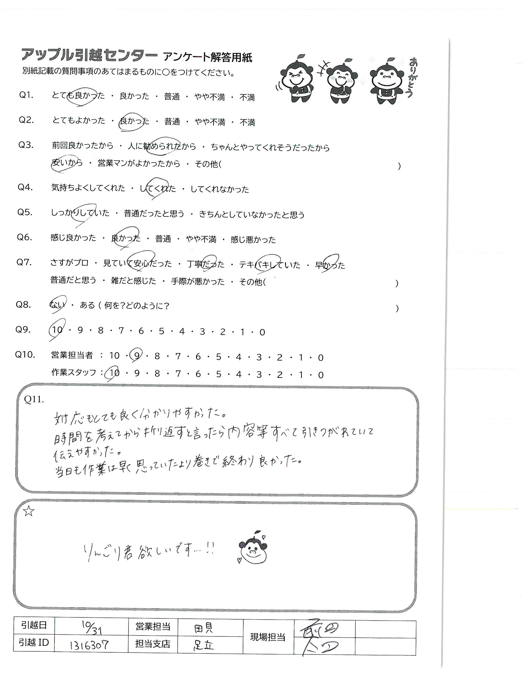 A.みなさん感じが良く、てきぱきと作業を進めて下さり大変助かりました。何回も利用しているのですが、毎回大満足なので安心して他人にも薦められます!雨の中でも迅速に丁寧な対応をして下さり、本当にありがとうございました!!