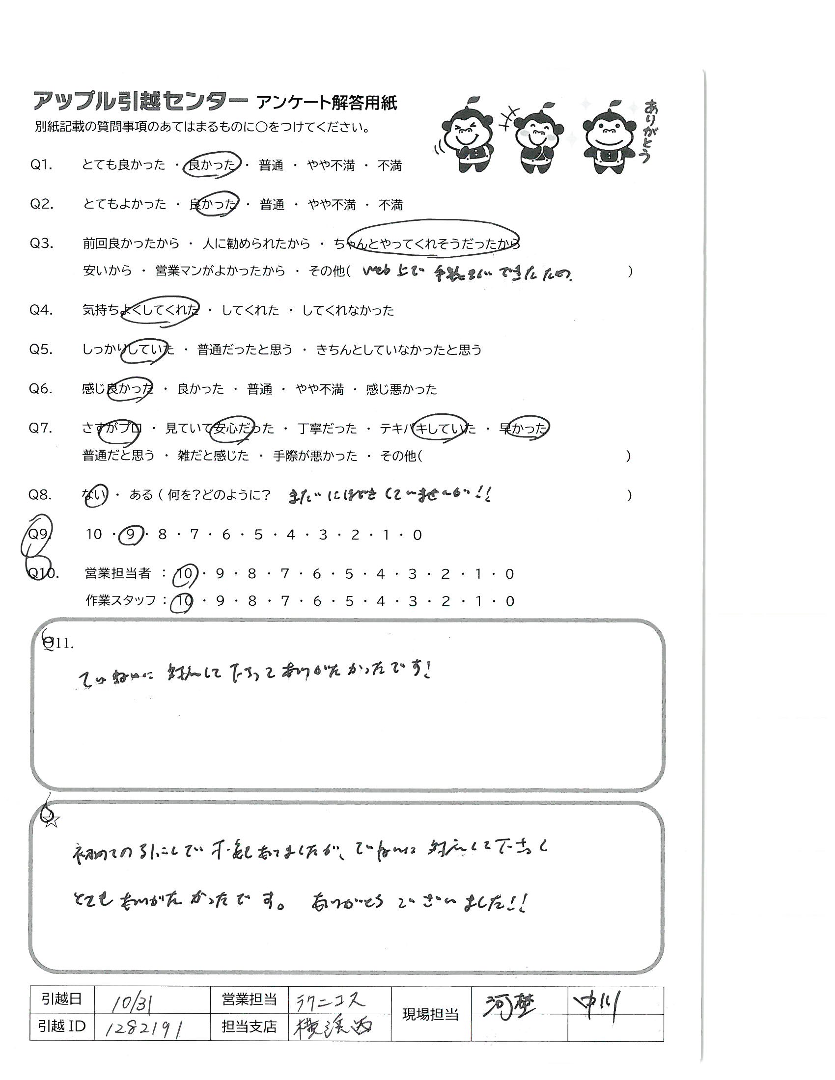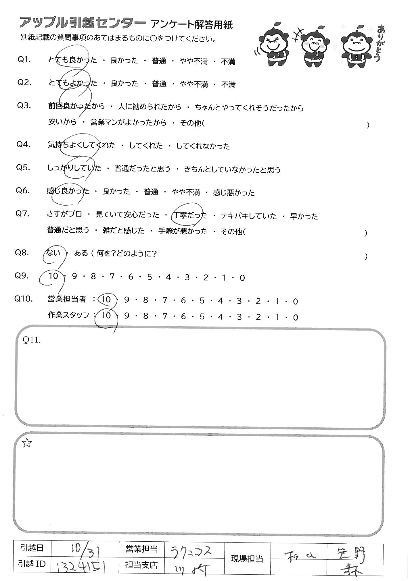 A.今回もとてもしっかりやっていただきありがとうございました。 作業してくださった御三方の連携がとても素晴らしく、おかげさまでスムーズに引っ越しができました。 いつかまた引越しする際には、ぜひまたアップル引越センターさんにお願いしたいです。