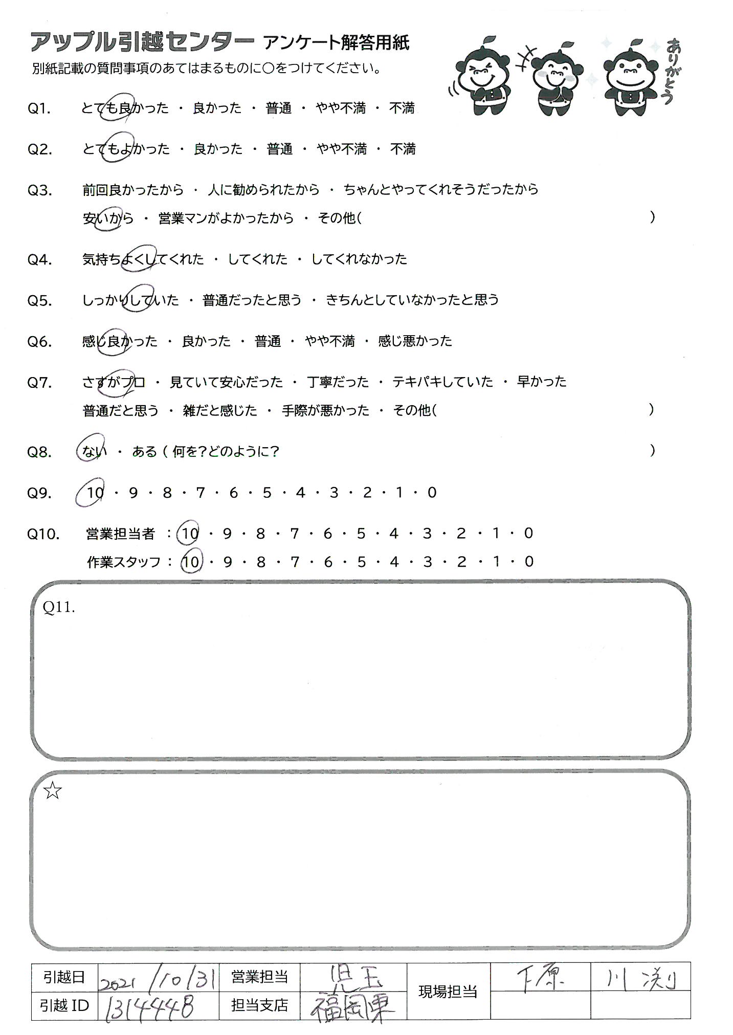 引越し日:2021年10月31日 エリア:福岡県筑紫野市