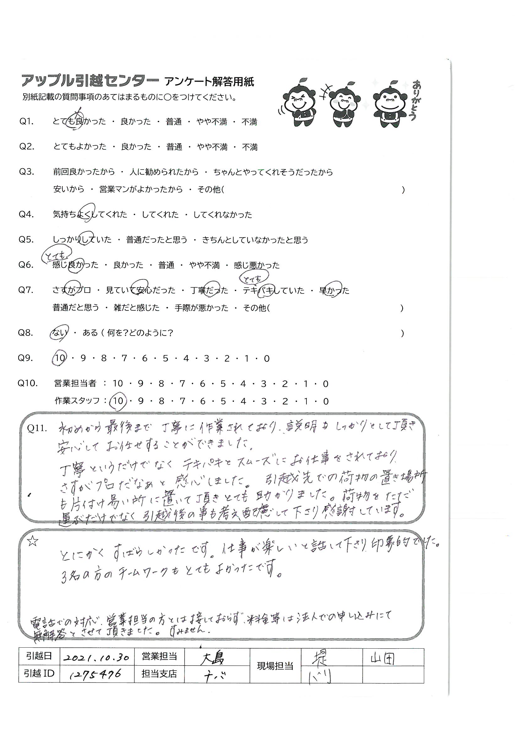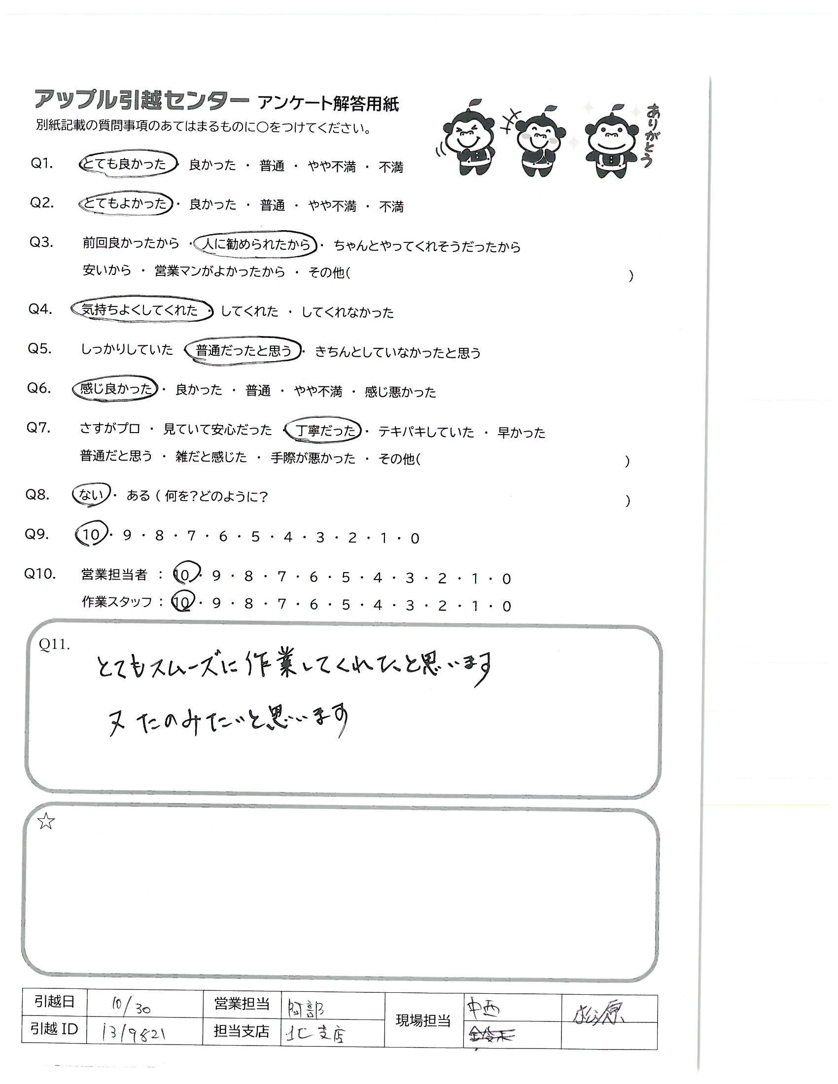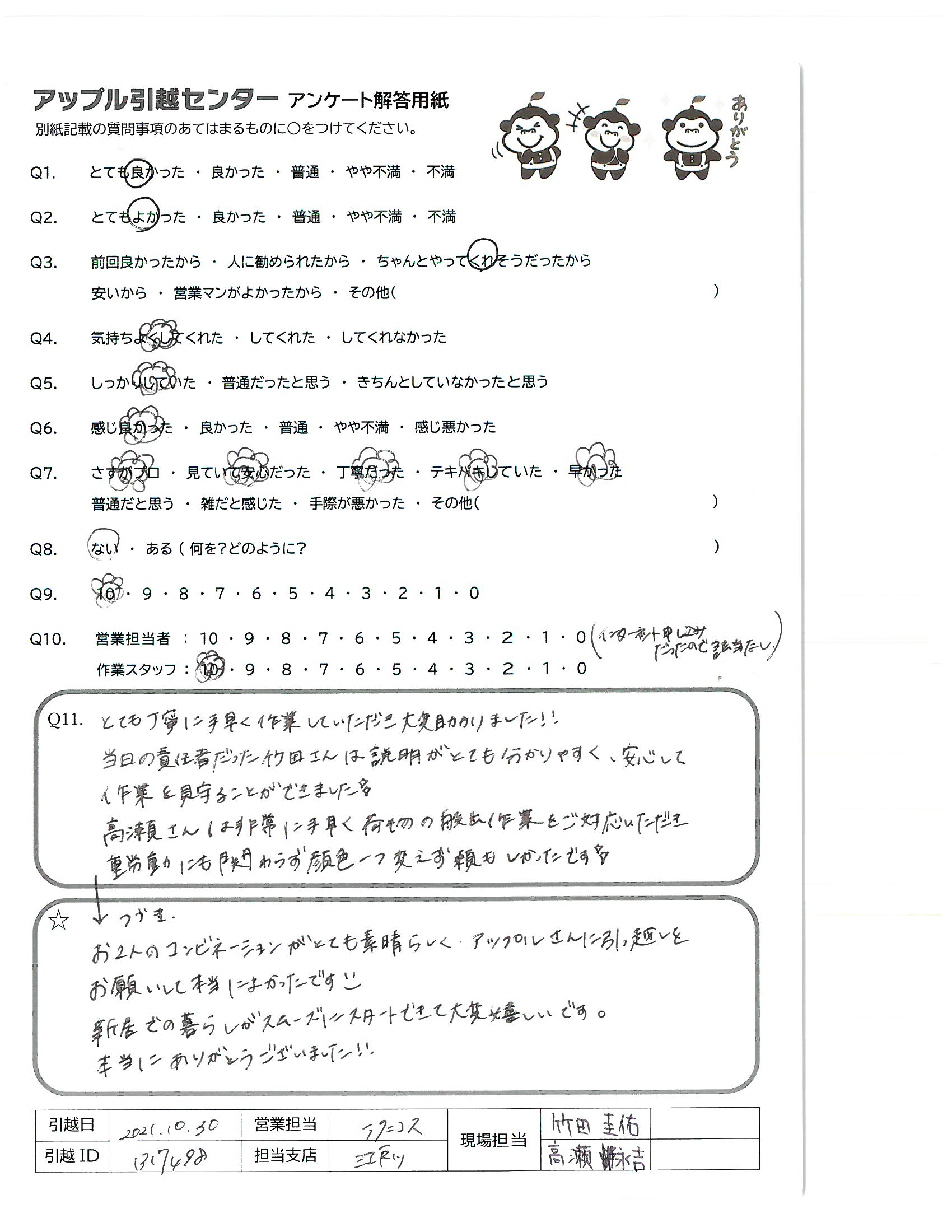 A.お2人のコンビネーションがとても素晴らしくアップルさんに引っ越しをお願いして本当によかったです 新居での暮らしがスムーズにスタートできて大変嬉しいです。 本当にありがとうございました!!