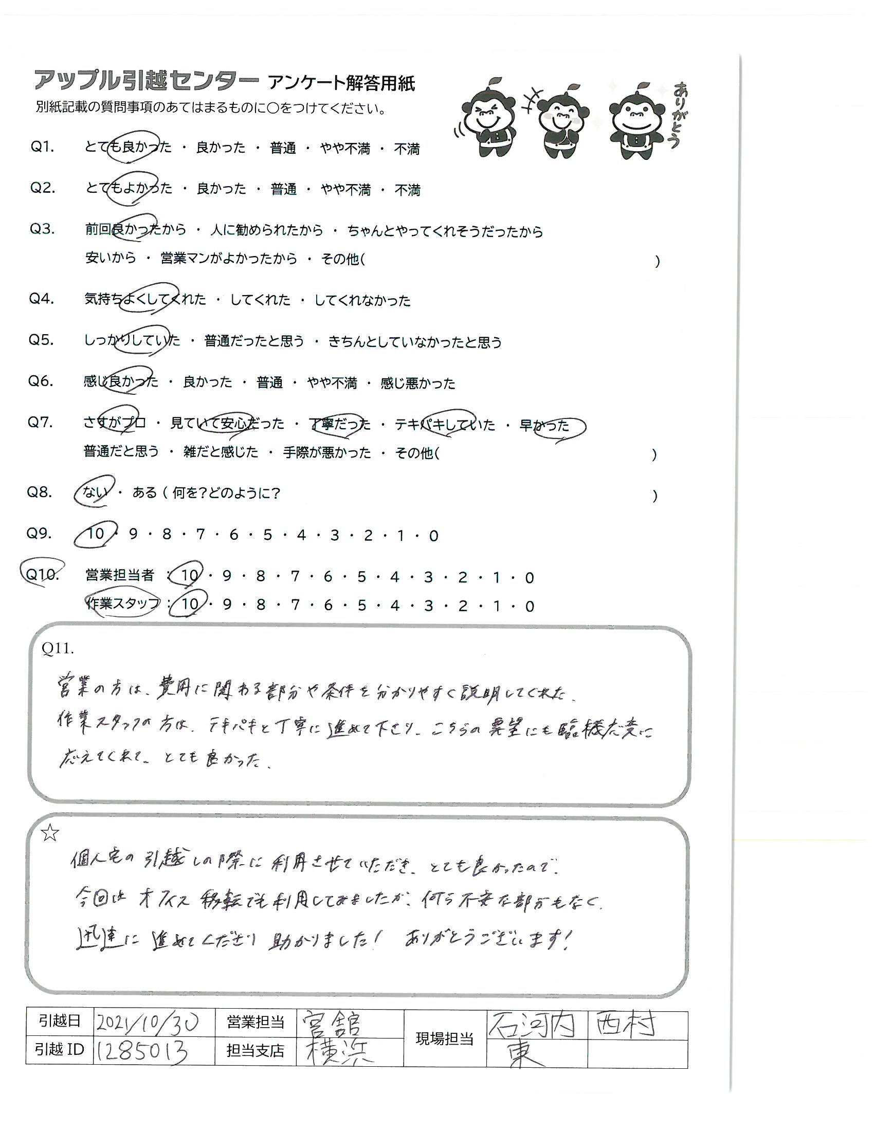 引越し日:2021年10月30日 エリア:神奈川県横浜市鶴見区