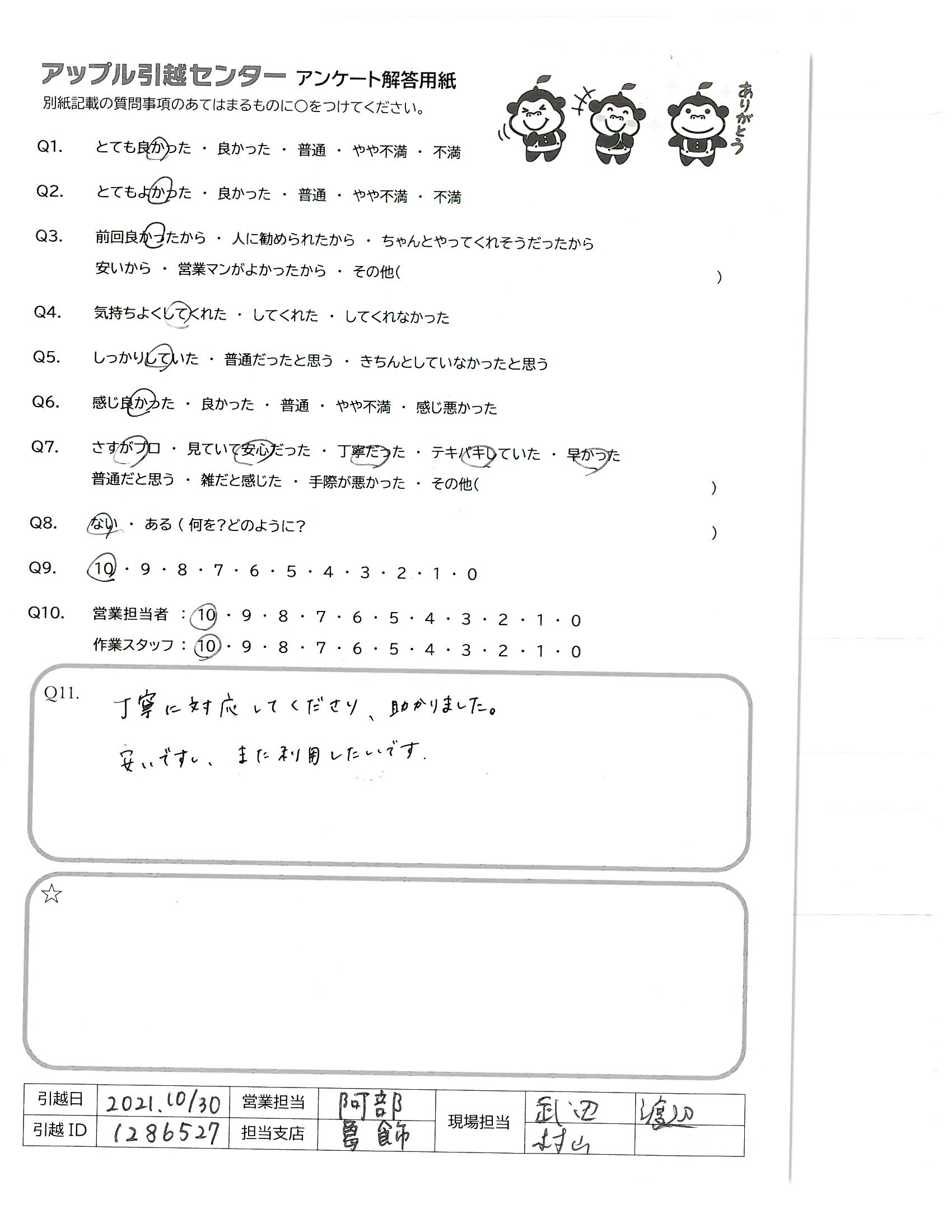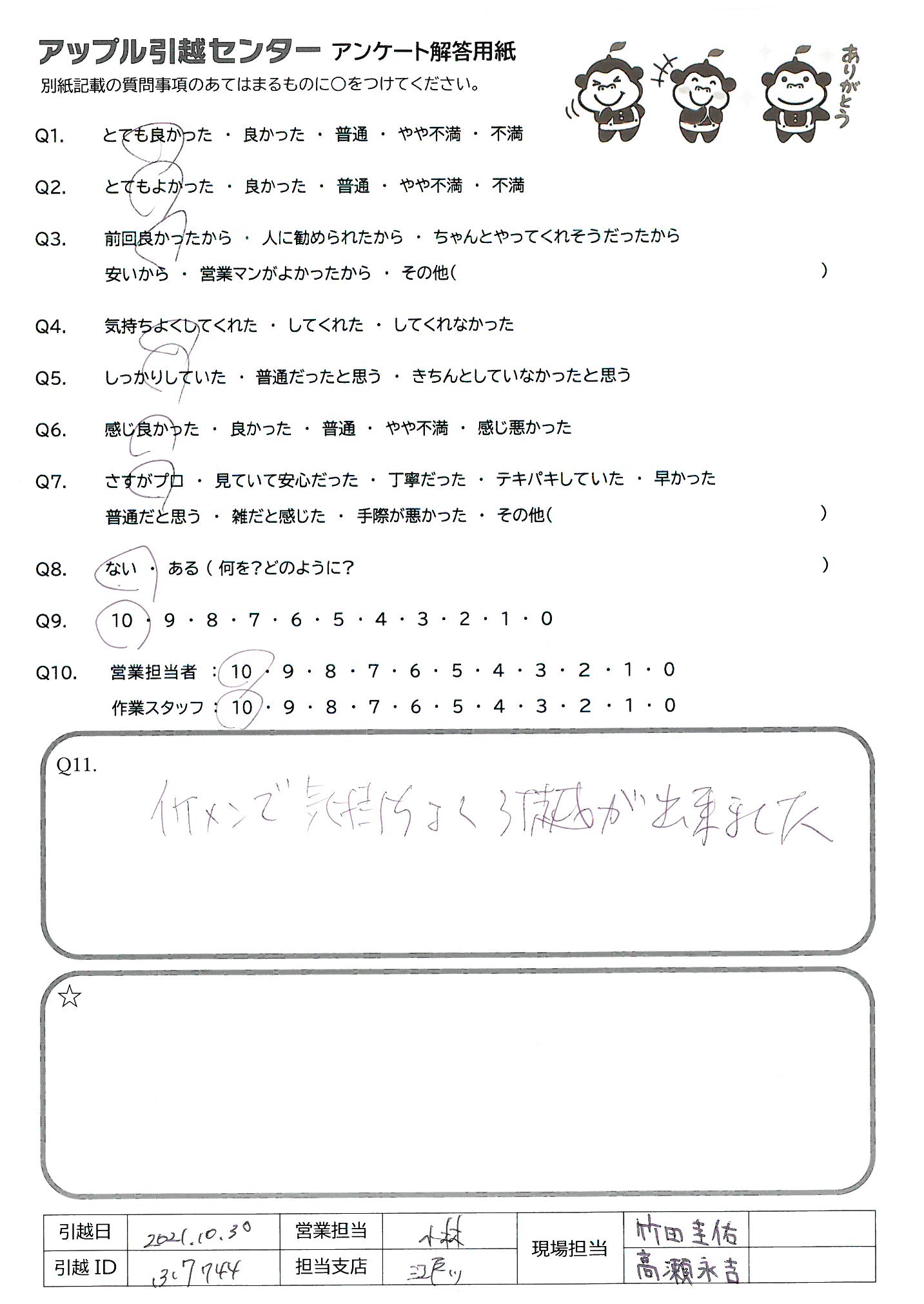 A.この度はご対応頂きありがとうございました!武政様がお怪我をされたとの事でしたが、大丈夫でしたでしょうか?増井様がおひとりでも丁寧かつ迅速にご対応頂き、大変満足のいく引越しとなりました。また引越しする機会があればアップルさんにお願いしたいと思います。 ありがとうございました!