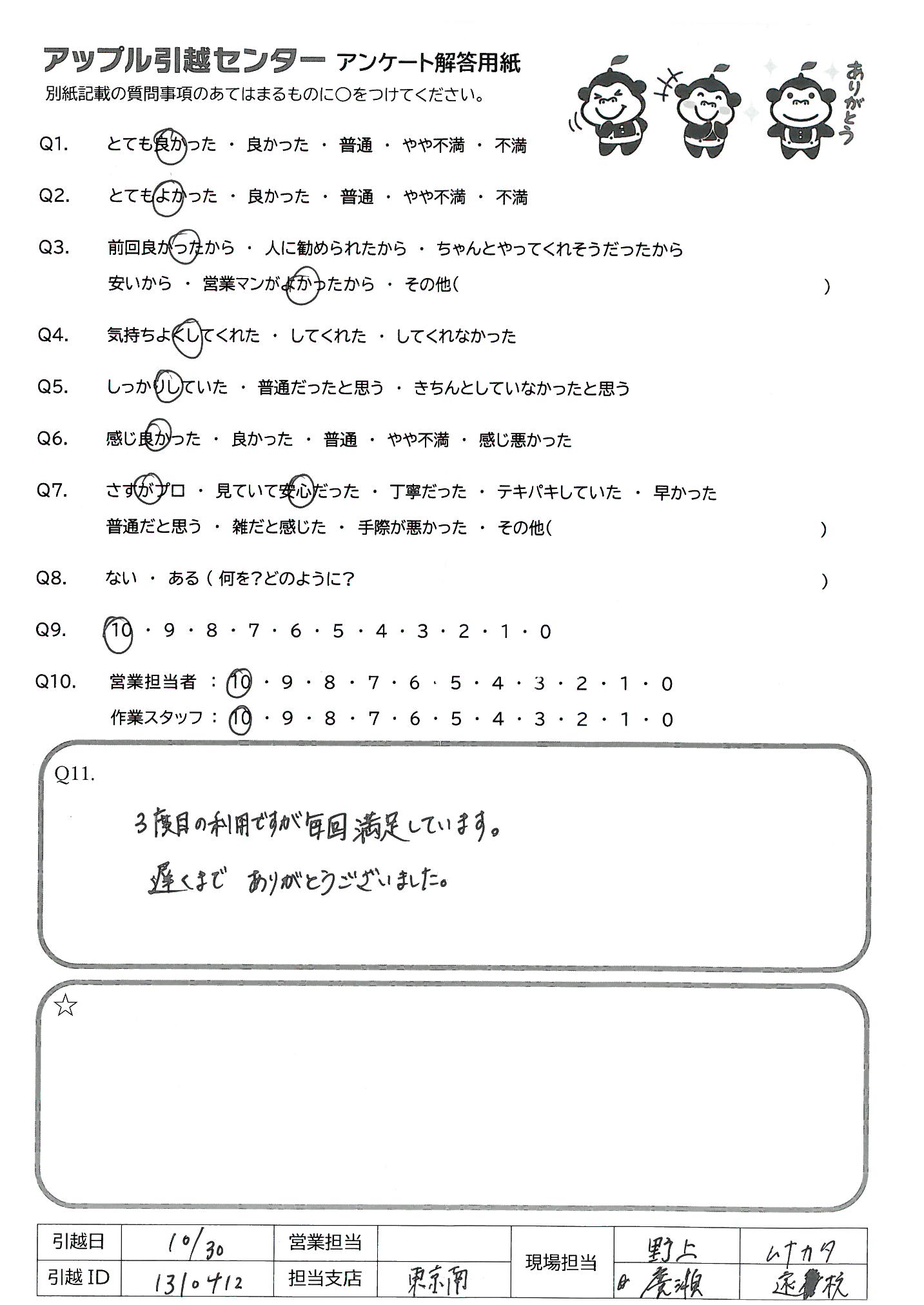 A.利用3度目です。素晴らしい引越し屋さんだと思います。 東山さん、ありがとうございました!!