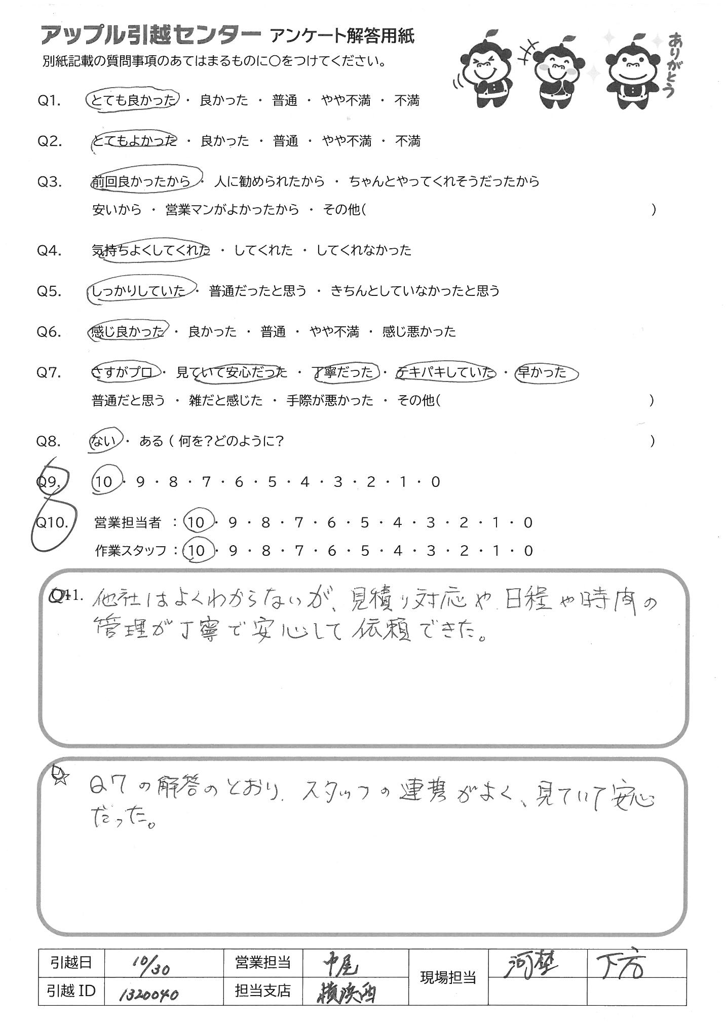 A.引っ越しというイレギュラーな場面で、こちらも色々と緊張し、疲れている中で、気持ちの良い対応及び作業をしていただきました。 どうもありがとうございました。