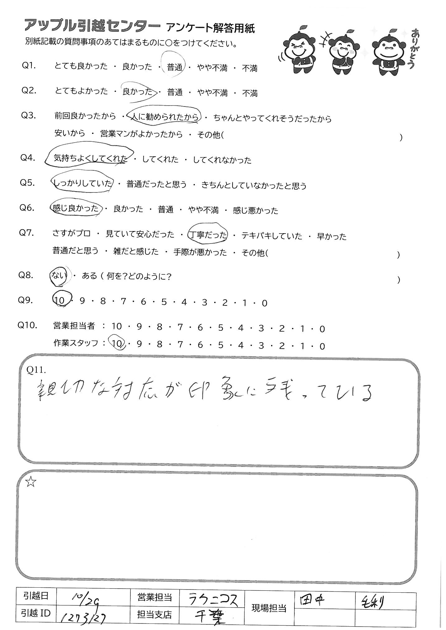 A.気持ちよく対応してくださったため。 今回担当頂いた作業スタッフの方は過去数回引越しをした中でもトップクラスの感じの良さ、手際の良さだったと感じたため。 新居でもただ早く終わらせるだけでなく、その後の開封のことまで考えてダンボールをおいて下さったことには特に感動しました。