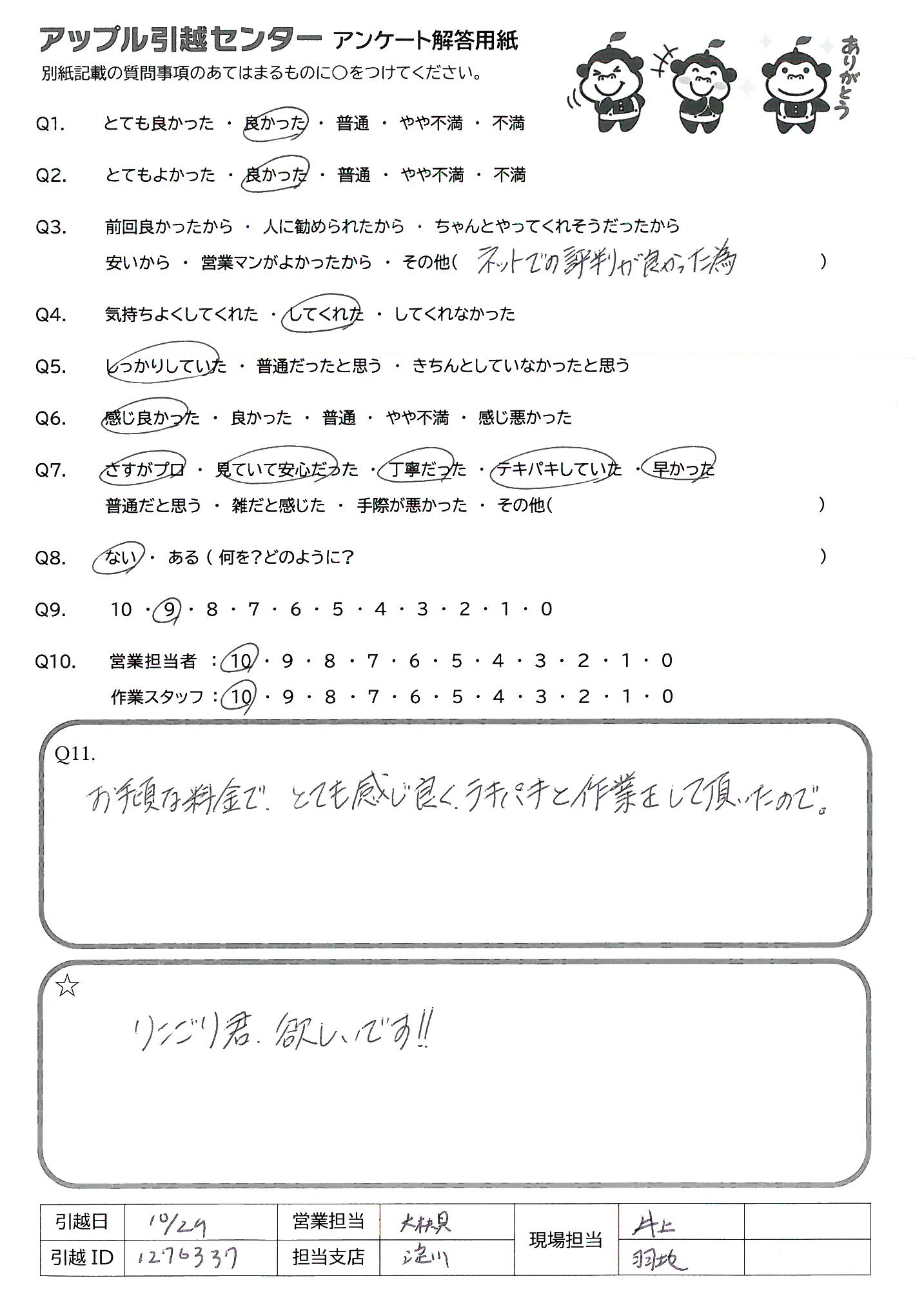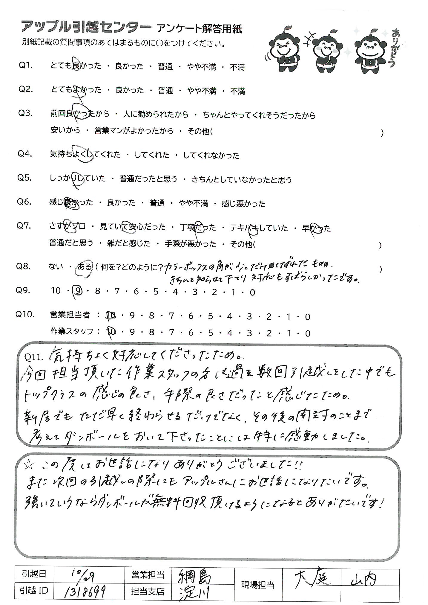 A.この度はお世話になりありがとうございました!! また次回の引越しの際にもアップルさんにお世話になりたいです。 強いていうならダンボールが無料回収頂けるようになるとありがたいです!