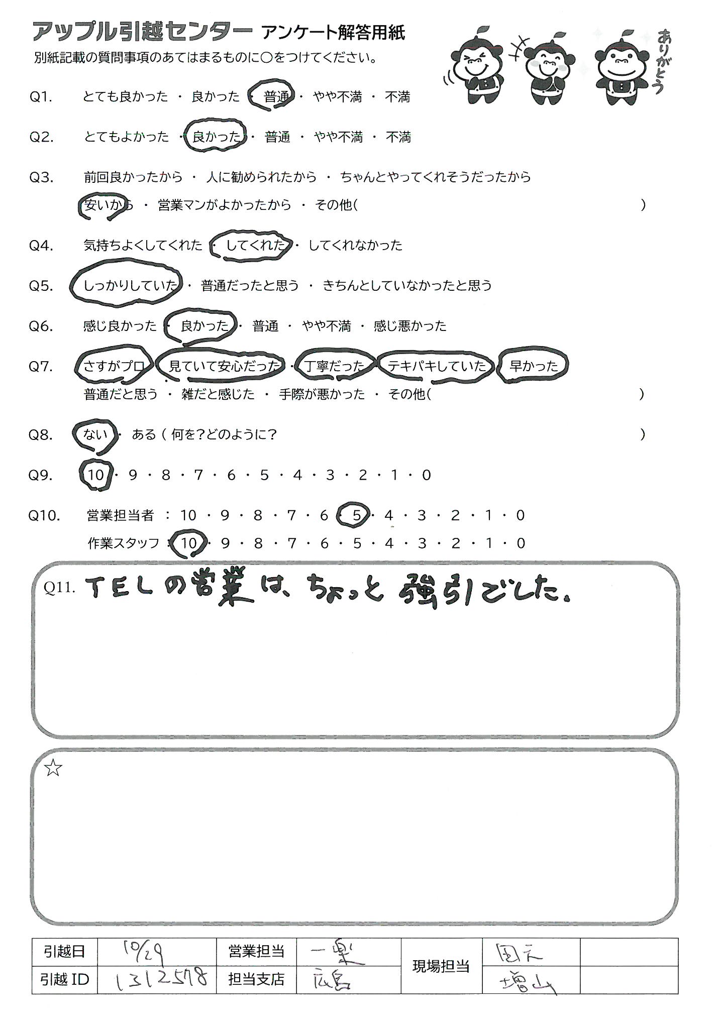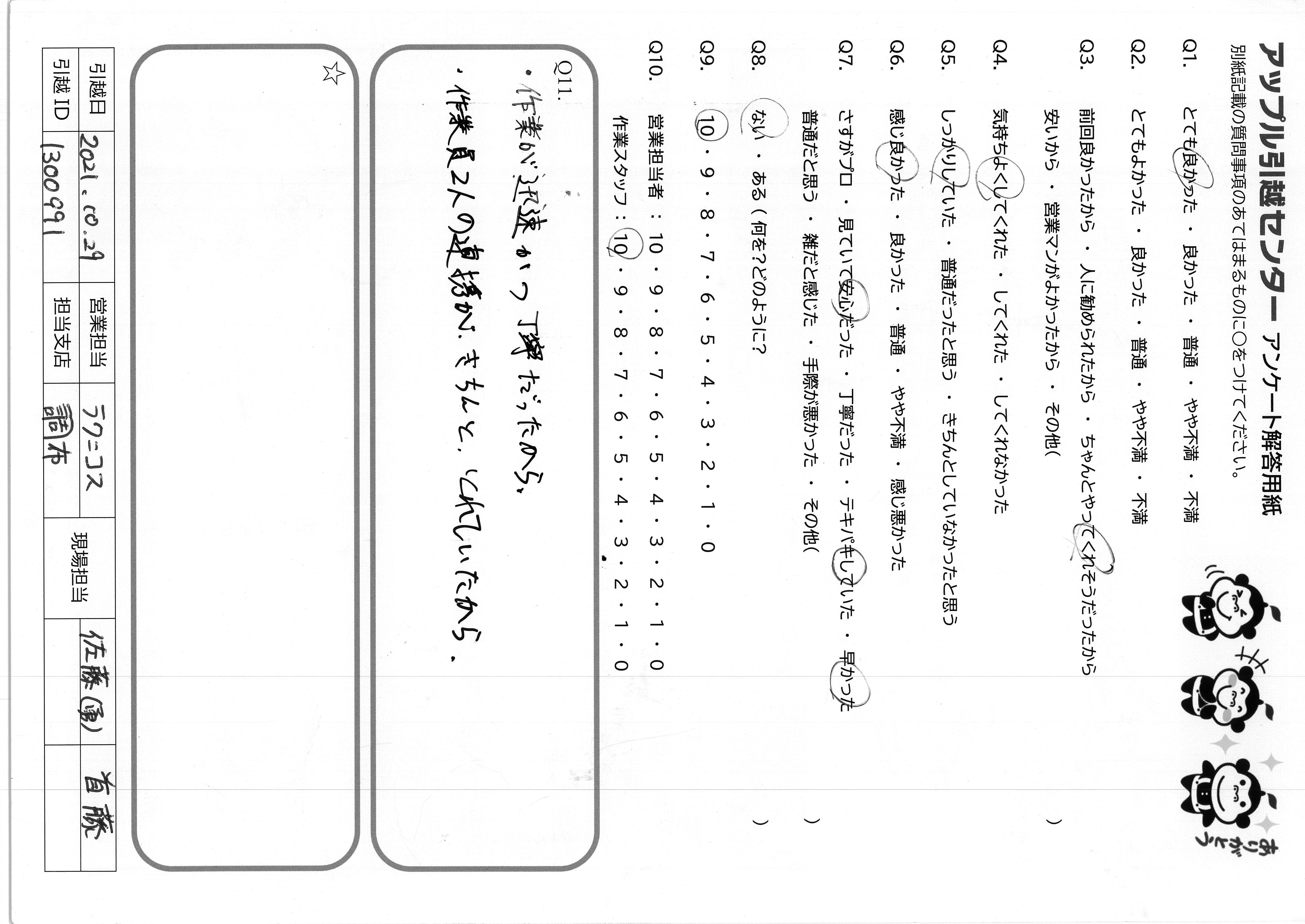 A.引越し作業中元々壊れていたベッドの修理案と方法を教えて下さり、後日修理出来たので作業が居でも大変助りました。 引越し先の地域に知人友人がおらず遠方のみなので作業してくれた小針さんか宇井さんにもお伝えしたが、中々薦めるのが難しく申し訳ありません。自分達がまた引越す時はぜひお願いしたいです。営業?(電話対応)してくれたこやまさんも感じがよく気持ちよくお話し出来、事を進めてくれたので次回もお願いしたい。