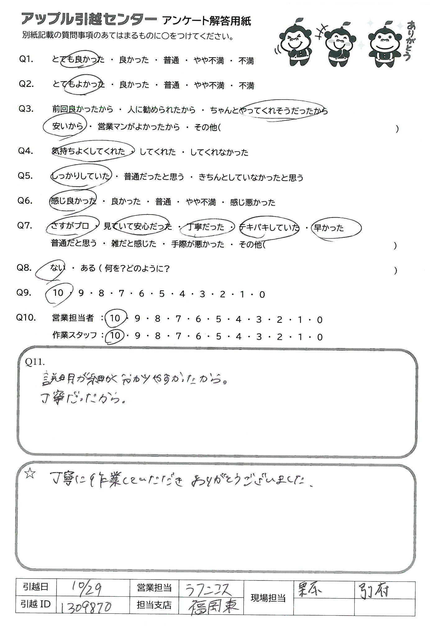 引越し日:2021年10月29日 エリア:福岡県福岡市東区