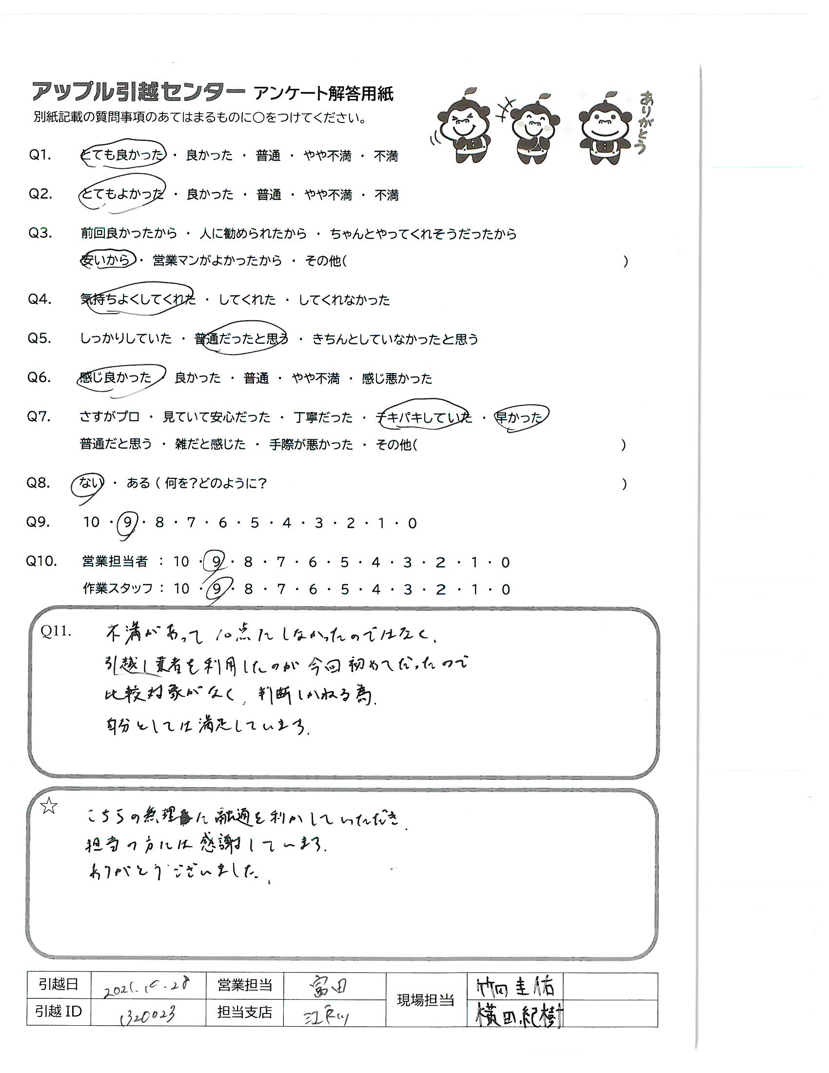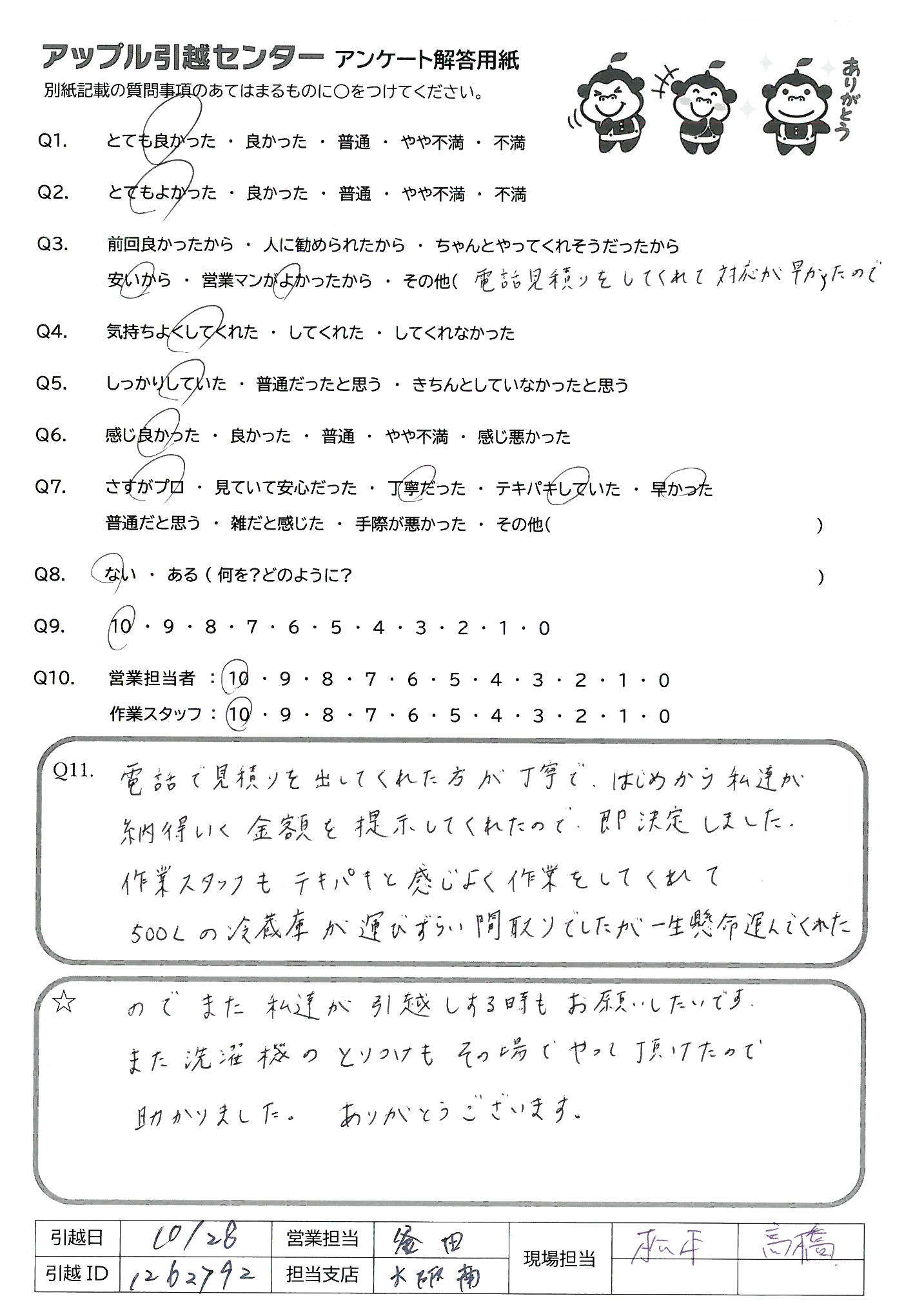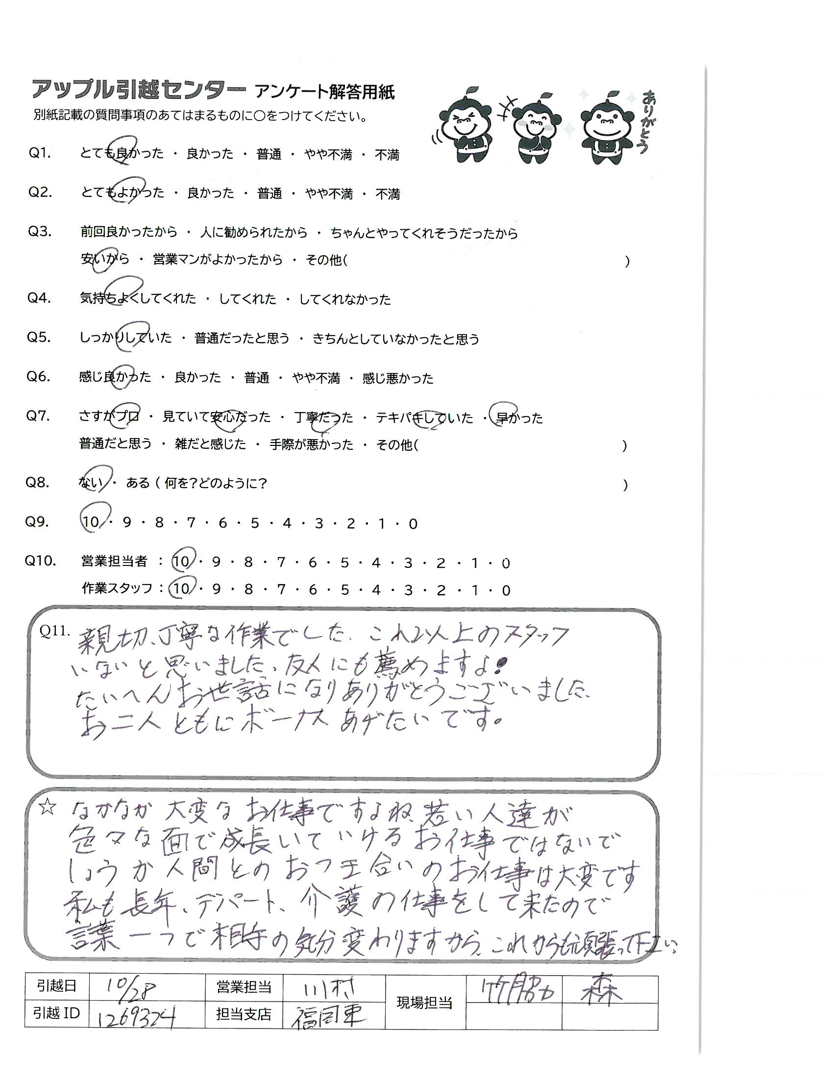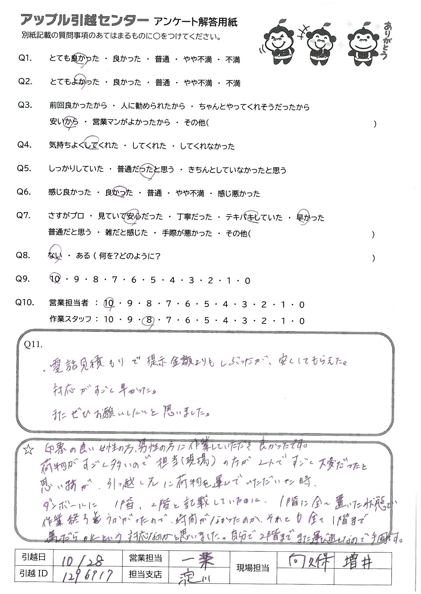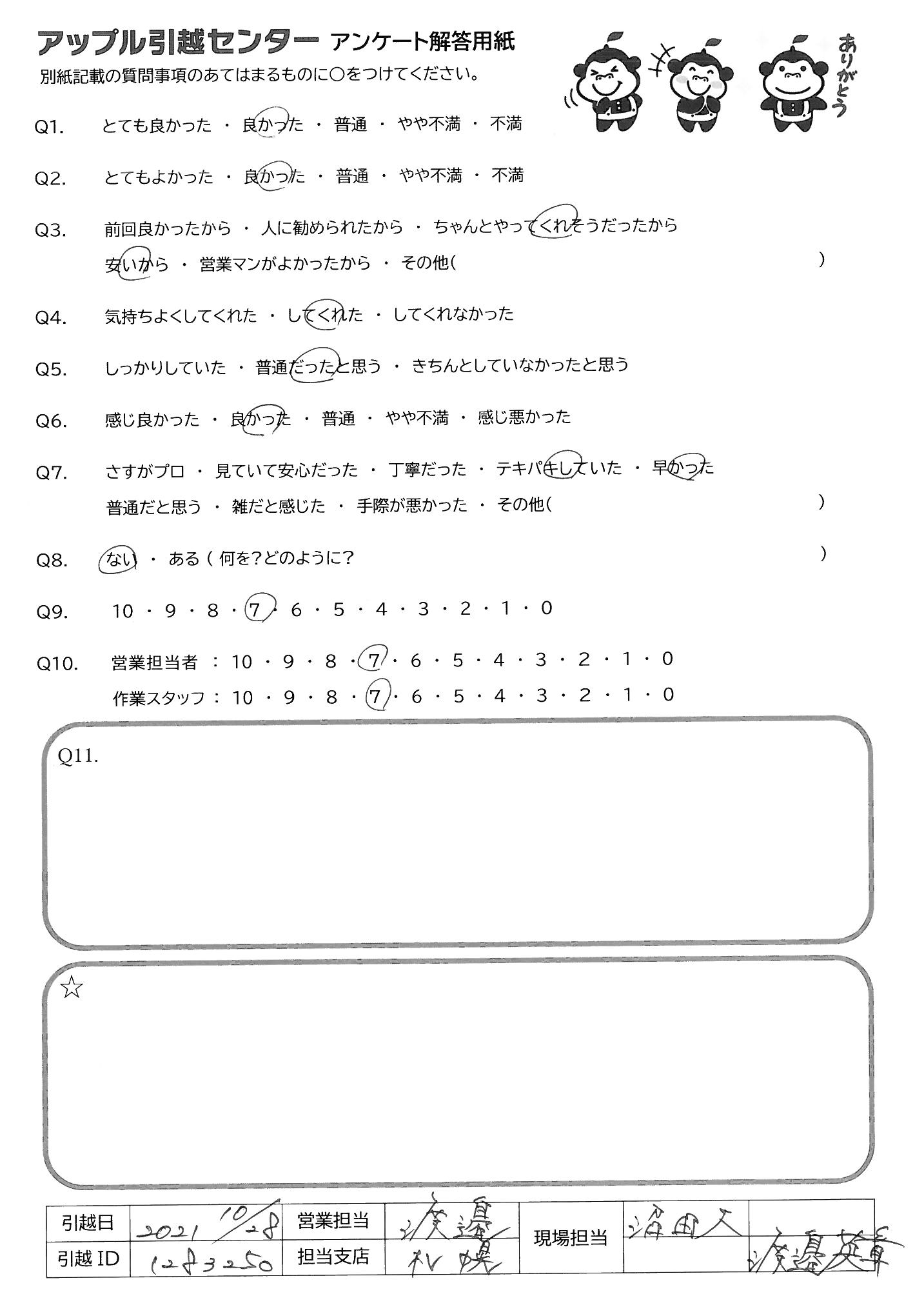 A.10/28 9:30からの引越でした。約3時間で終了、あっという間でした。「あと2件の引越です」笑顔で言ってました。 重い物を持っての仕事、腰をいためないようにして下さい。 コロナの中での冬仕事、風邪などに注意してくださいませ!!