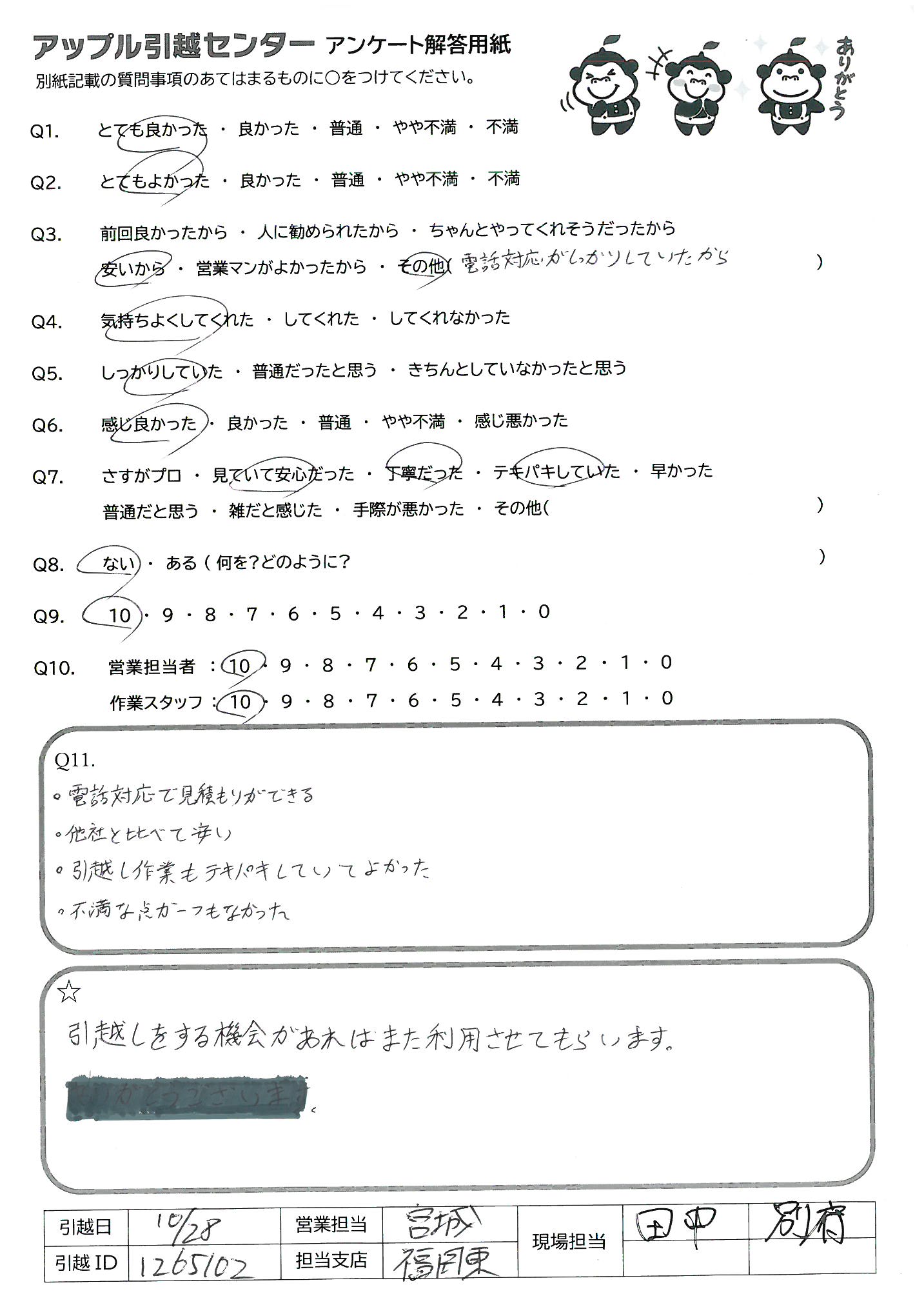 A.今回色んな引っ越し業者に問い合わせをした中でアップルさんのTELでの対応がとても親切で丁寧に説明して下さりここなら(アップルさん)安心して引っ越しをお任せできると感じたのが1番の決め手でした。又機会があればお願いしたいです。
