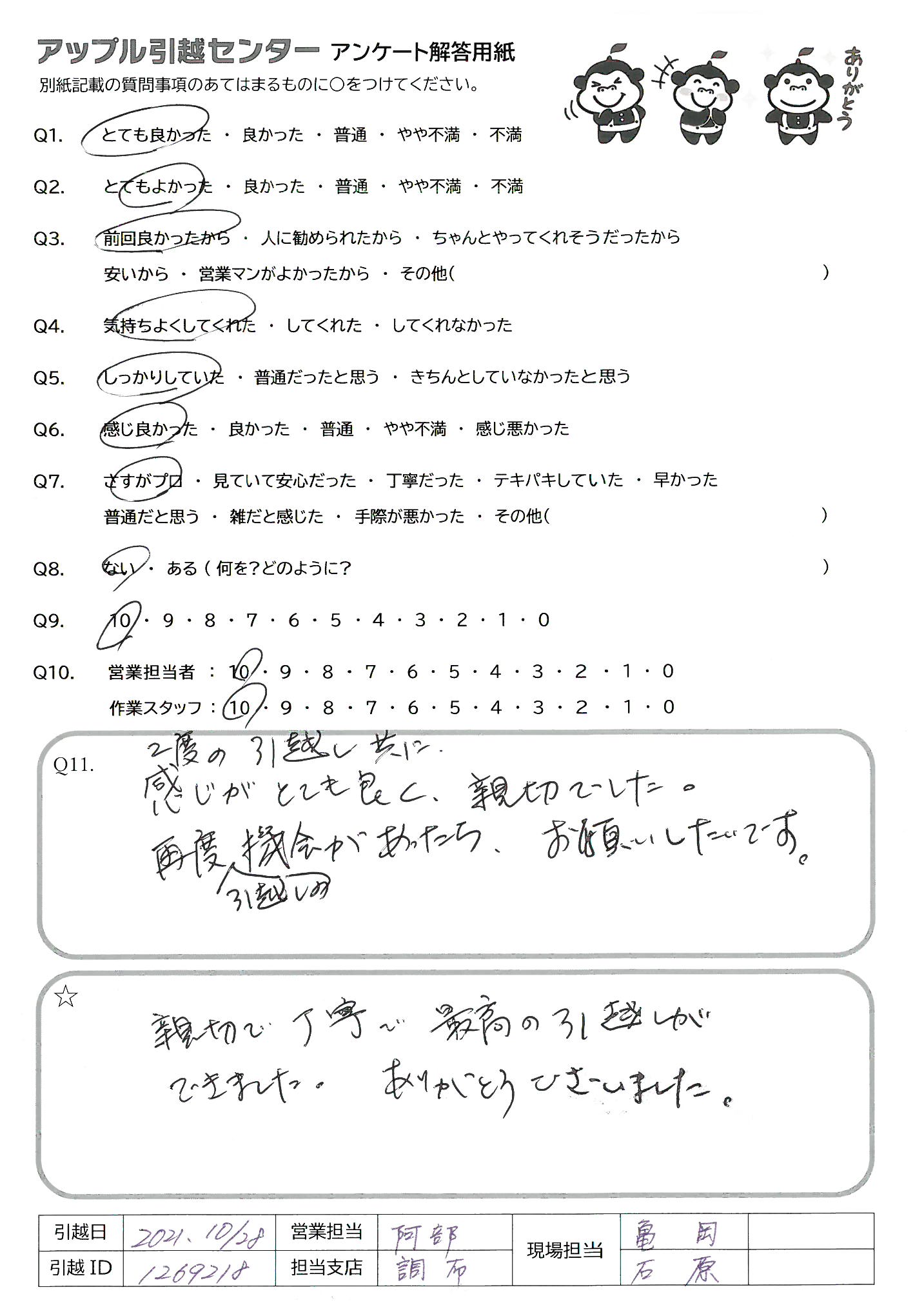 A.2度の引越し共に、感じがとても良く、親切でした。 再度引越しの機会があったら、お願いしたいです。