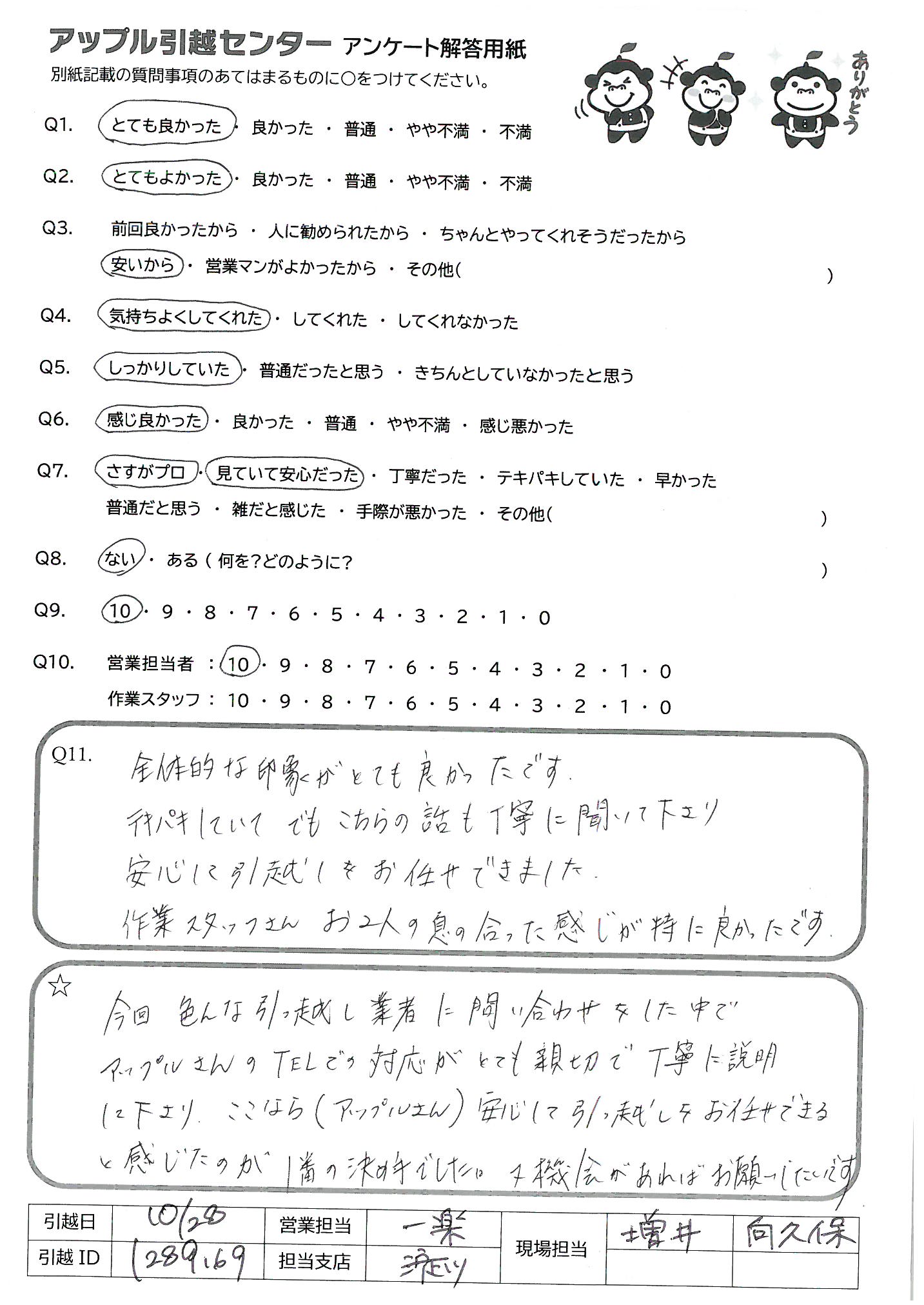 A.引っ越しを4回しているが今回が料金も安いし手際も良かった。 次回があったら又お願いしたい ほかの人にもすすめたい