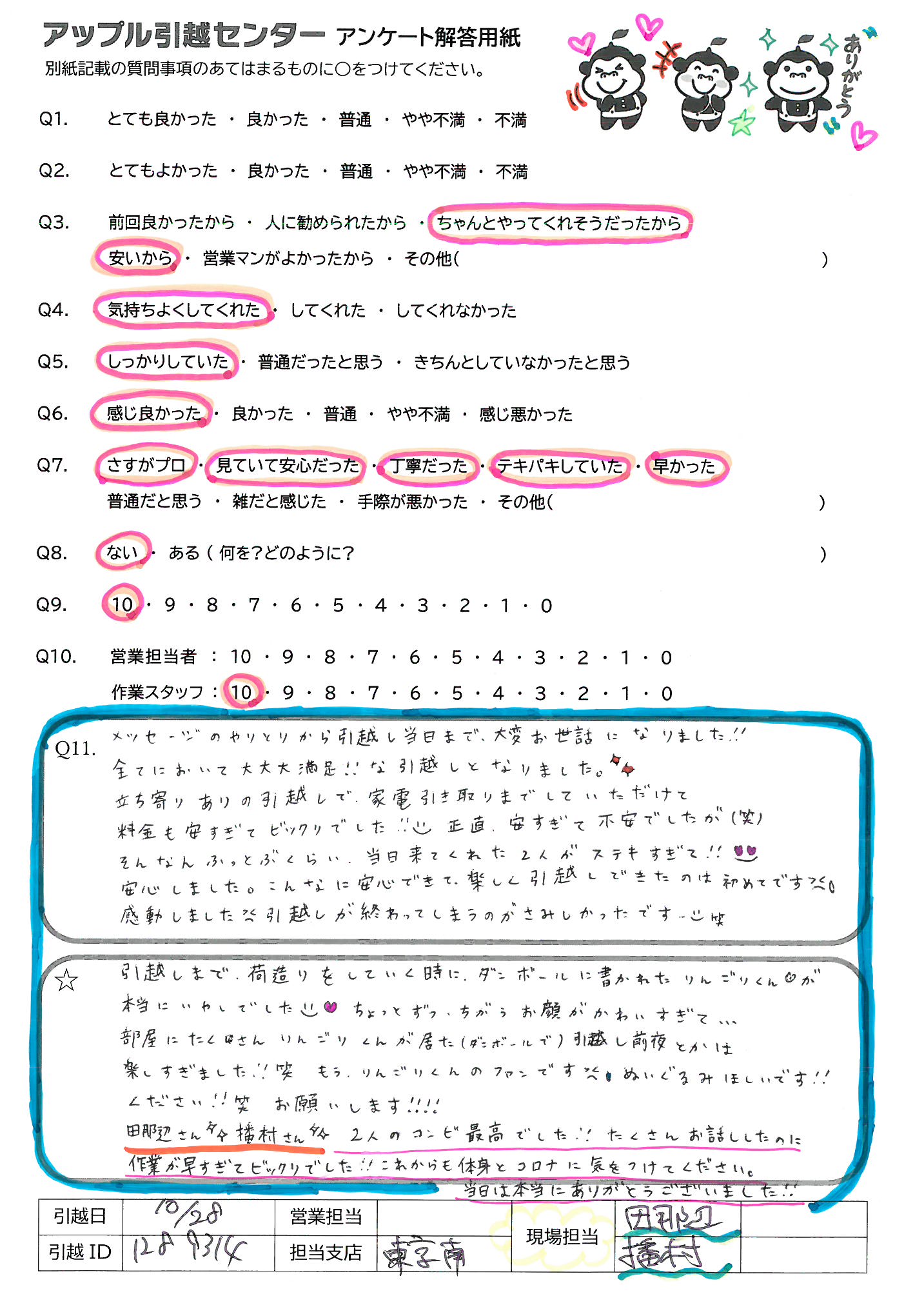A.引越しまで荷造りをしていく時に、ダンボールに書かれたりんごりくんが本当にいやしでした ちょっとずつちがうお顔がかわいすぎて… 部屋にたくさんりんごり君が居た(ダンボールで)引越し前夜とかは楽しすぎました!!笑 もう、りんごりくんのファンです ぬいぐるみほしいです!! ください!!笑 お願いします!!!! 田那辺さん播村さん 2人のコンビ最高でた!!たくさんお話ししたのに作業が早すぎてビックリでした!!これからも体身とコロナに気をつけてください。当日は本当にありがとうございました