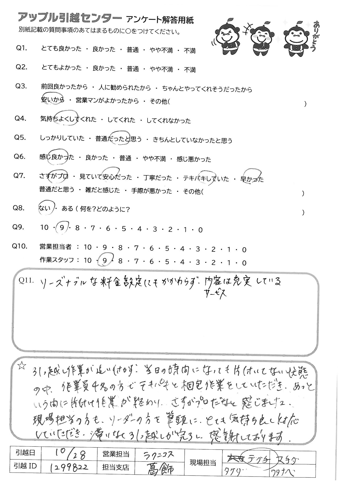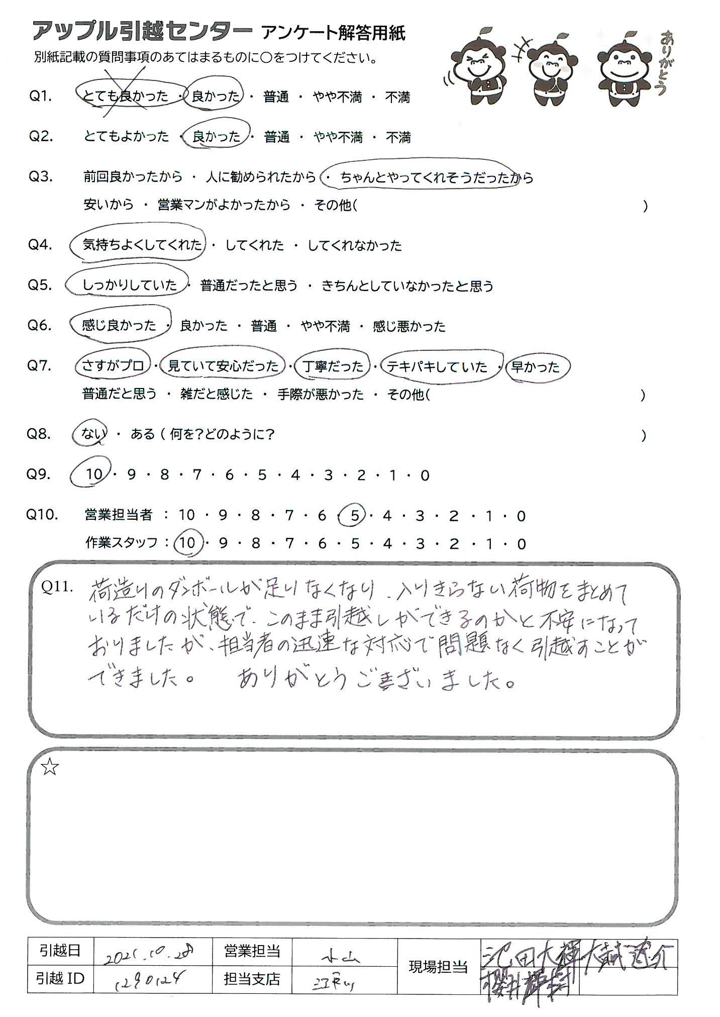 A.引っ越し作業が追い付かず、当日の時間になっても片付いていない状態の中、作業員4名の方でテキパキと梱包作業をしていただき、あっという間に片づけ作業が終わり、さすがプロだなと感じました。現場担当の方も、リーダーの方を筆頭に、とても気持ち良く対応していただき、滞りなく引っ越しが完了し、感謝しております。