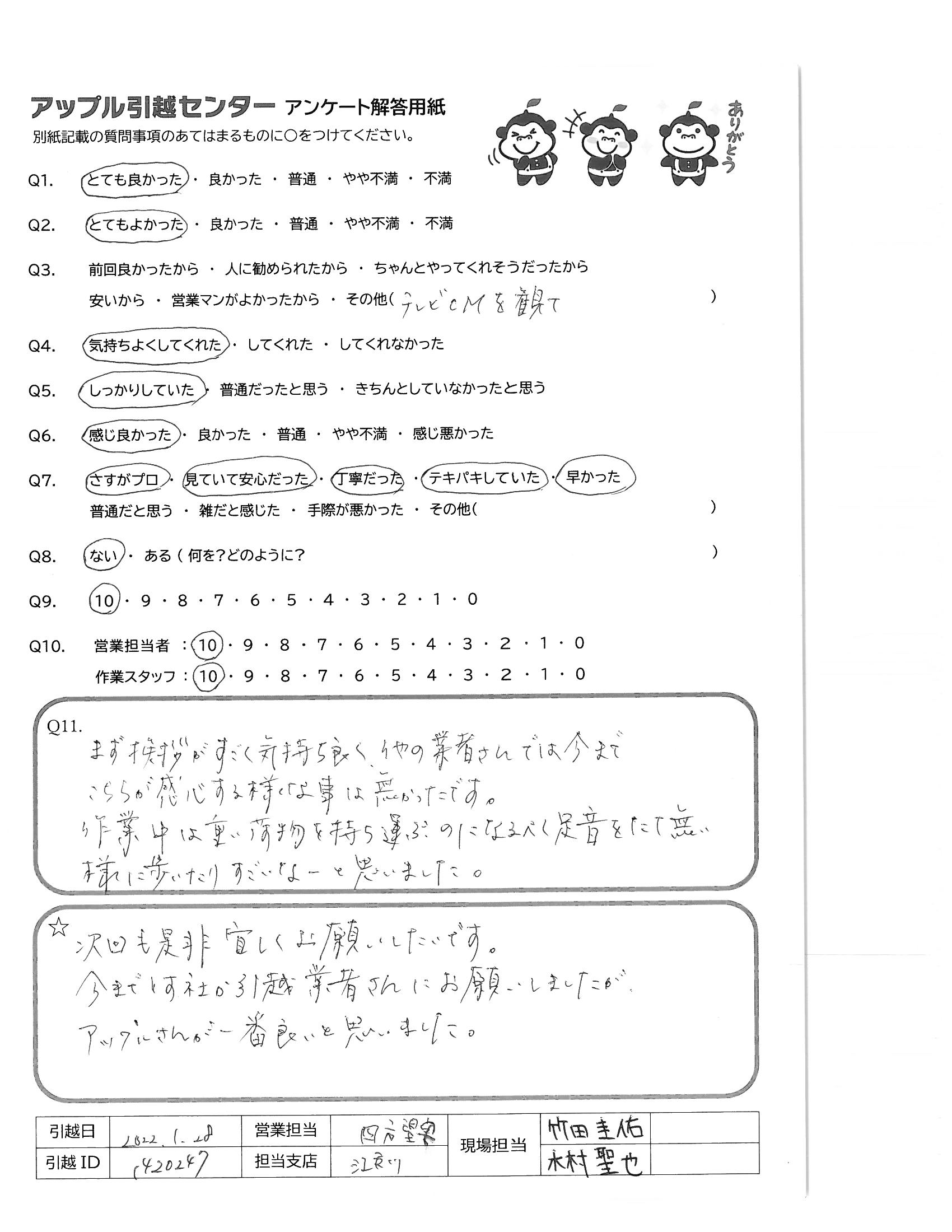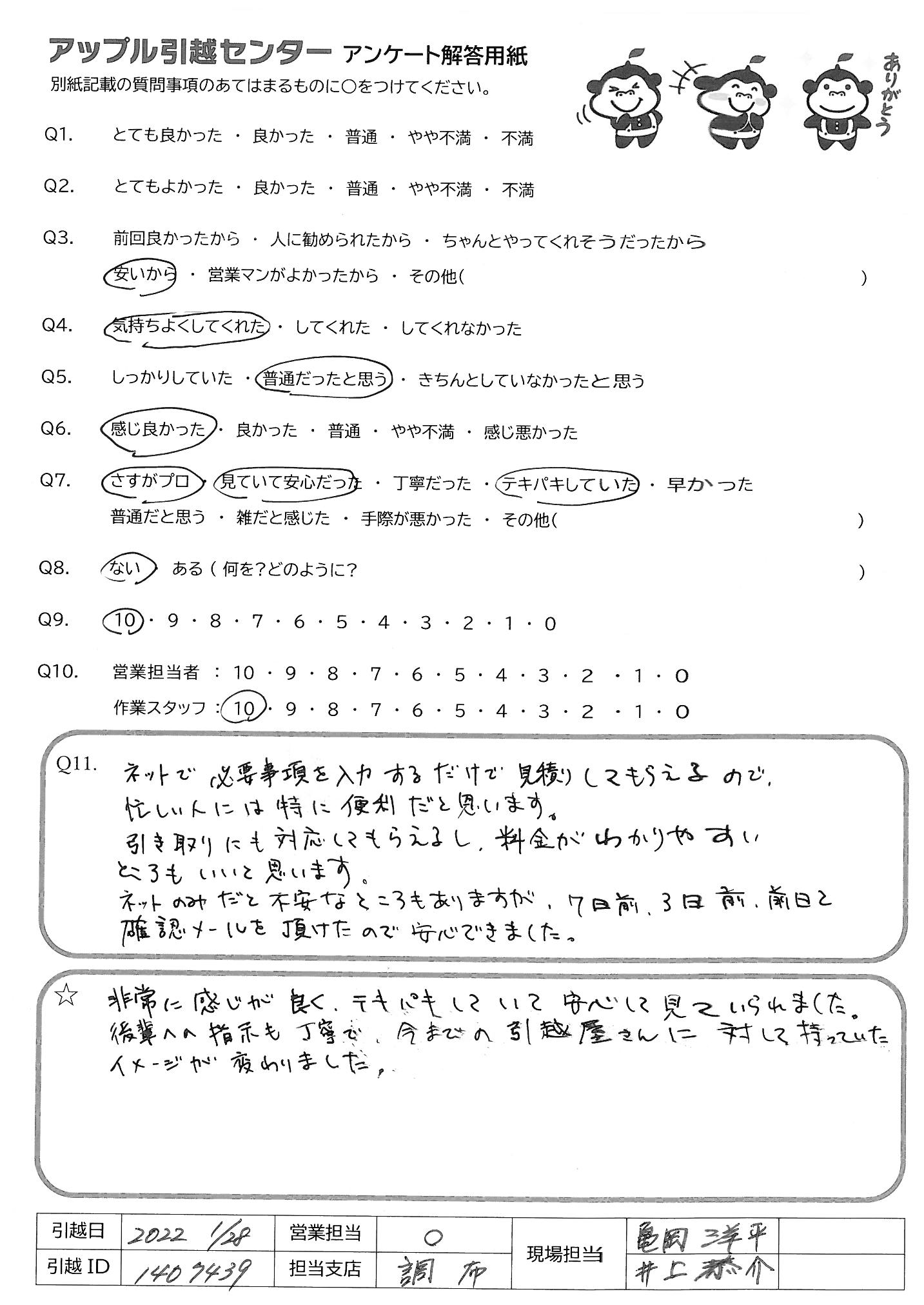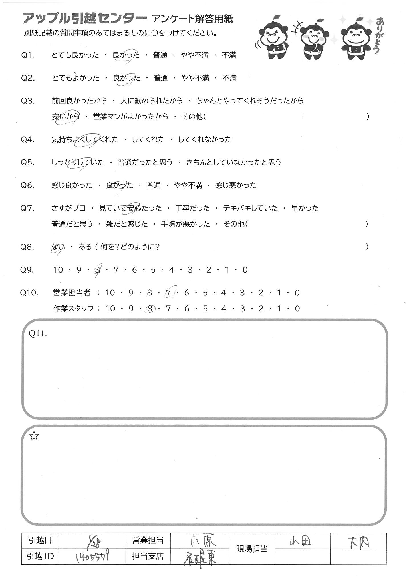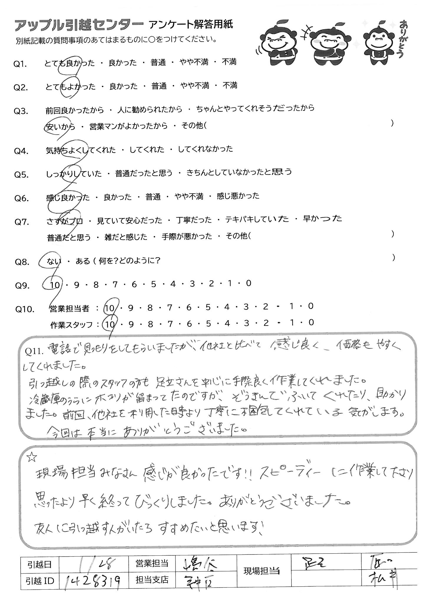 A.スタッフさんの質、電話対応の素早さ、値段、どれをとっても大満足です。今後も引越しは、アップルさんにおね