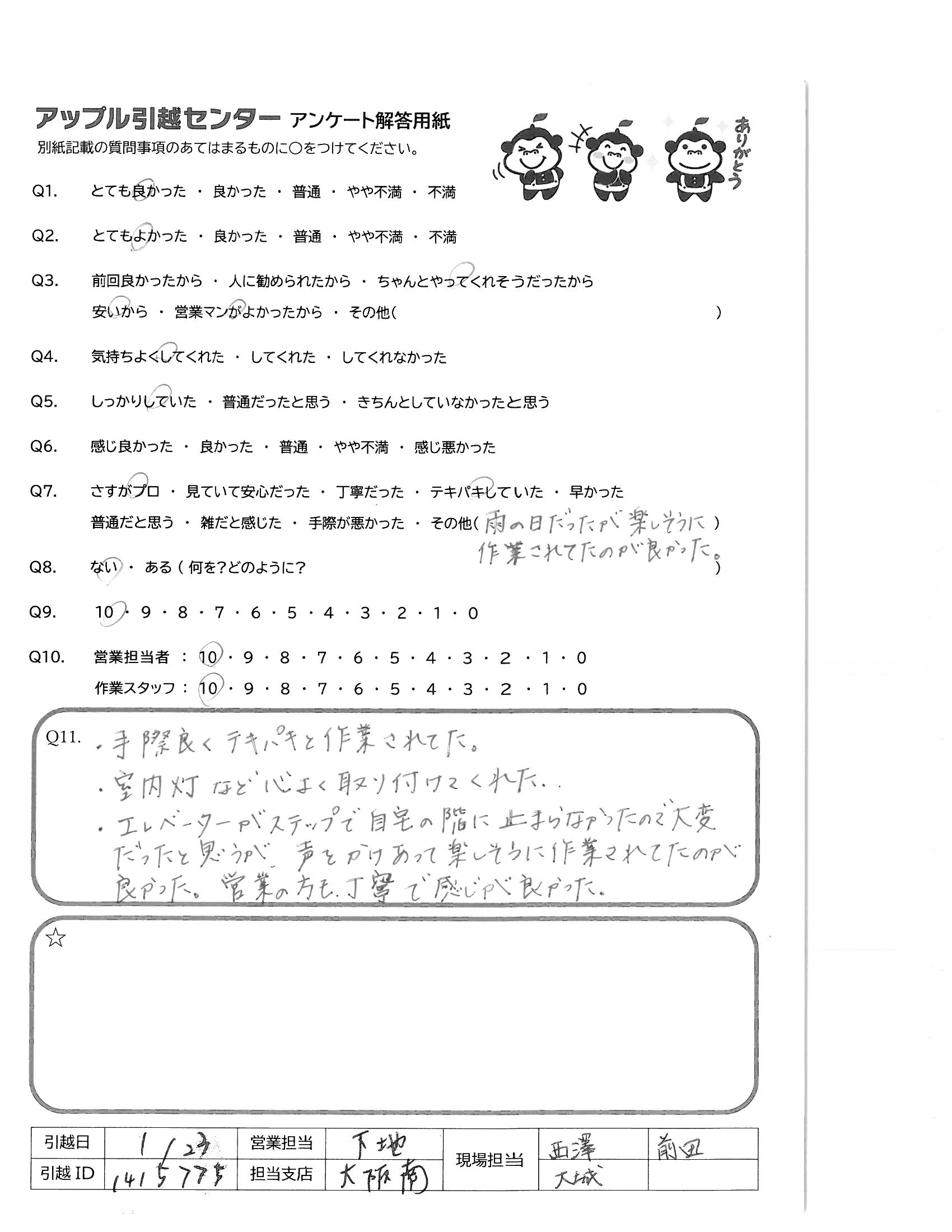 A.現場担当のみなさん 感じが良かったです!!スピーディに作業してkじゅださり 思ったより早く終わってびっくりしました。ありがとうございました。 友人に引っ越す人がいたらすすめたいと思います!