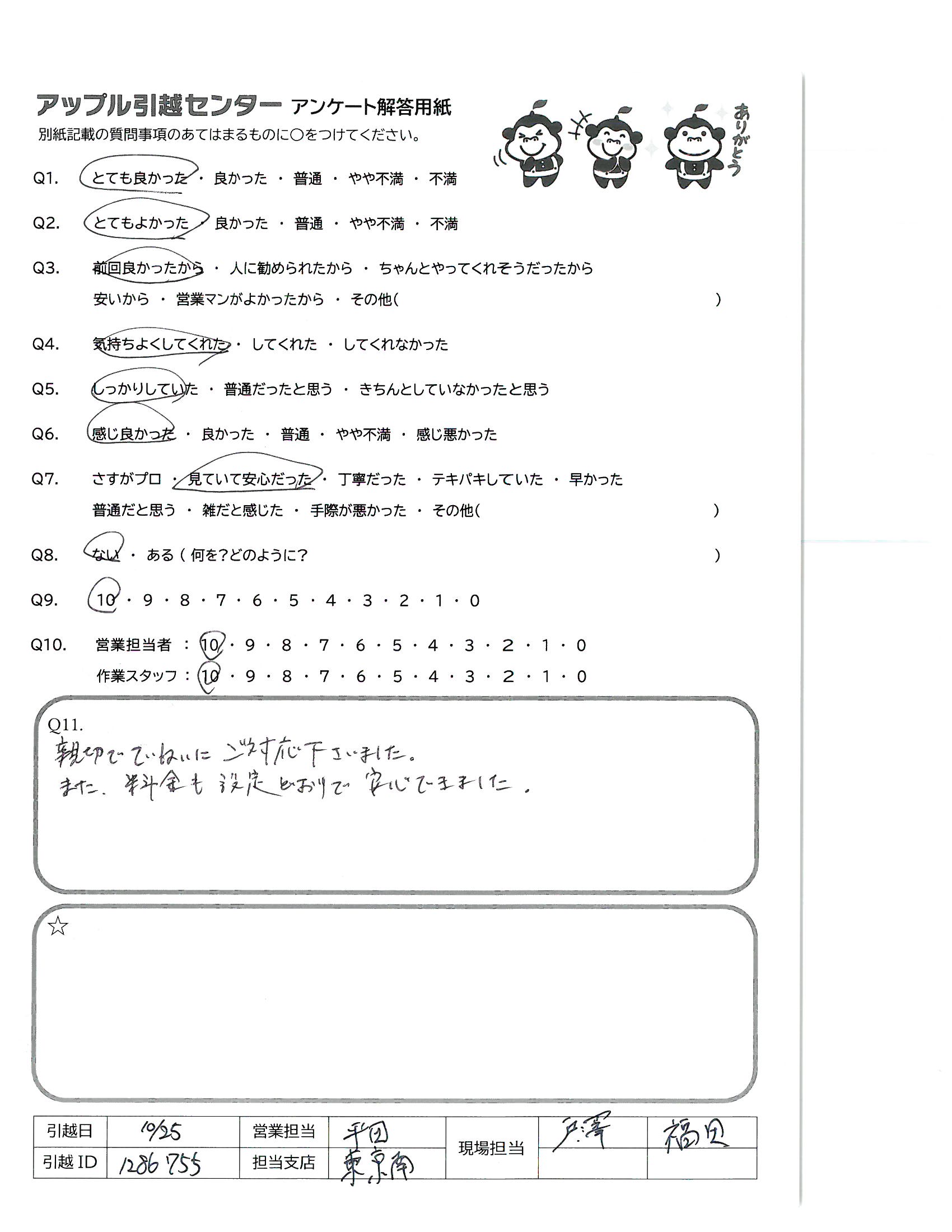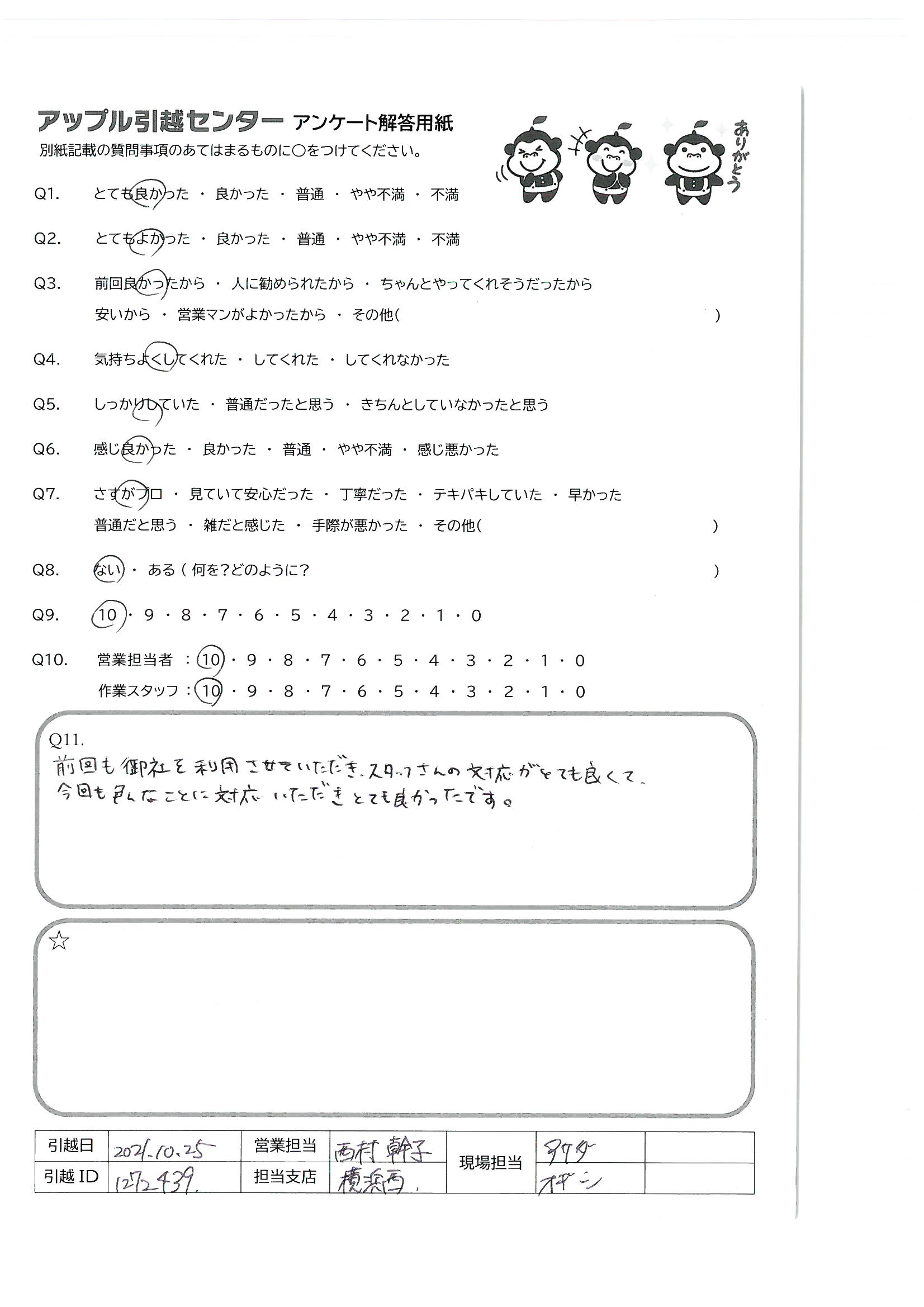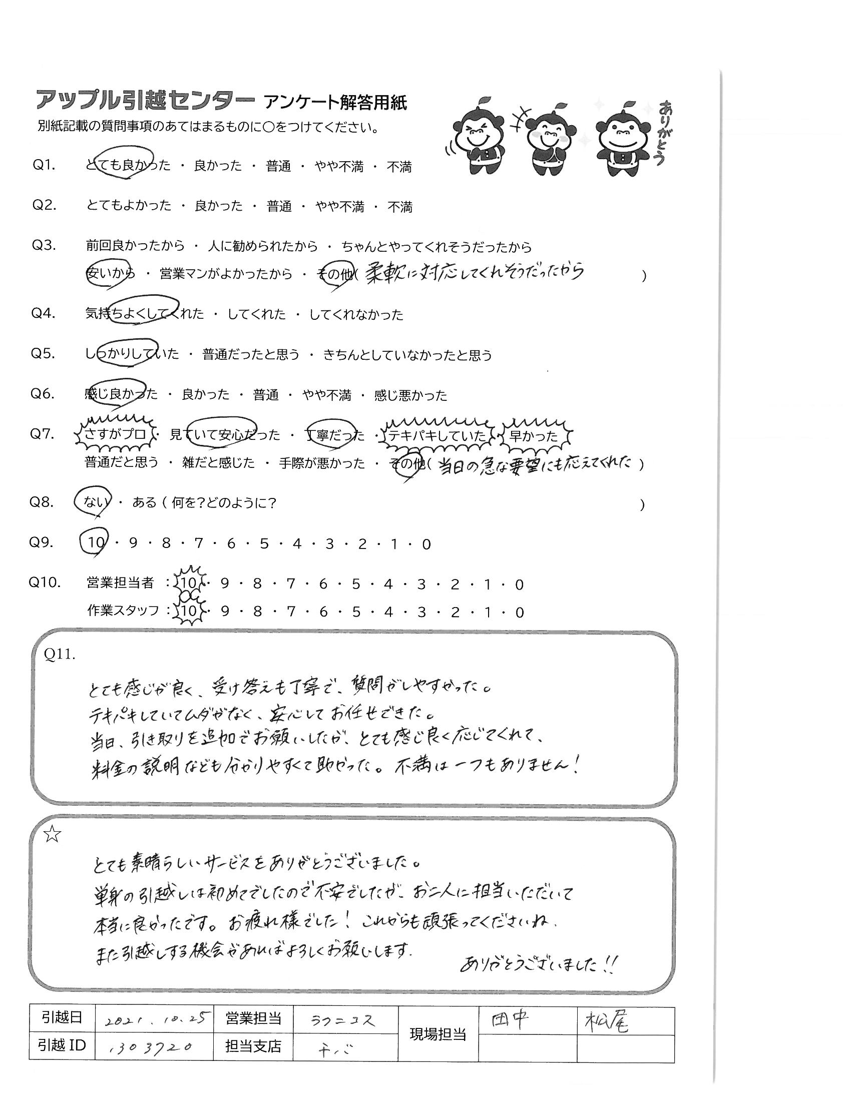 A.とても素晴らしいサービスをありがとうございました。 単身の引越しは初めてでしたので不安でしたが、お二人に担当いただいて本当に良かったです。お疲れ様でした!これからも頑張ってくださいね。 また引越しする機会があればよろしくお願いします。ありがとうございました!!