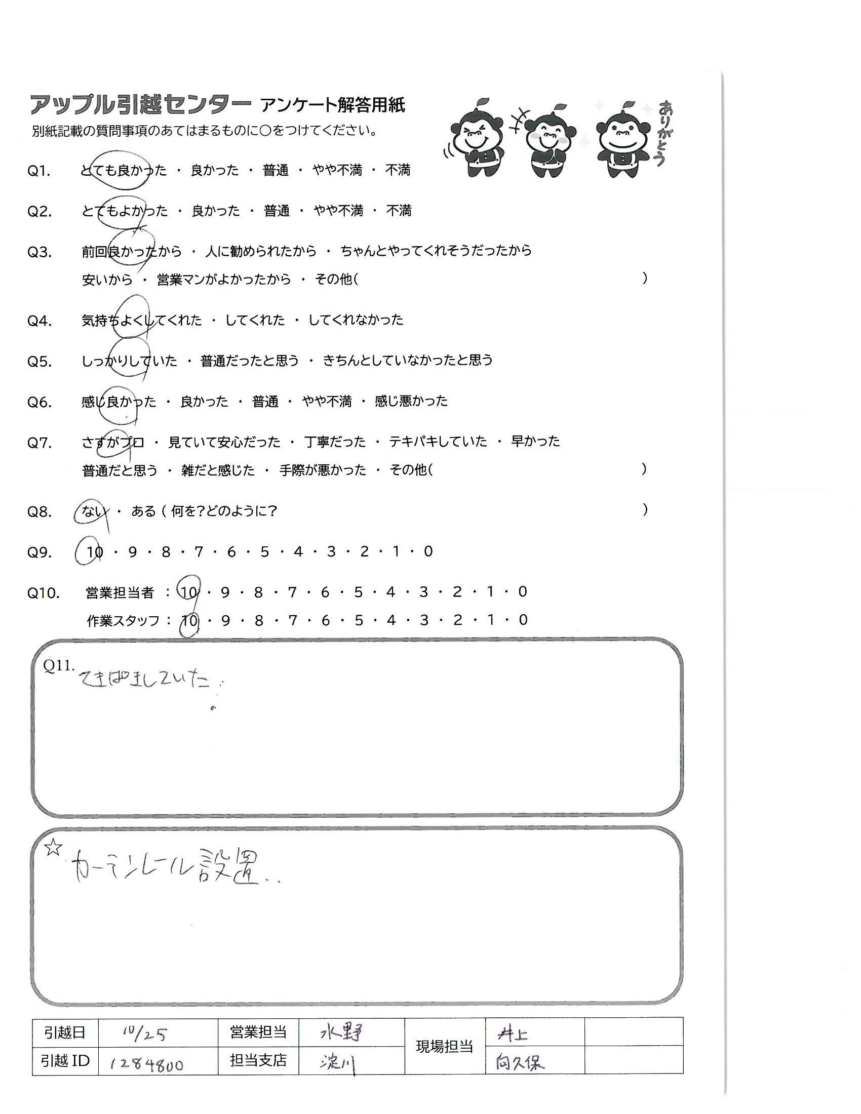 A.作業スタッフの方たちの手際の良さには驚きました! 重たい荷物を軽々とテンポ良く運ぶ姿、カッコ良すぎです。 誠実で気持ちの良い対応、ありがとうございました!! 次も機会があればぜひお願い致します!!(母)