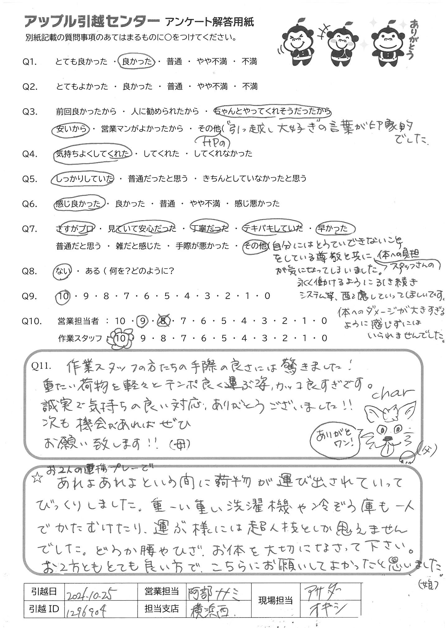 A.他社と見積もりや口コミを比較して、アップル引越しセンターさんが一番良いと思い決めました。初めての業者さんを使っての引越しで少し不安だったのですが、当日はスムーズに作業が進みとても感謝しています。次引っ越す時がありましたらまたアップル引越しセンターさんにお願いしたいです。荷造り、荷解きが大変でしたが、ダンボールのりんごり君の絵に癒されました!