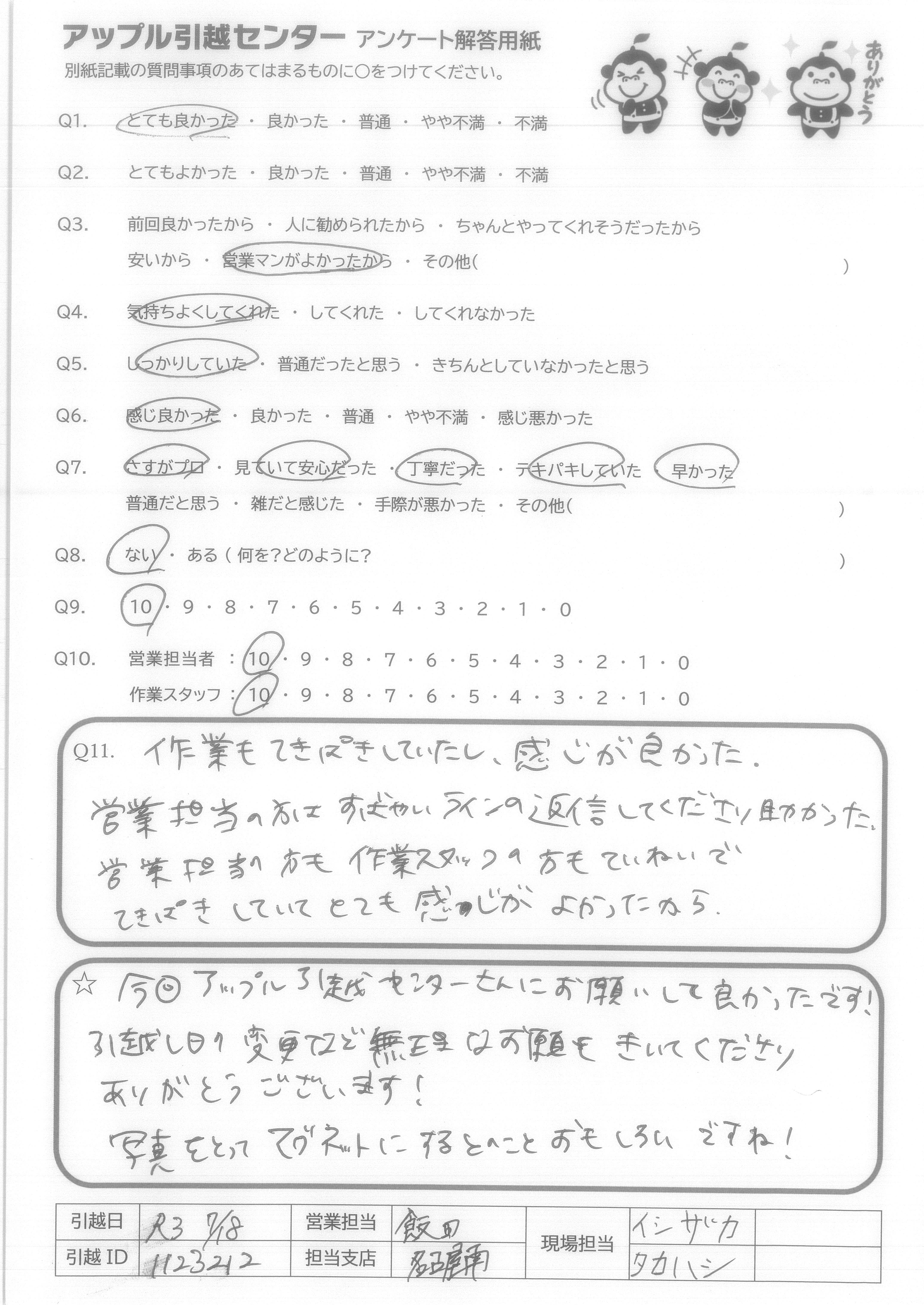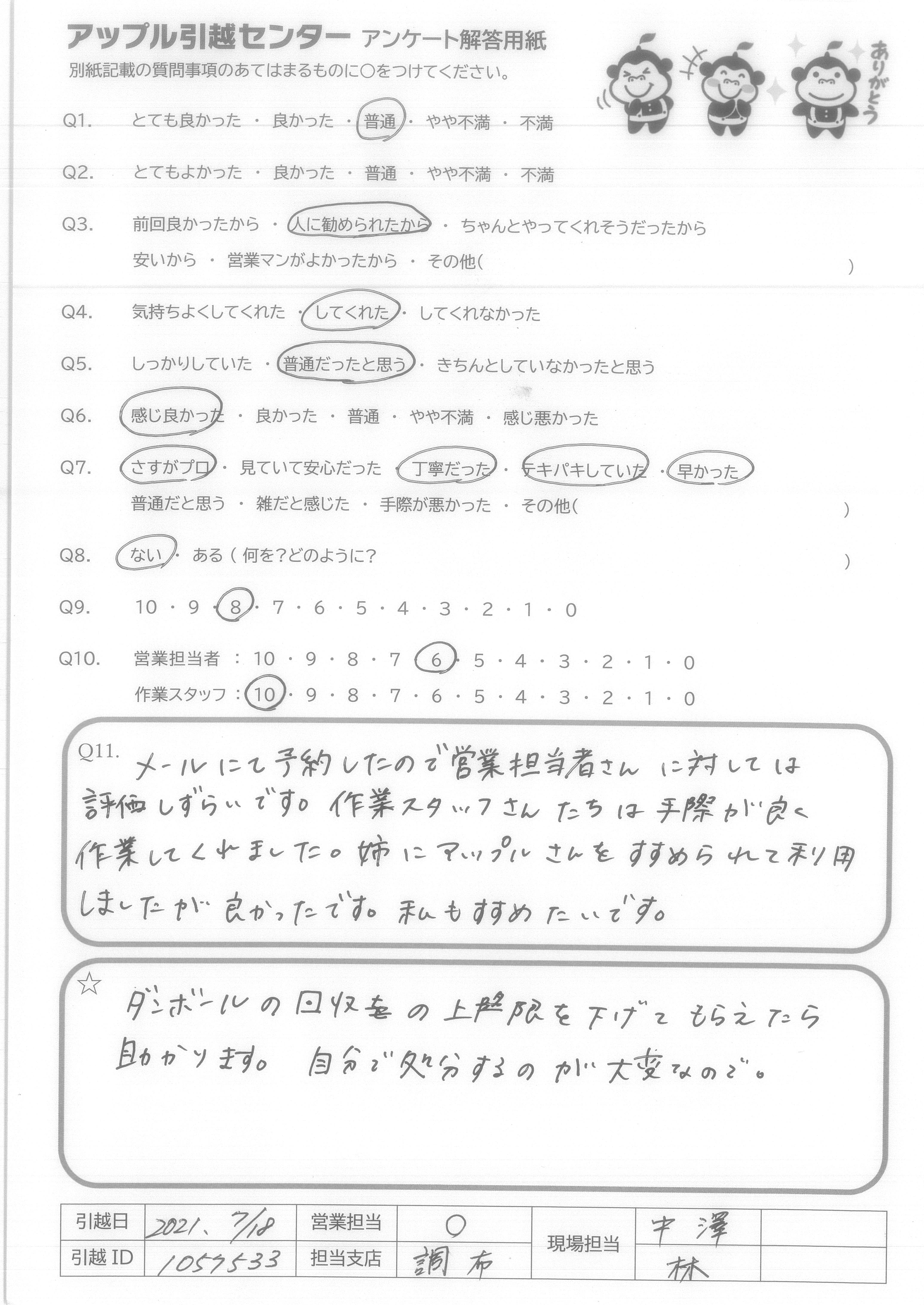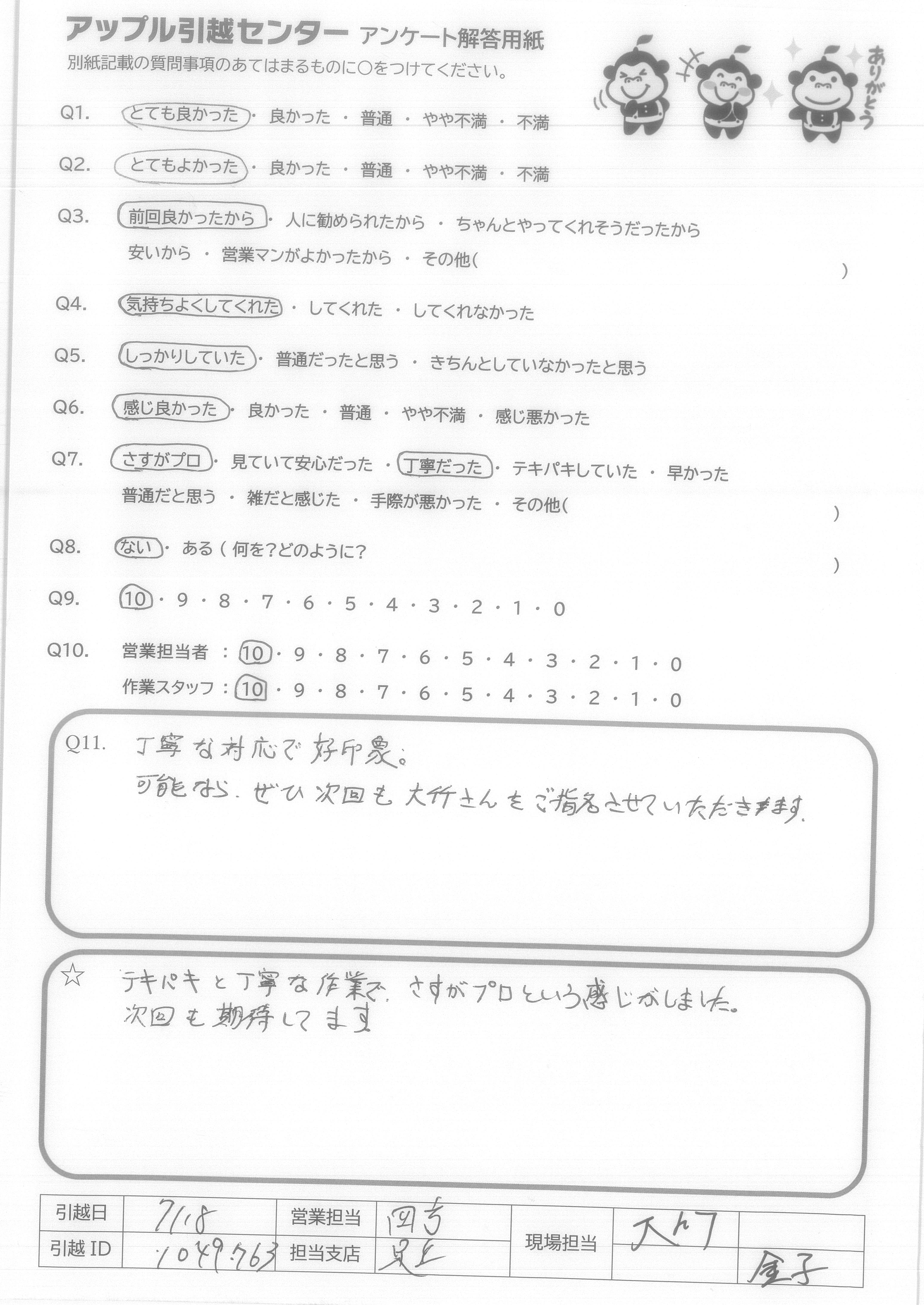A.メールにて予約したので営業担当者さんに対しては評価しずらいです。作業スタッフさんたちは手際が良く作業してくれました。姉にアップルさんをすすめられて利用しましたが良かったです。私もすすめたいです。