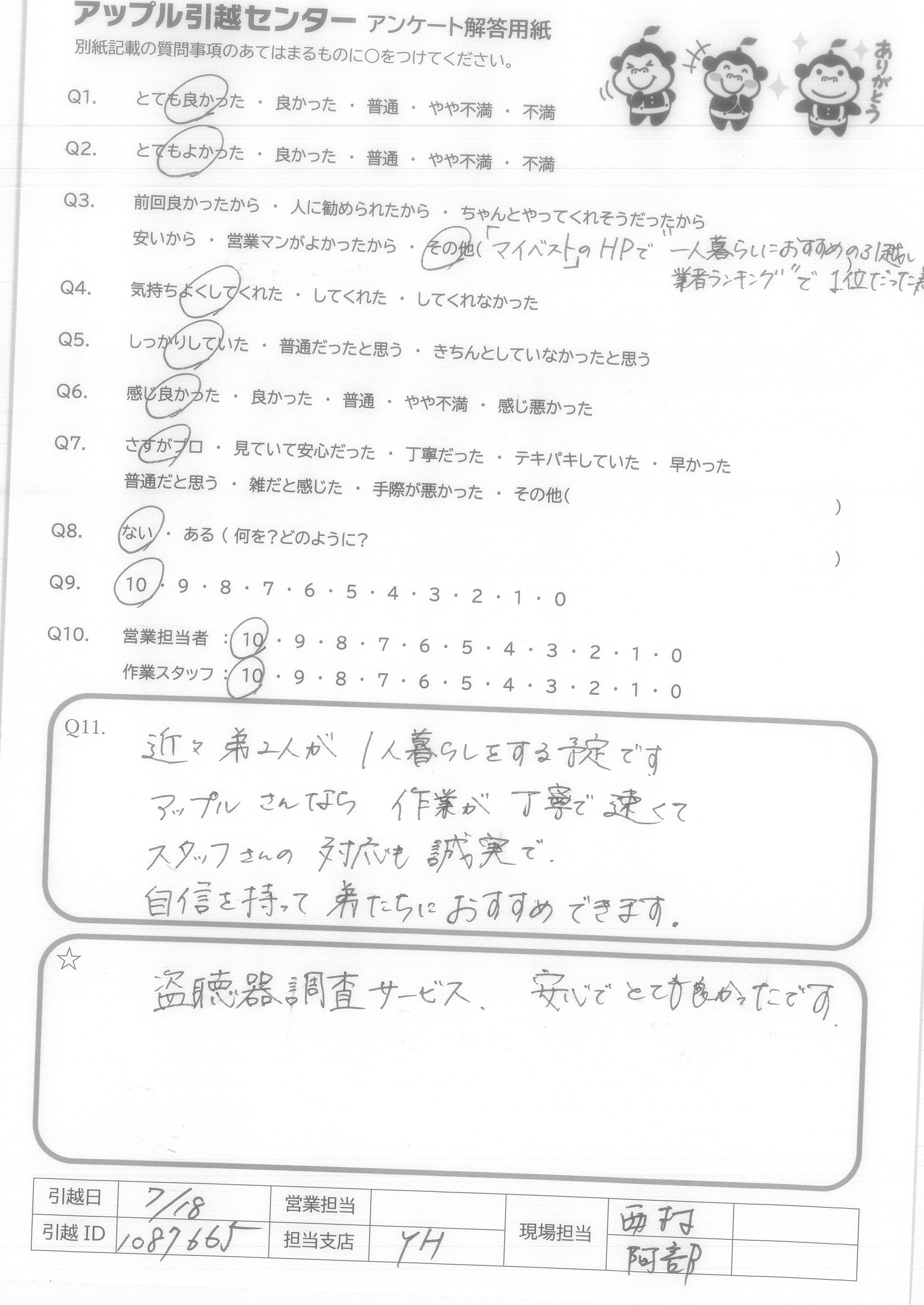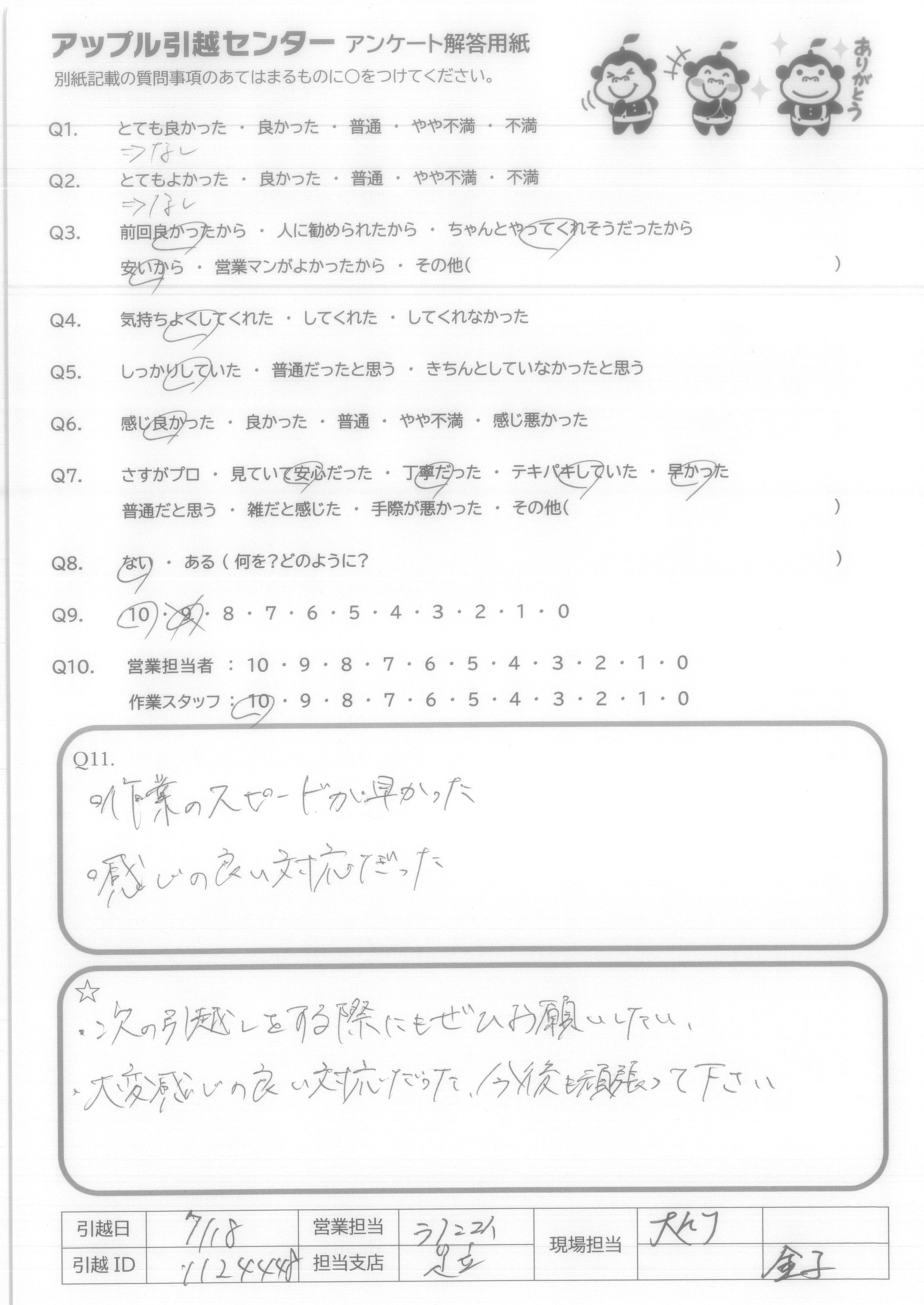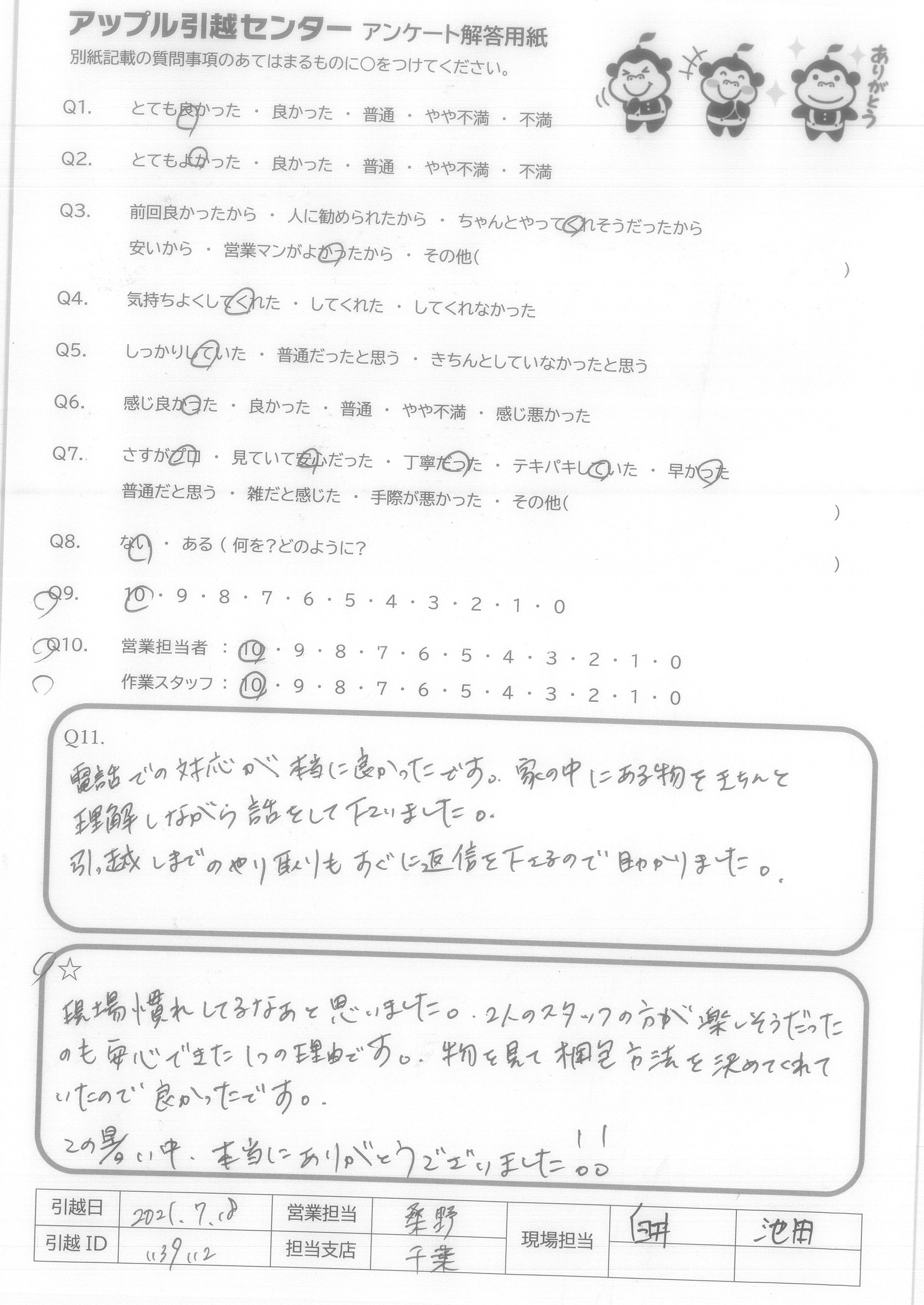 A.メールにて予約したので営業担当者さんに対しては評価しずらいです。作業スタッフさんたちは手際が良く作業してくれました。姉にアップルさんをすすめられて利用しましたが良かったです。私もすすめたいです。