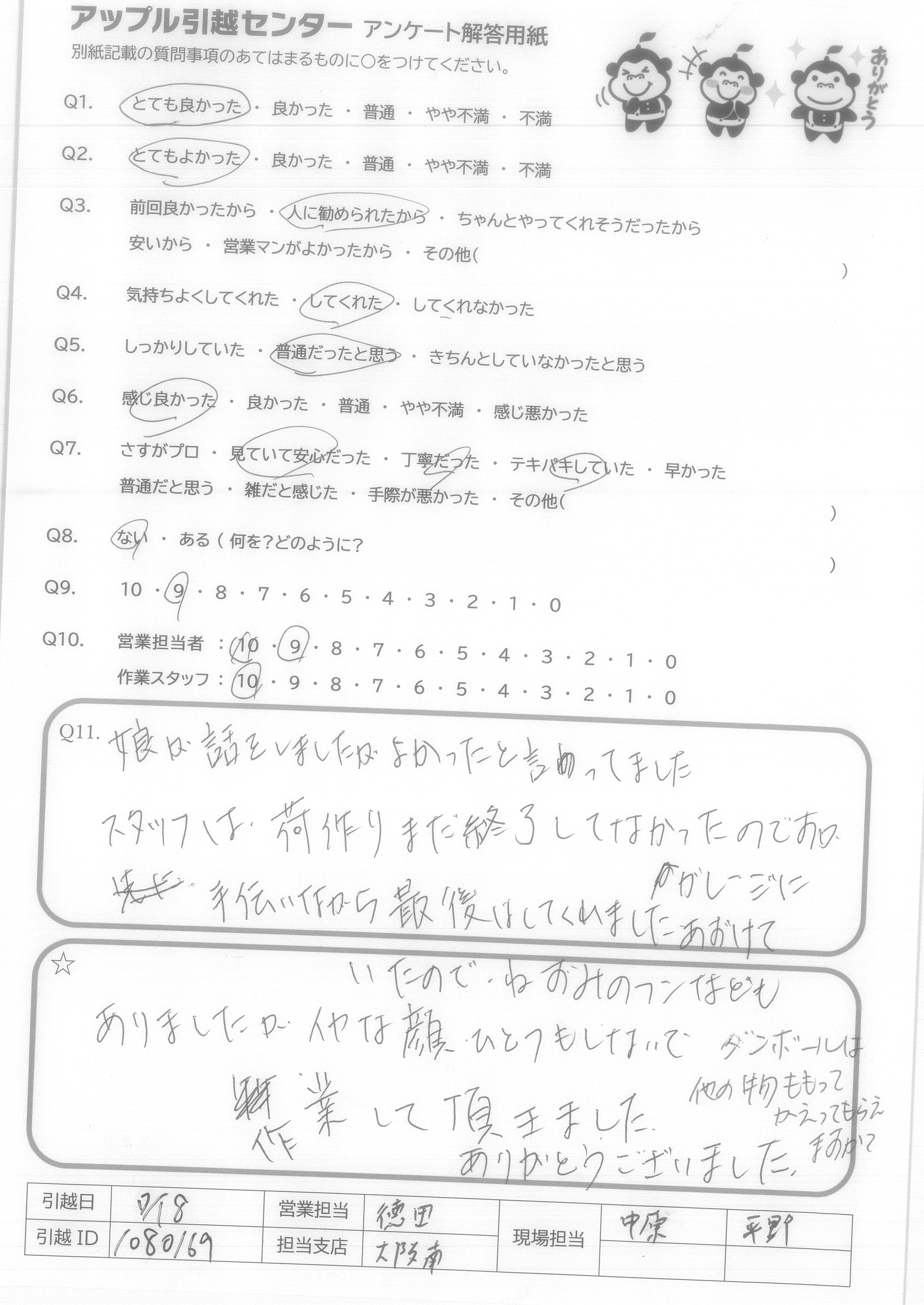A.電話での対応が本当に良かったです。家の中にある物をきちんと理解しながら話をして下さいました。 引っ越しまでのやり取りもすぐに返信を下さるので助かりました。