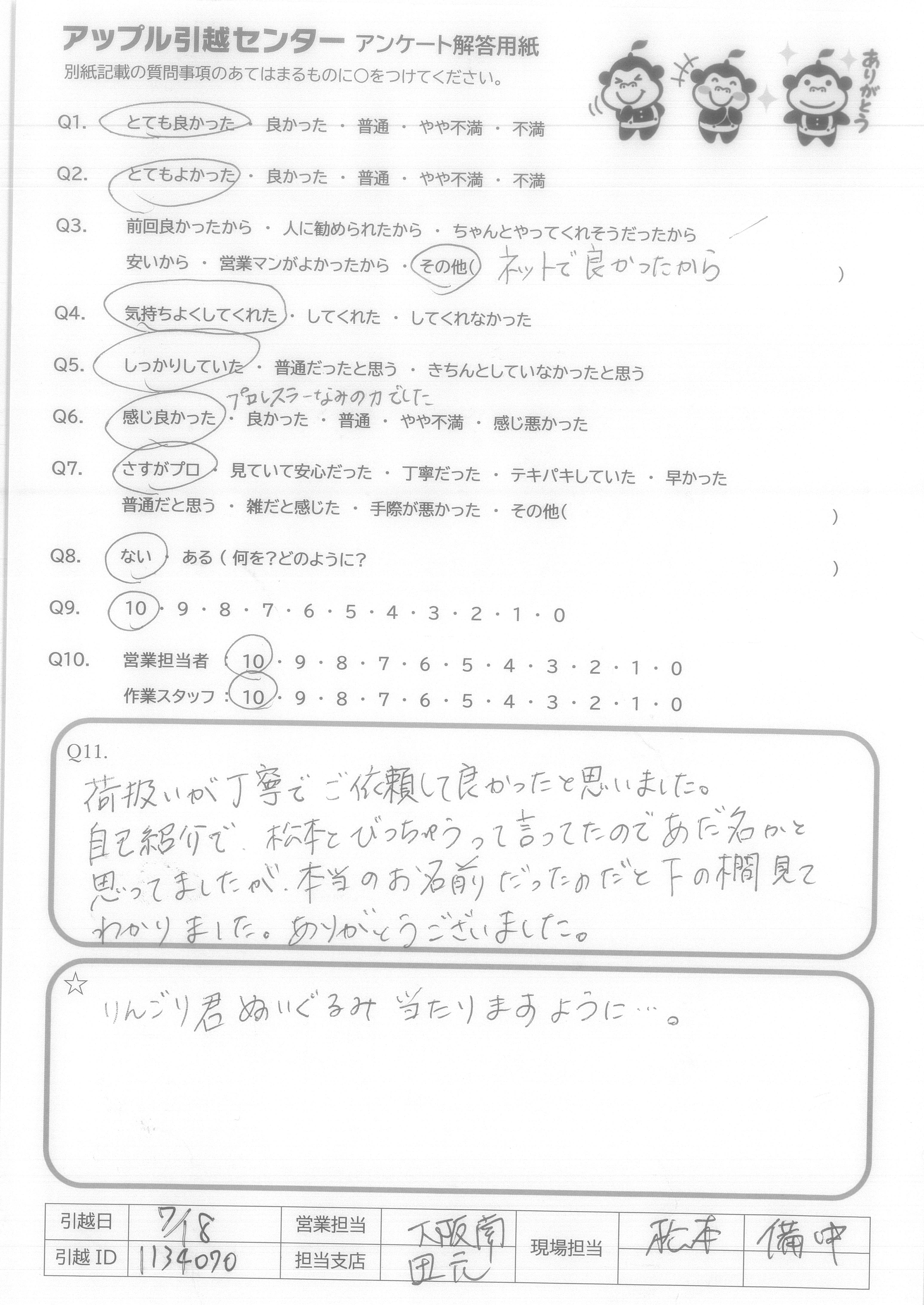 A.荷扱いが丁寧でご依頼して良かったと思いました。 自己紹介で松本とびっちゅうって言ってたのであだ名かと思ってましたが、本当のお名前だったのだと下の欄見てわかりました。ありがとうございました。