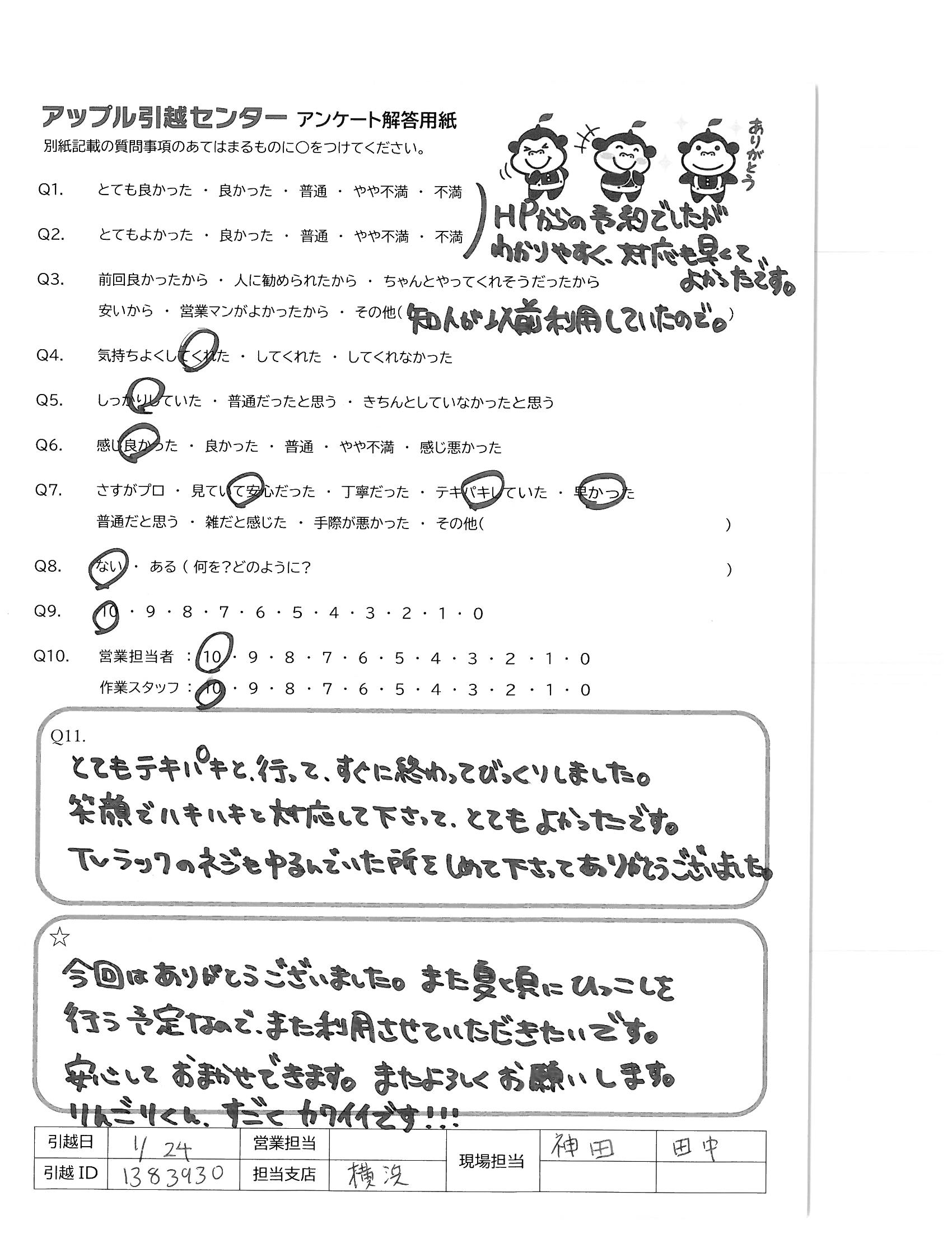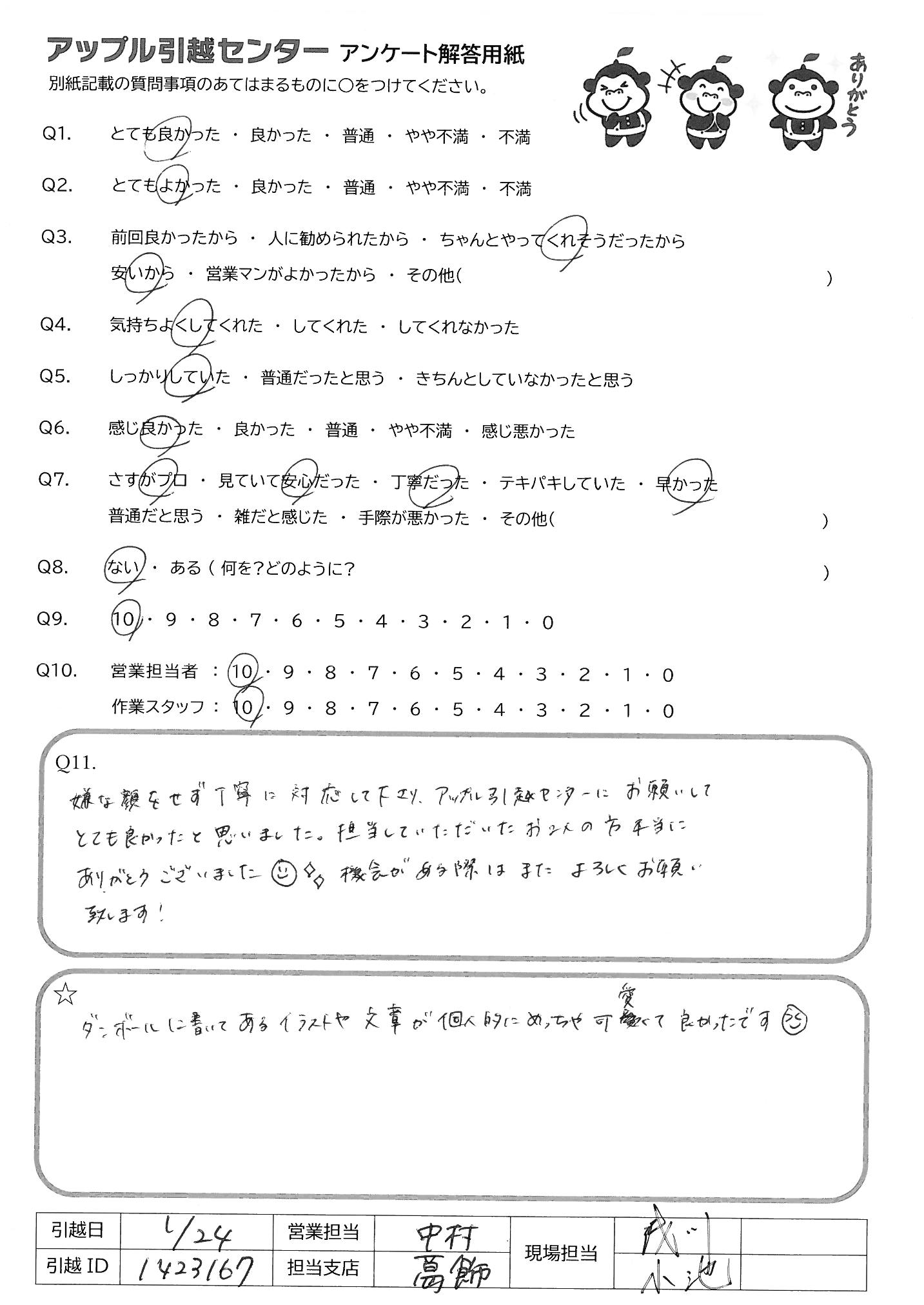 A.今回はありがとうございました。また夏頃にひっこしを行う予定なので、また利用させていただきたいです。 安心しておまかせできます。またよろしくお願いします。 りんごりくん、すごくカワイイです!!!
