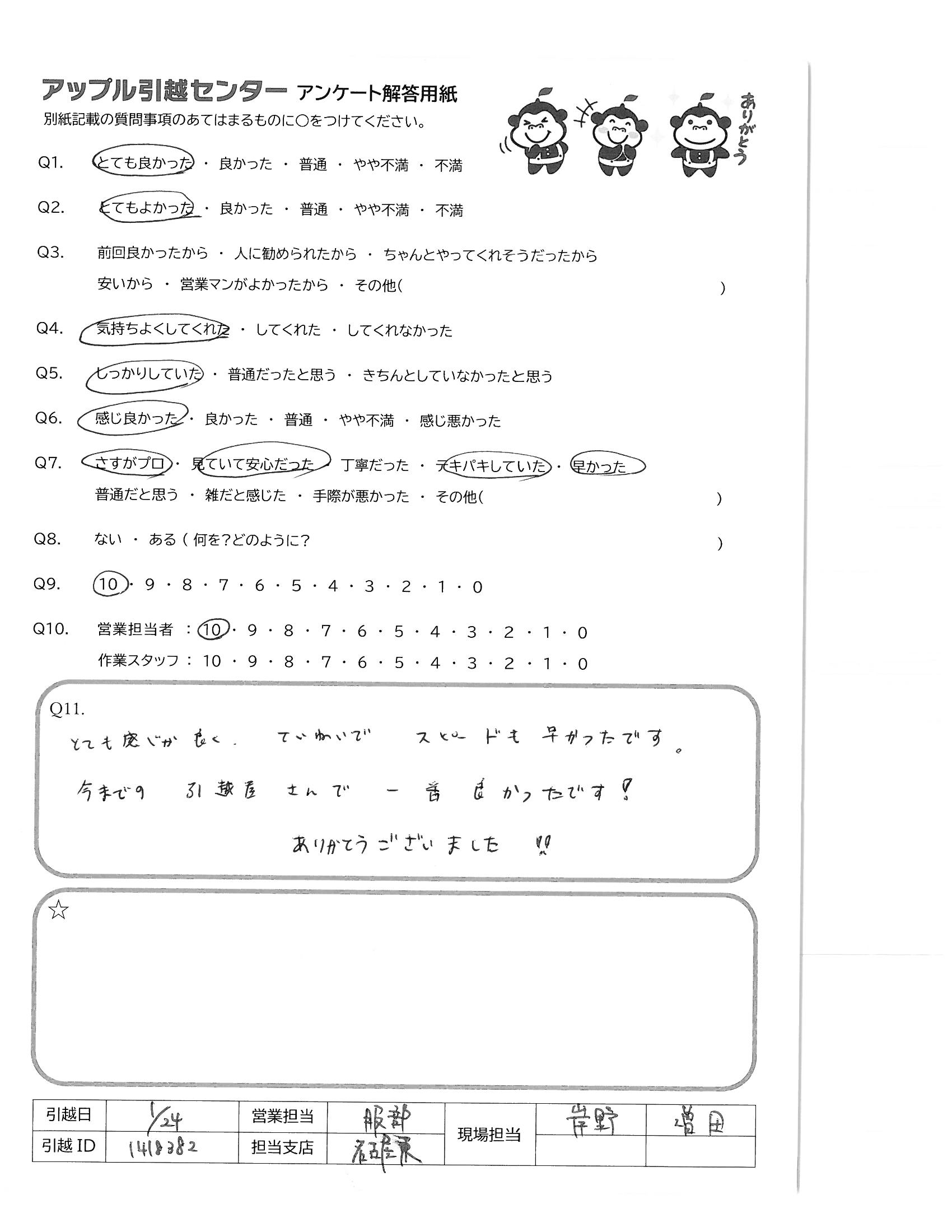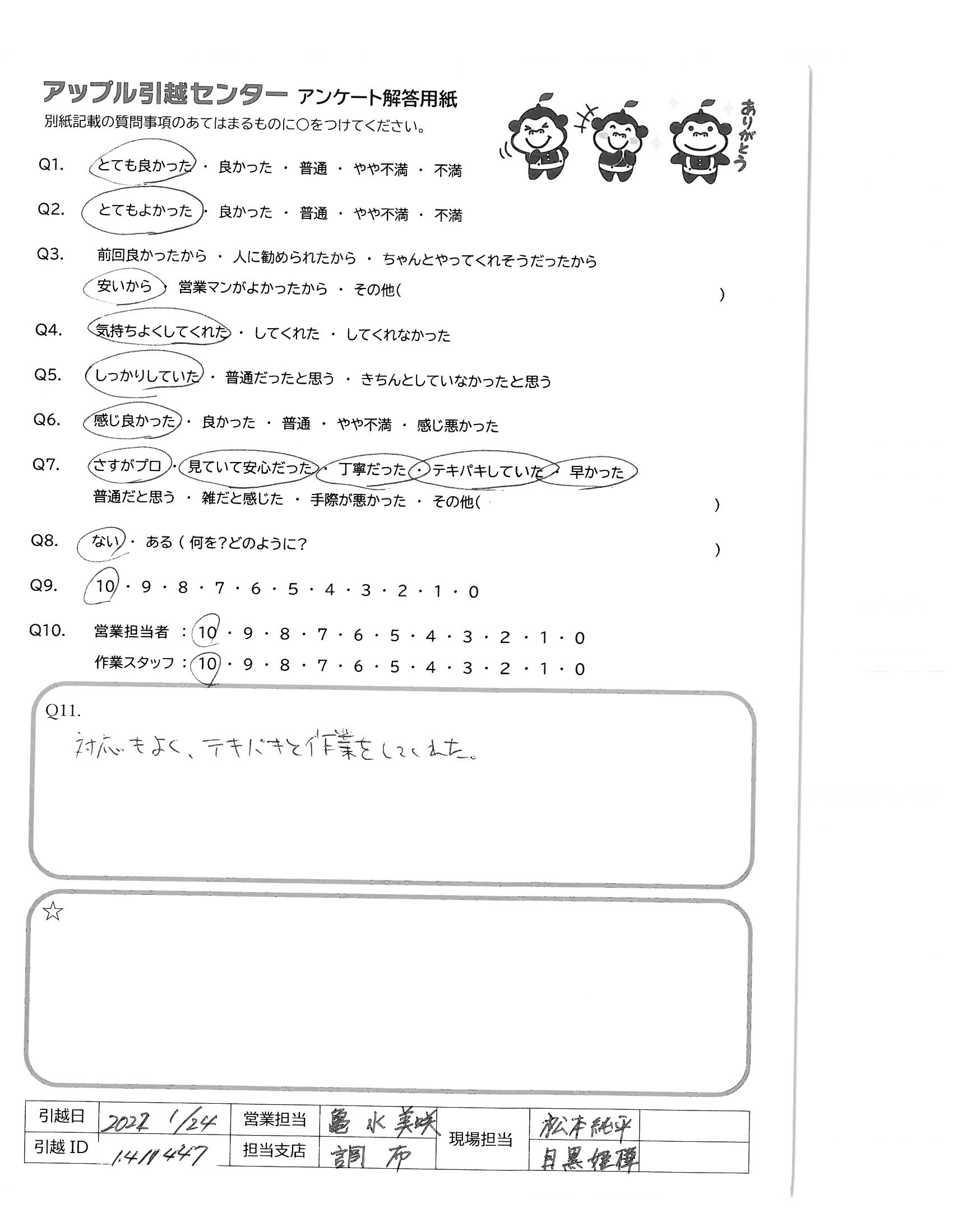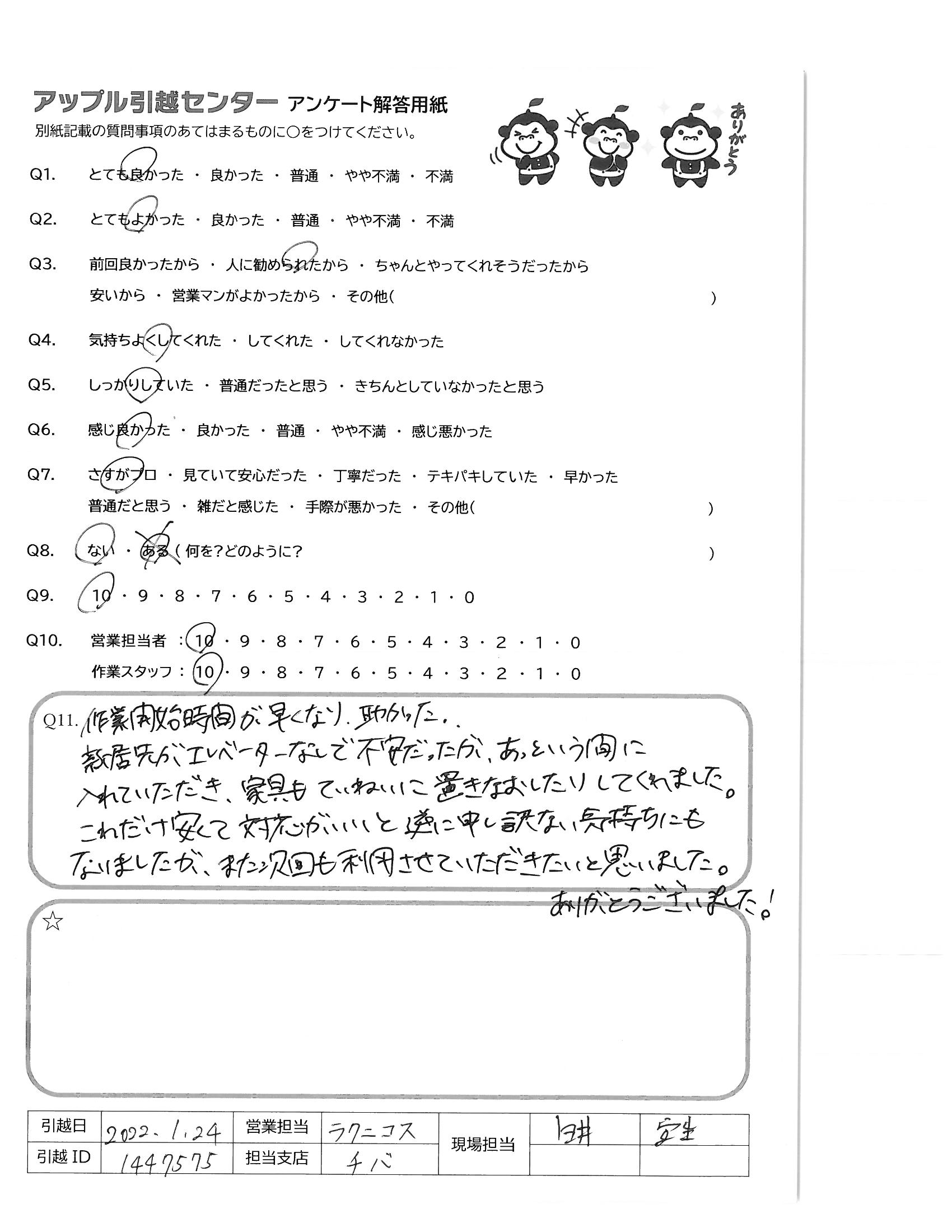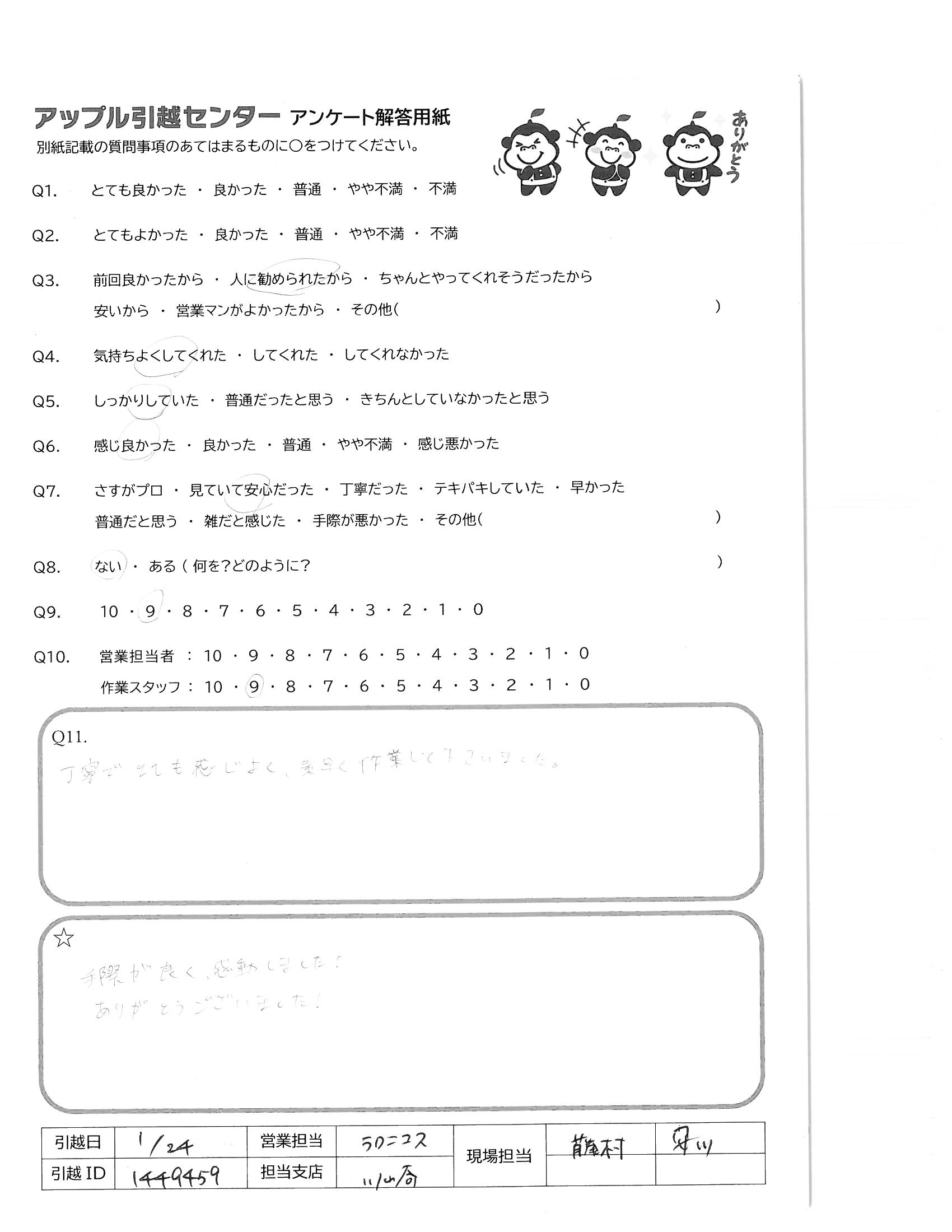 A.受け応えも丁寧で現場の皆様の印象がとても良かった 1月末の大変寒い時期ですが、作業ありがとうございました。 次回、また引越しの機会がありましたら、 是非、アップル引越センター様を利用させて頂きます。