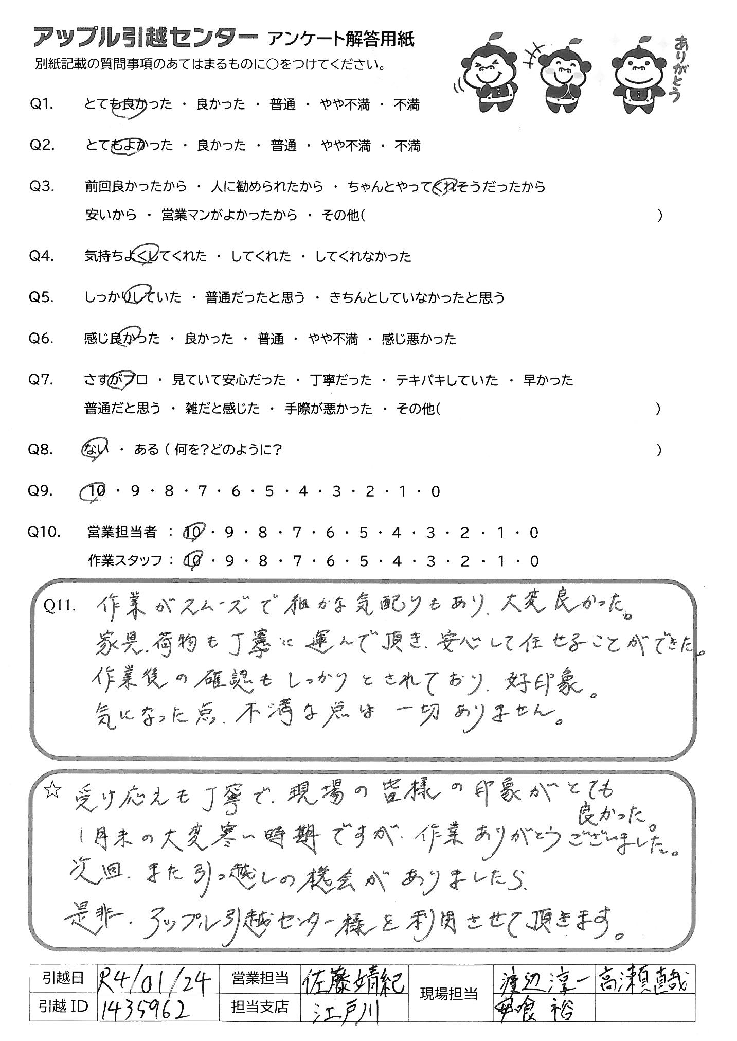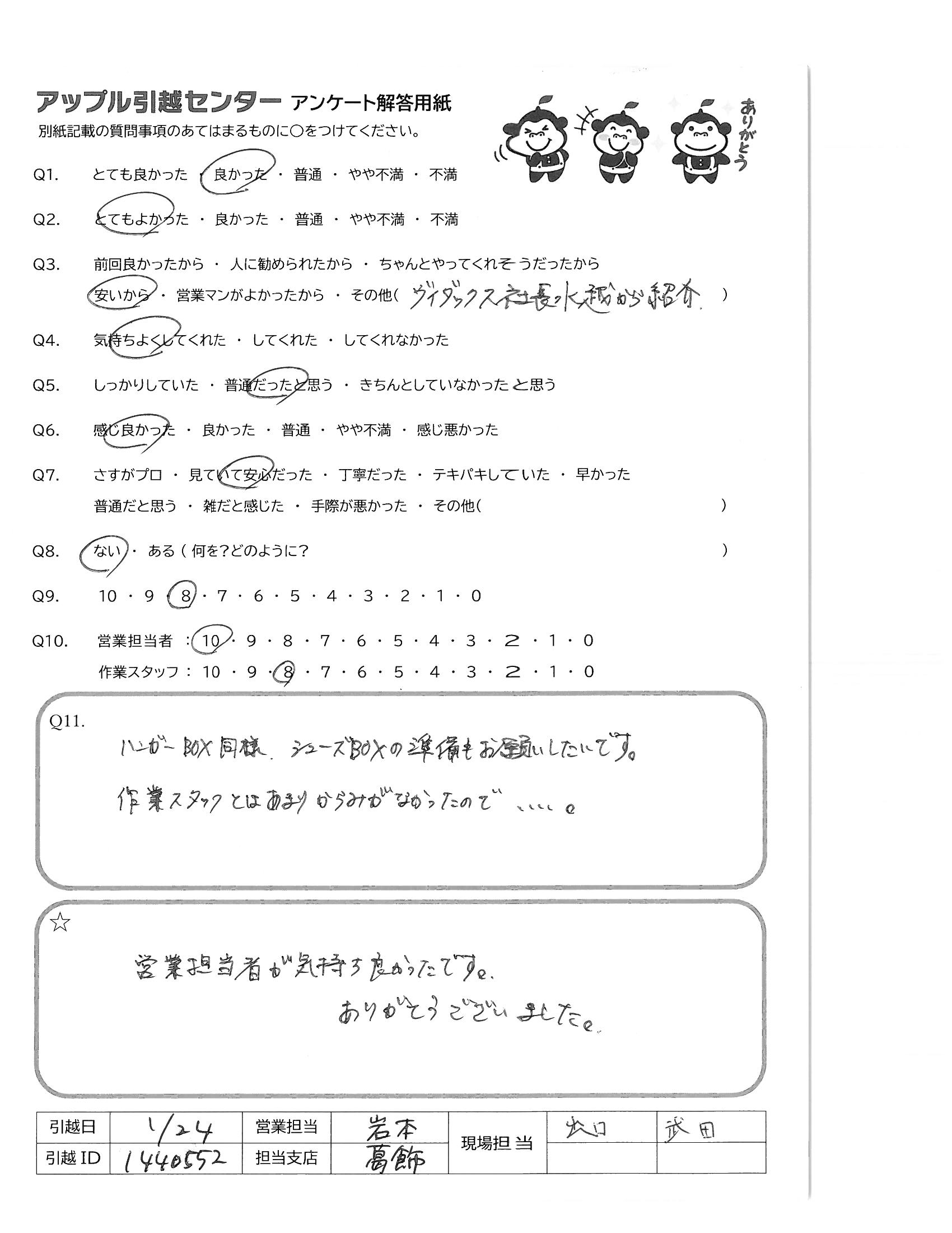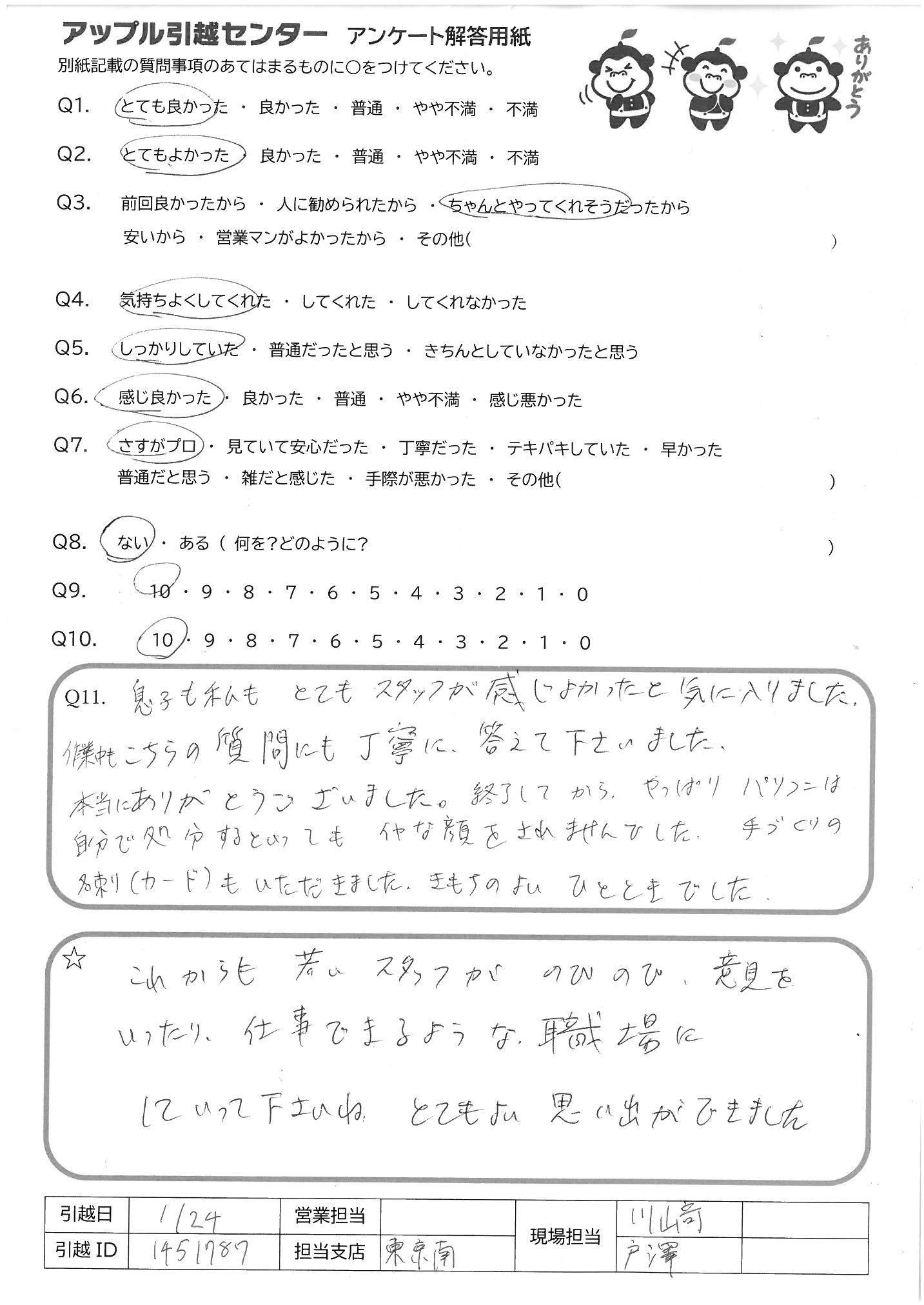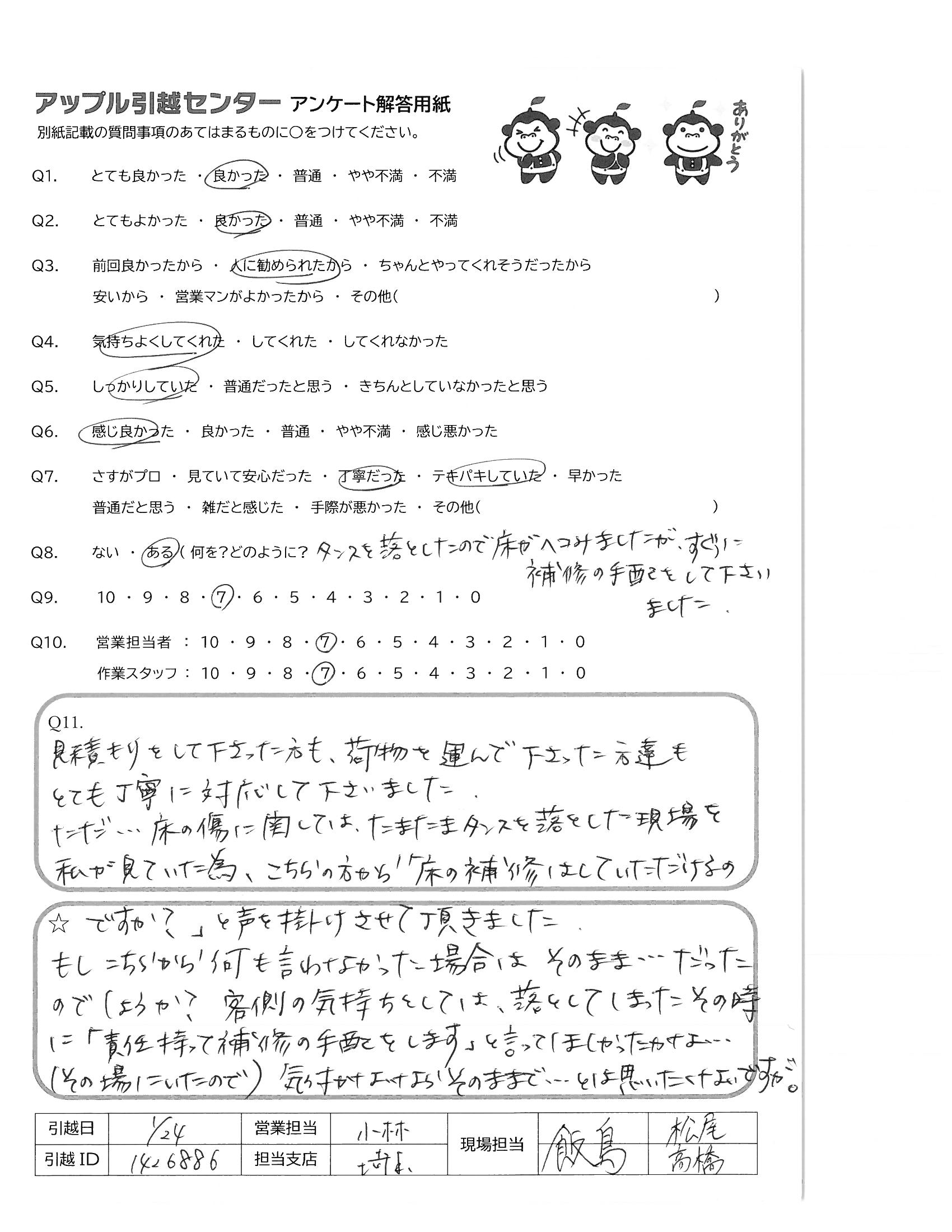 A.受け応えも丁寧で現場の皆様の印象がとても良かった 1月末の大変寒い時期ですが、作業ありがとうございました。 次回、また引越しの機会がありましたら、 是非、アップル引越センター様を利用させて頂きます。