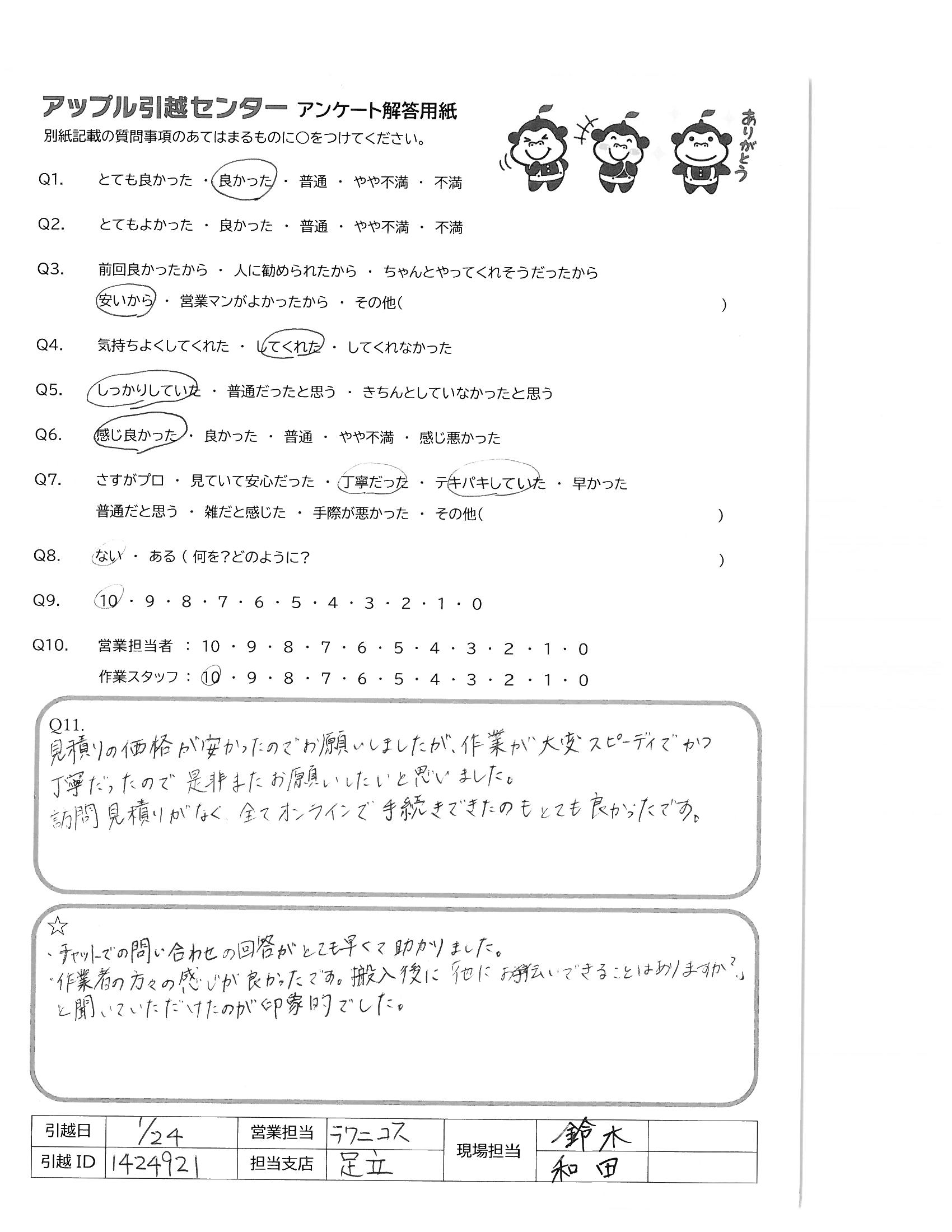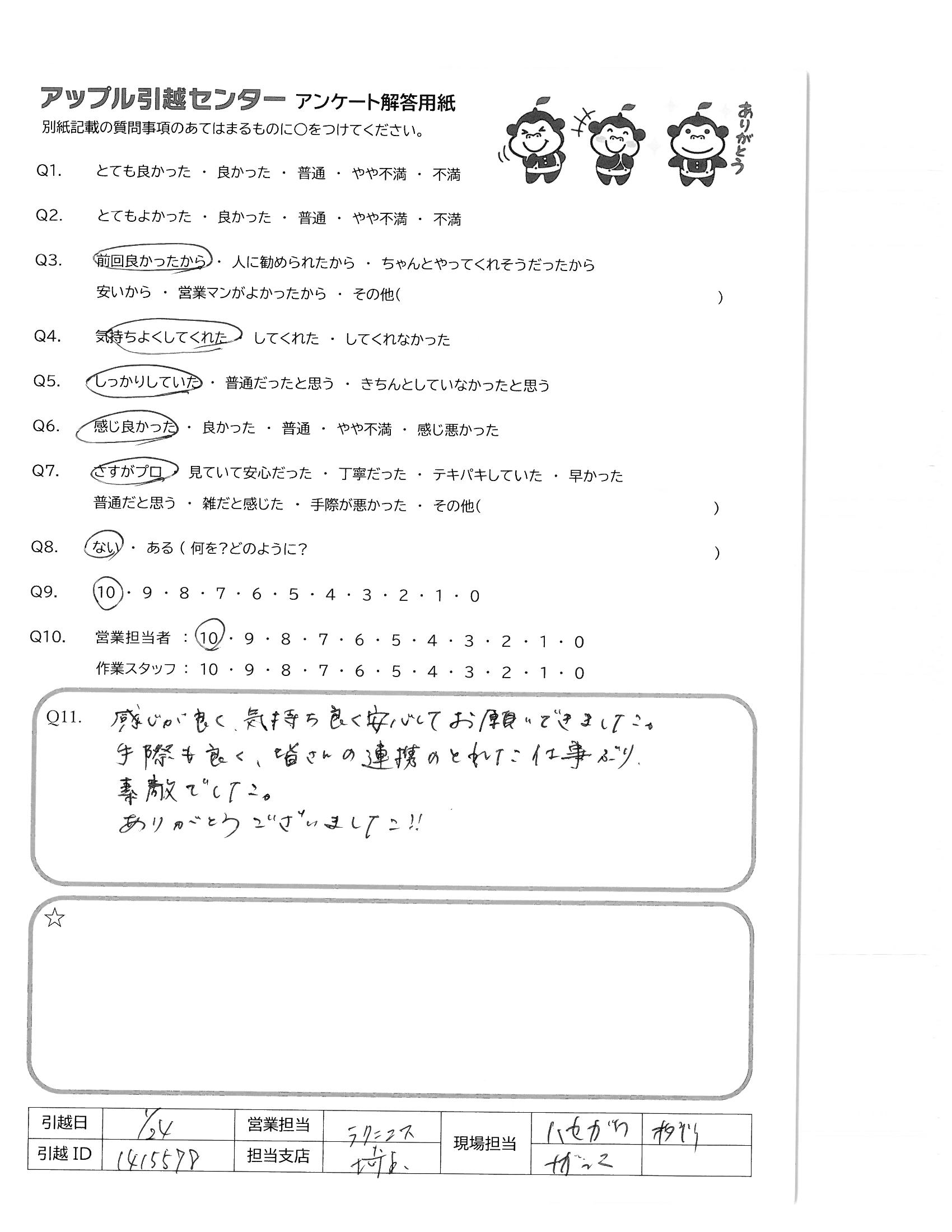 A.ありがとうございました!! アップル引越センターさん、絶対におすすめしますね。