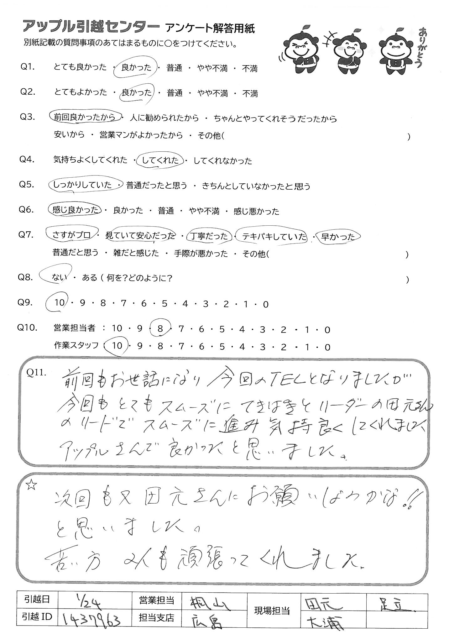 A.前回もお世話になり今回のTELとなりましたが 今回もとてもスムーズにてきぱきとリーダーの田元さんのリードでスムーズに進み気持ちよくしてくれました アップルさんで良かったと思いました。