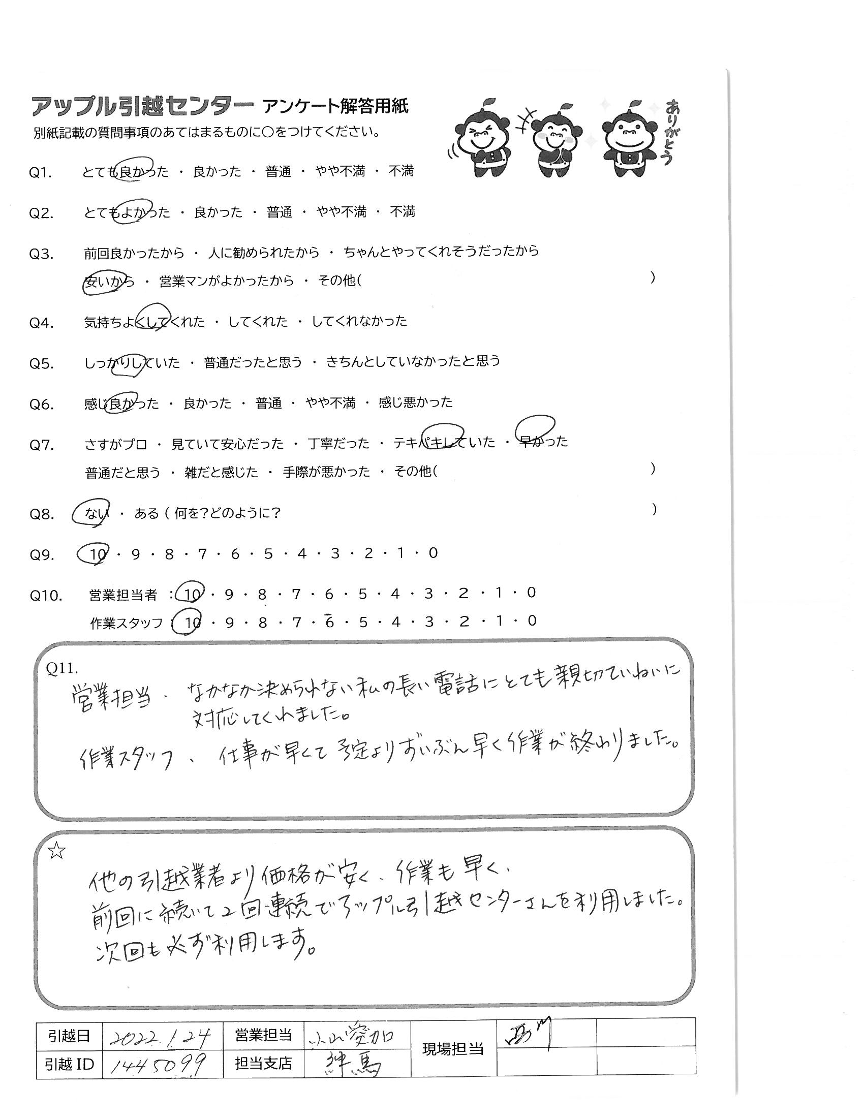 A.他の引越業者より価格が安く、作業も早く、前回に続いて2回連続でアップル引越センターさんを利用しました。 次回も必ず利用します。