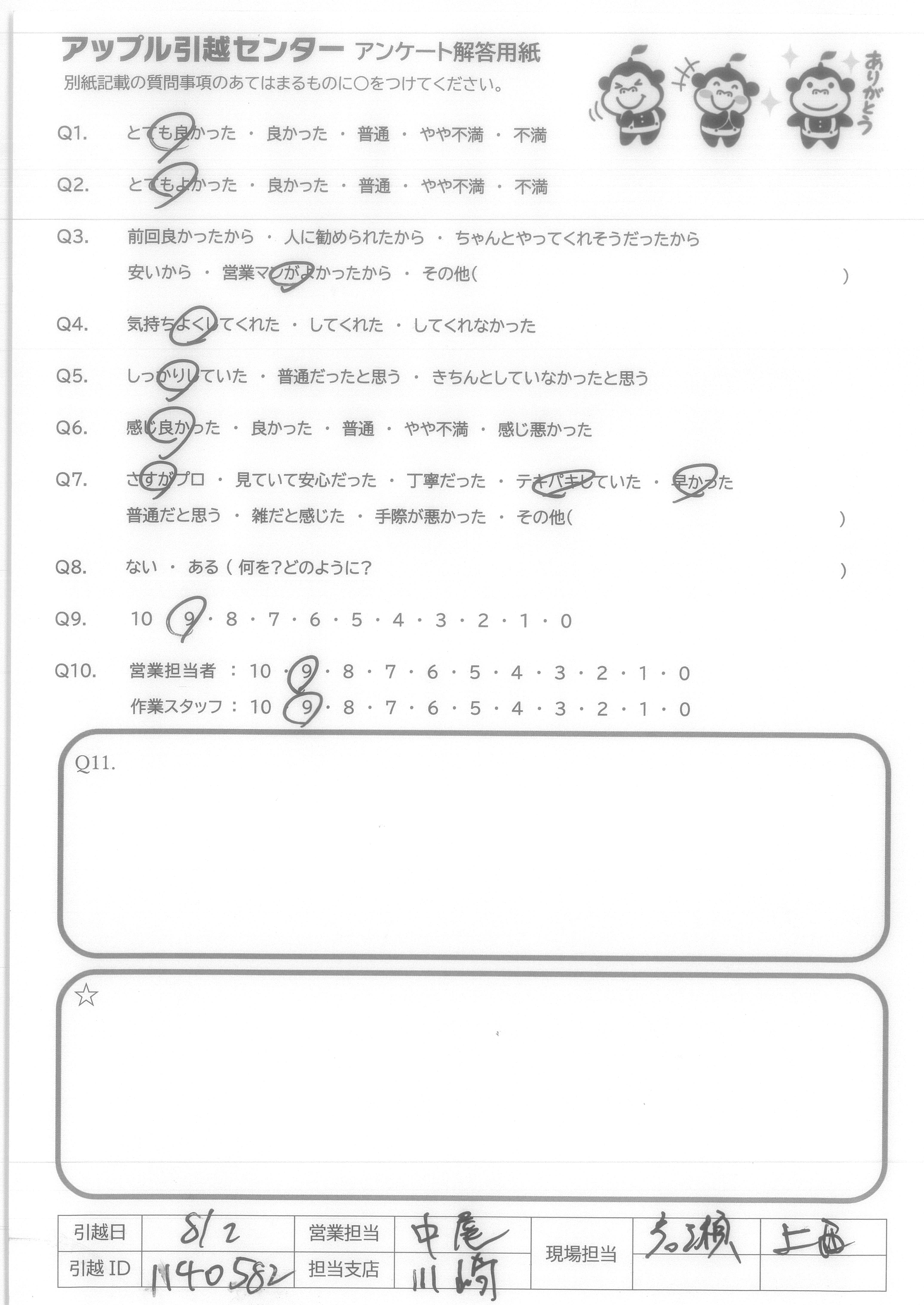 A.お安くしていただき、ありがとうございました。 スタッフさん方もとても良い方だったので満足しています。また引っ越す際は是非利用させていただきます。
