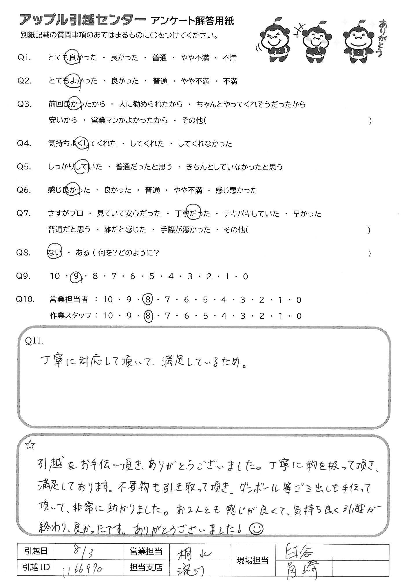 A.引越をお手伝い頂き、ありがとうございました。丁寧に物を扱って頂き、満足しております。不要物も引取って頂き、ダンボール等ゴミ出しも手伝って頂いて非常に助かりました。お2人とも感じが良くて、気持ち良く引越が終わり、良かったです。ありがとうございました!