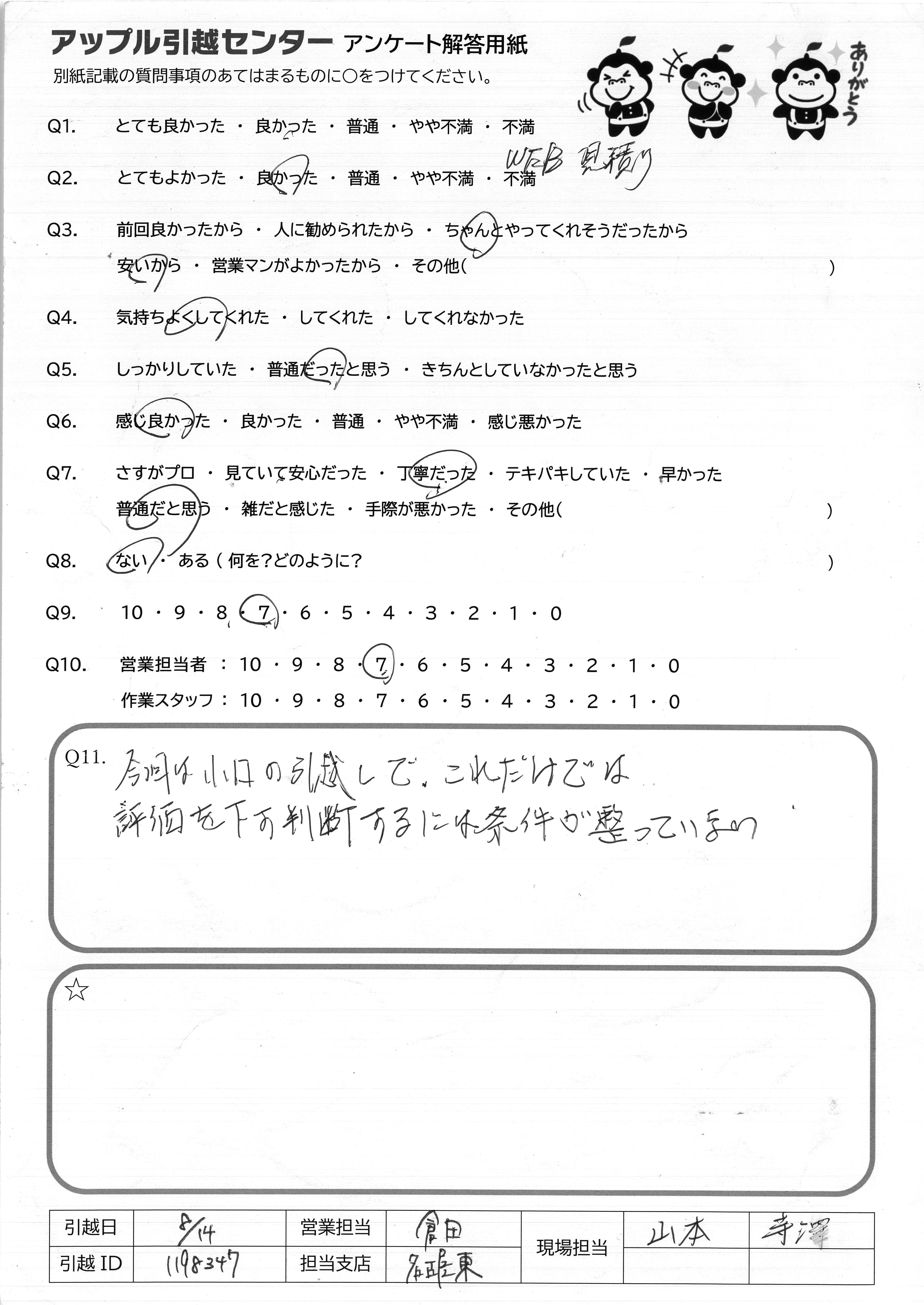 A.今回は小口の引越しで、これだけでは評価を下す判断するには条件が整っていない。