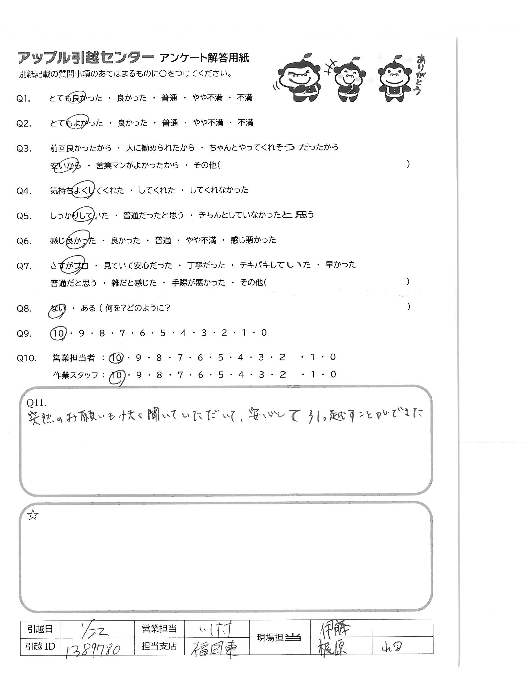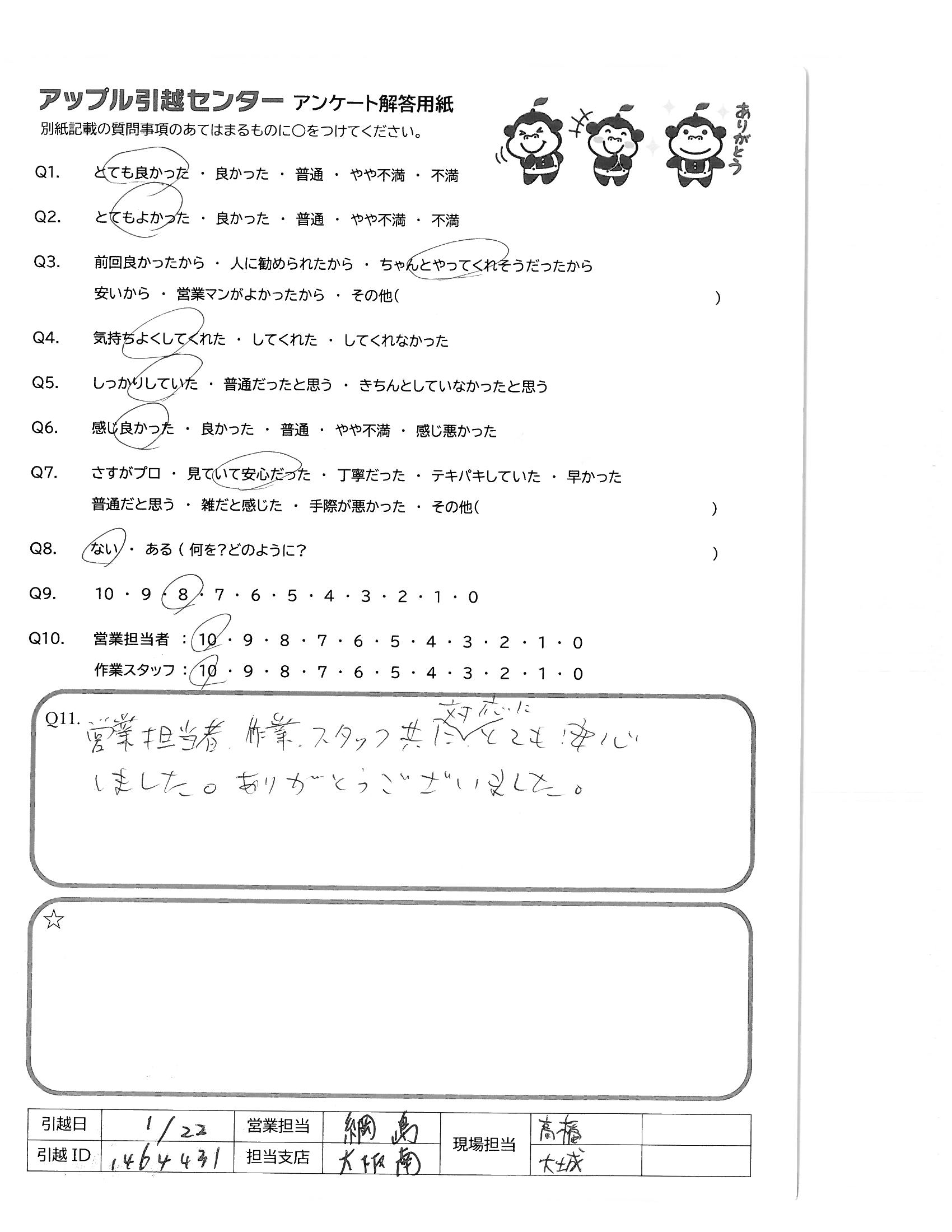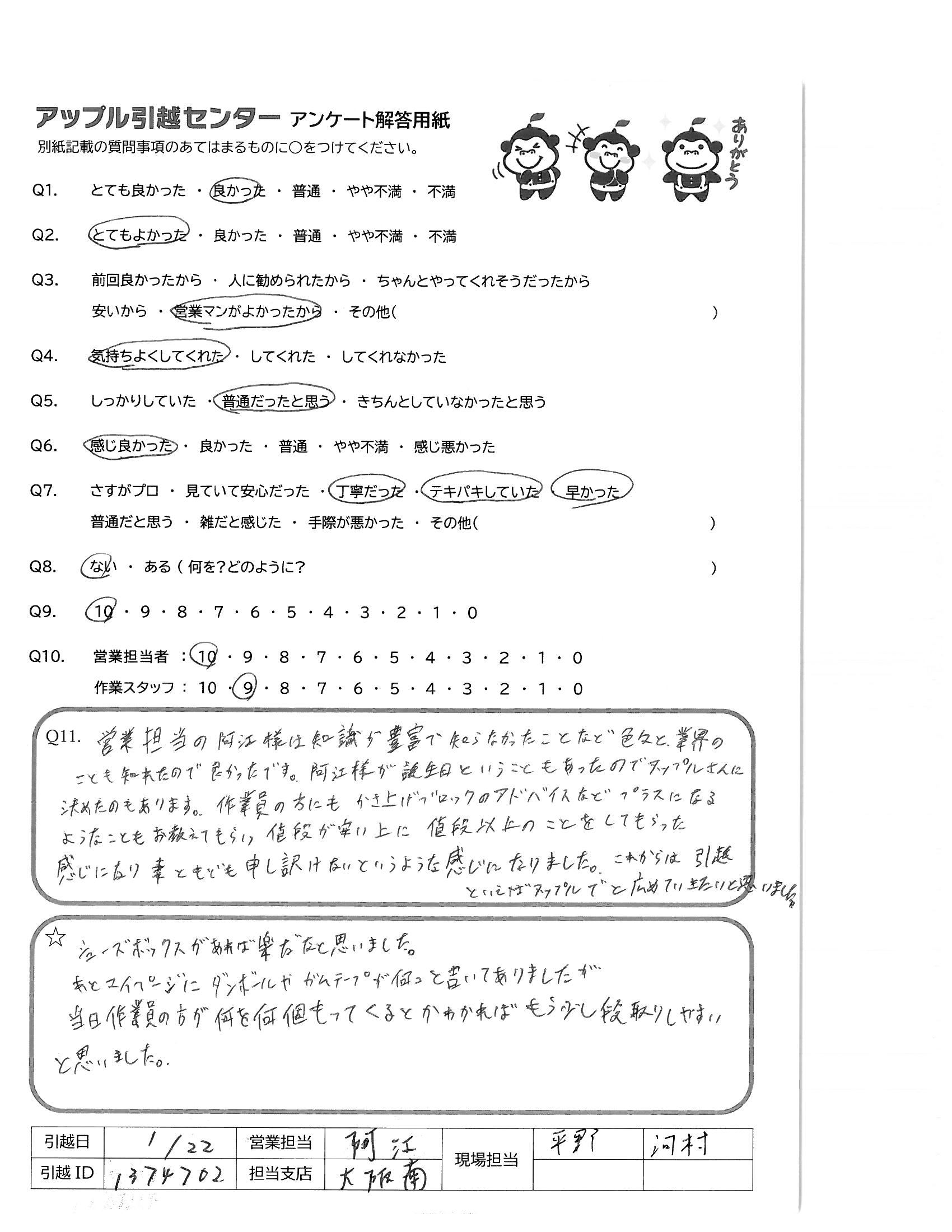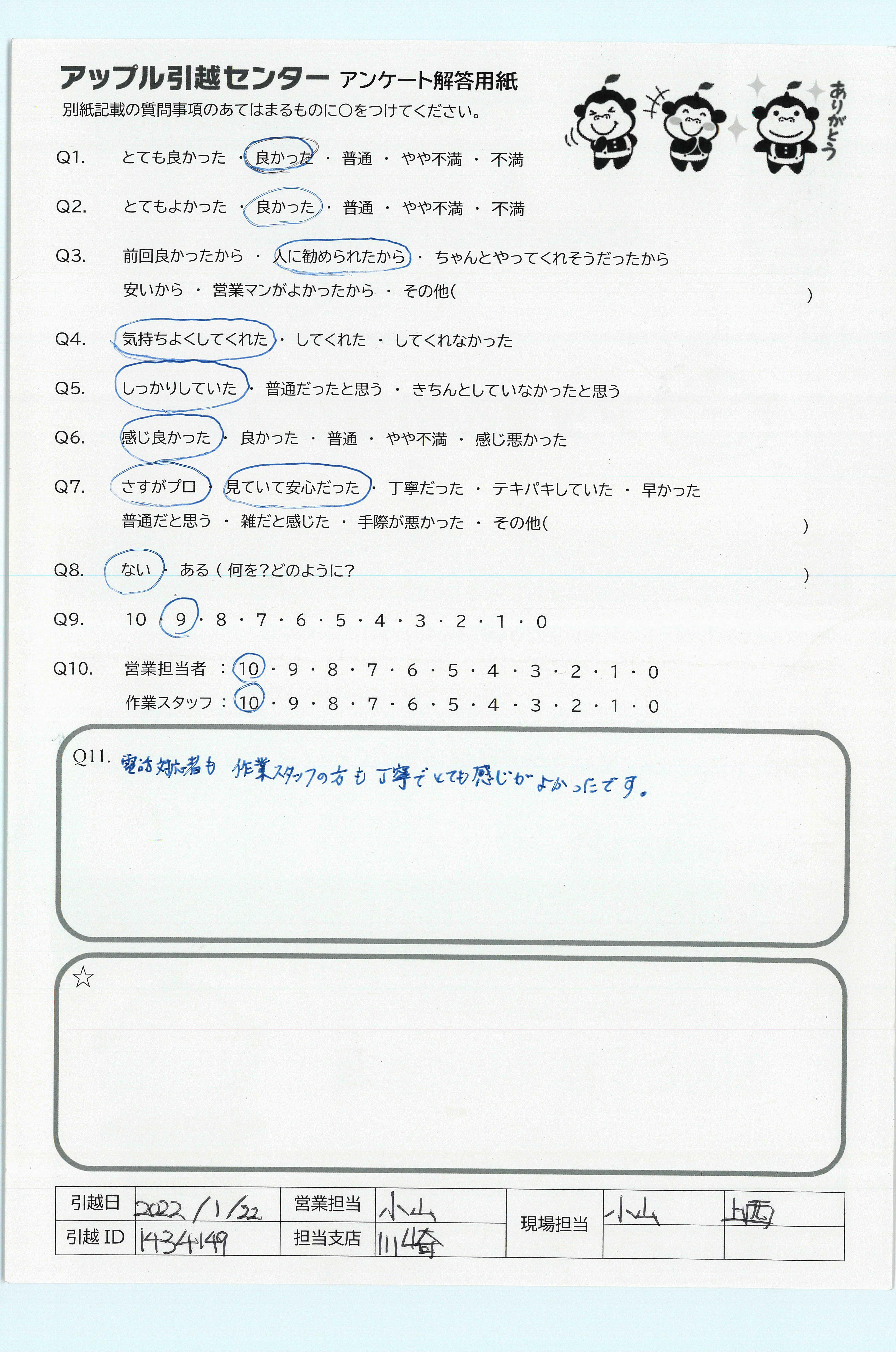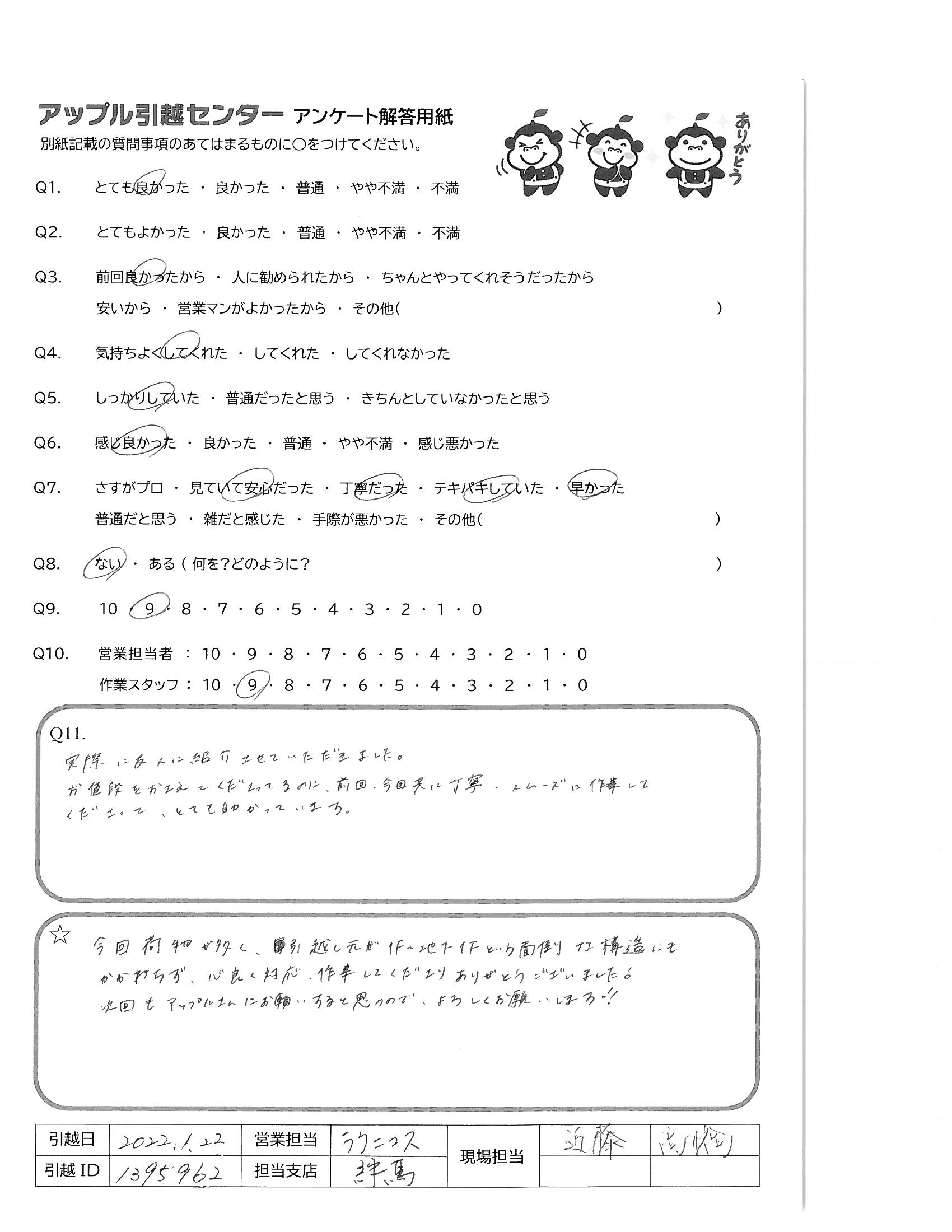 A.今回荷物が多く、引越し元が1F~地下1Fという面倒な構造にもかかわらず、心良く対応、作業してくださりありがとうございました! 次回もアップルさんにお願いすると思うので、よろしくお願いします!!