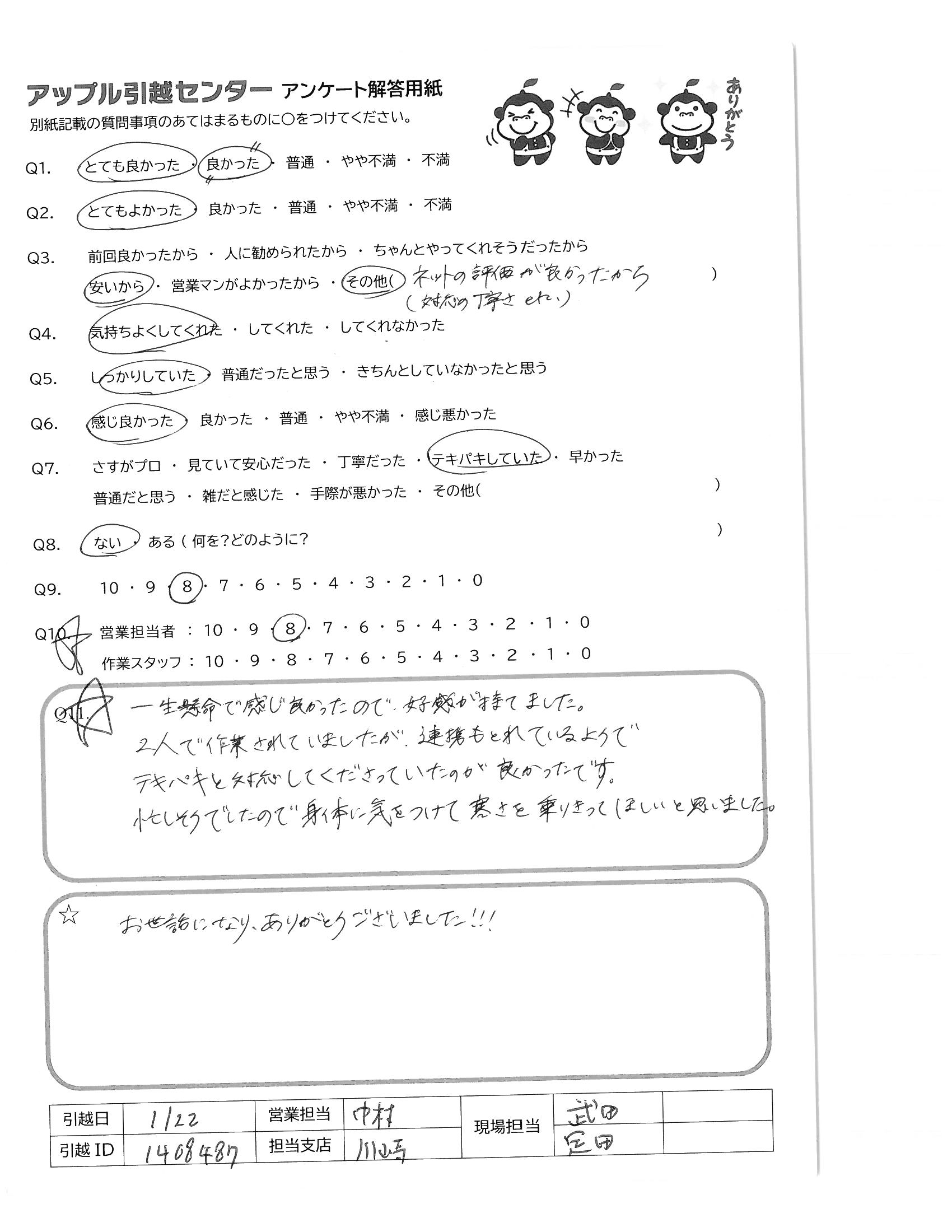 引越し日:2022年01月22日 エリア:神奈川県川崎市宮前区