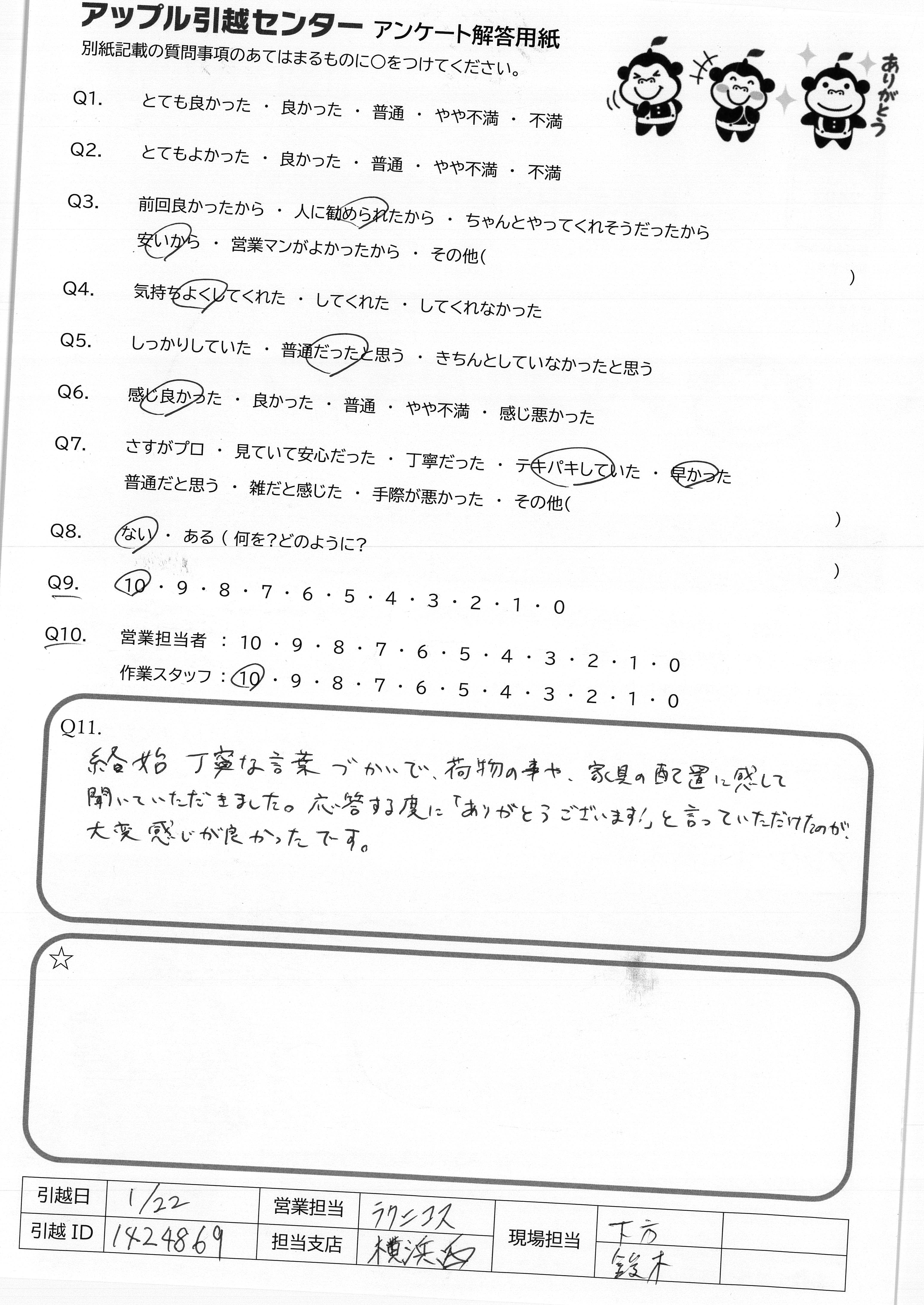 A.終始丁寧な言葉づかいで、荷物の事や家具の配置に感して聞いていただきました。応答する度に「ありがとうございます!」と言っていただけたのが、大変感じが良かったです。