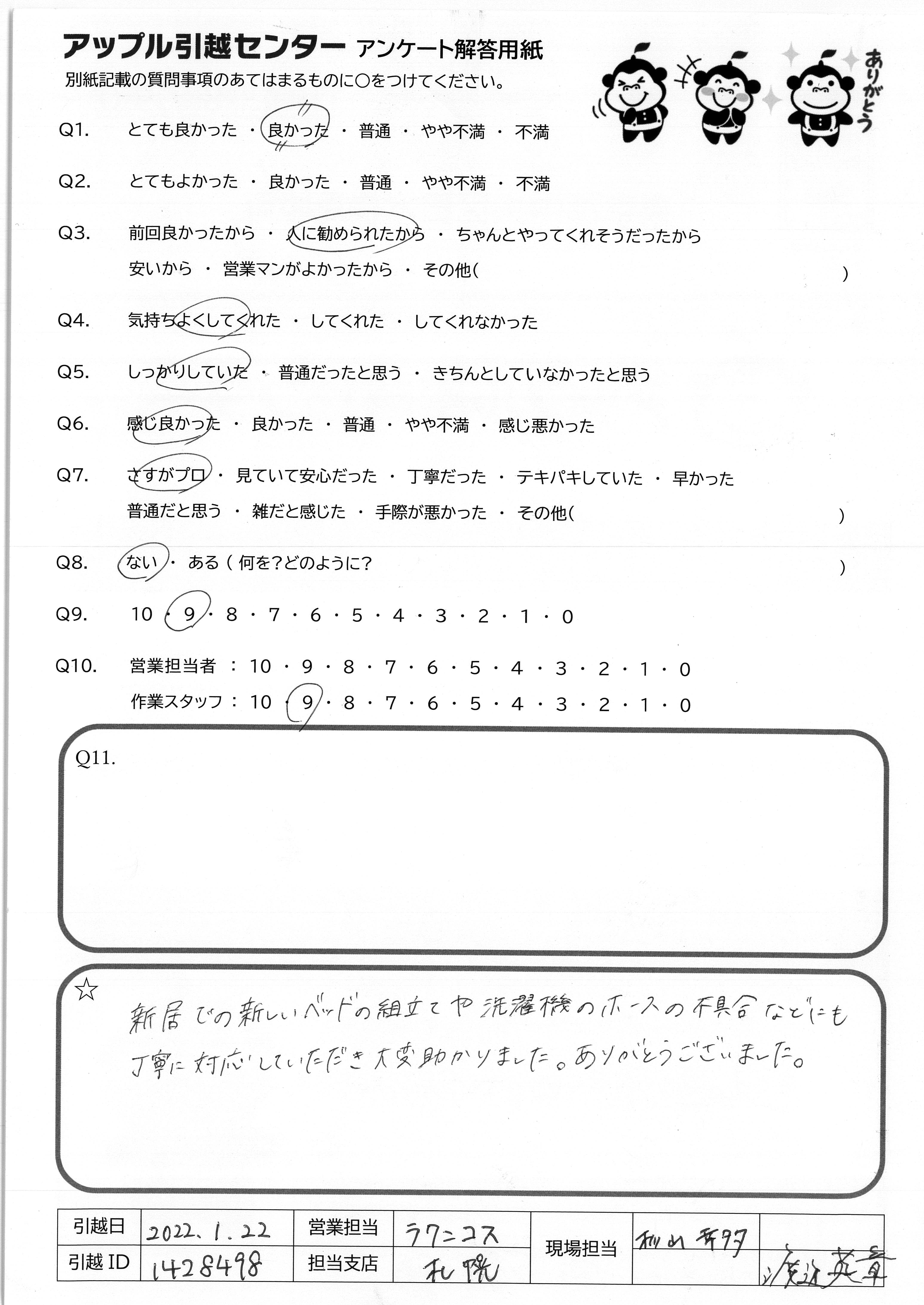 A.新居での新しいベッドの組立てや洗濯機のホースの不具合などにも丁寧に対応していただき大変助かりました。ありがとうございました。