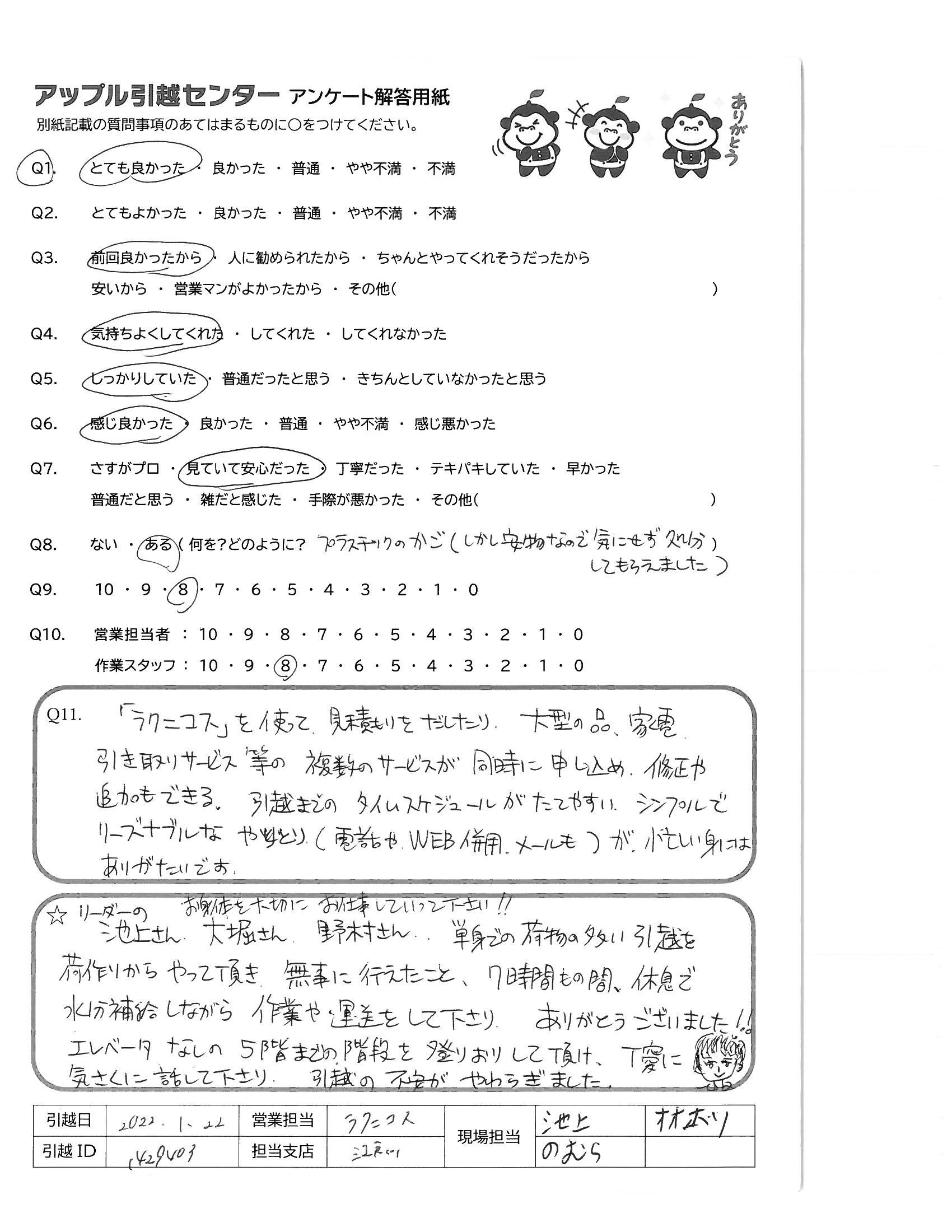 A.リーダーの池上さん、大堀さん、野村さん、単身での荷物の多い引越しを荷作りからやって頂き、無事に行えたこと、7時間もの間、休息で水分補給しながら作業や運送をして下さりありがとうございました!! エレベータなしの5階までの階段を登りおりして頂け、丁寧に気さくに話してくださり引越の不安がやわらぎました。