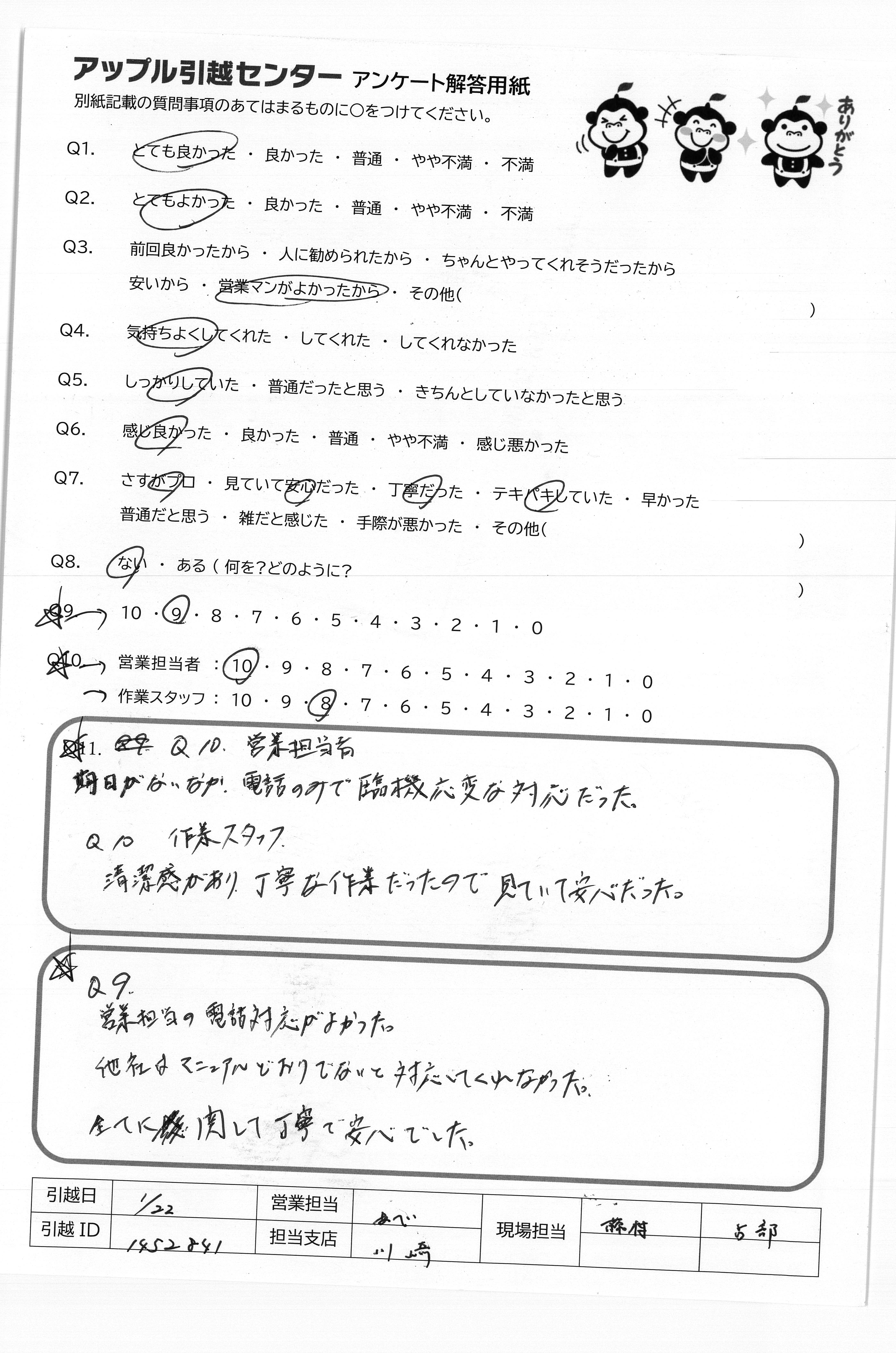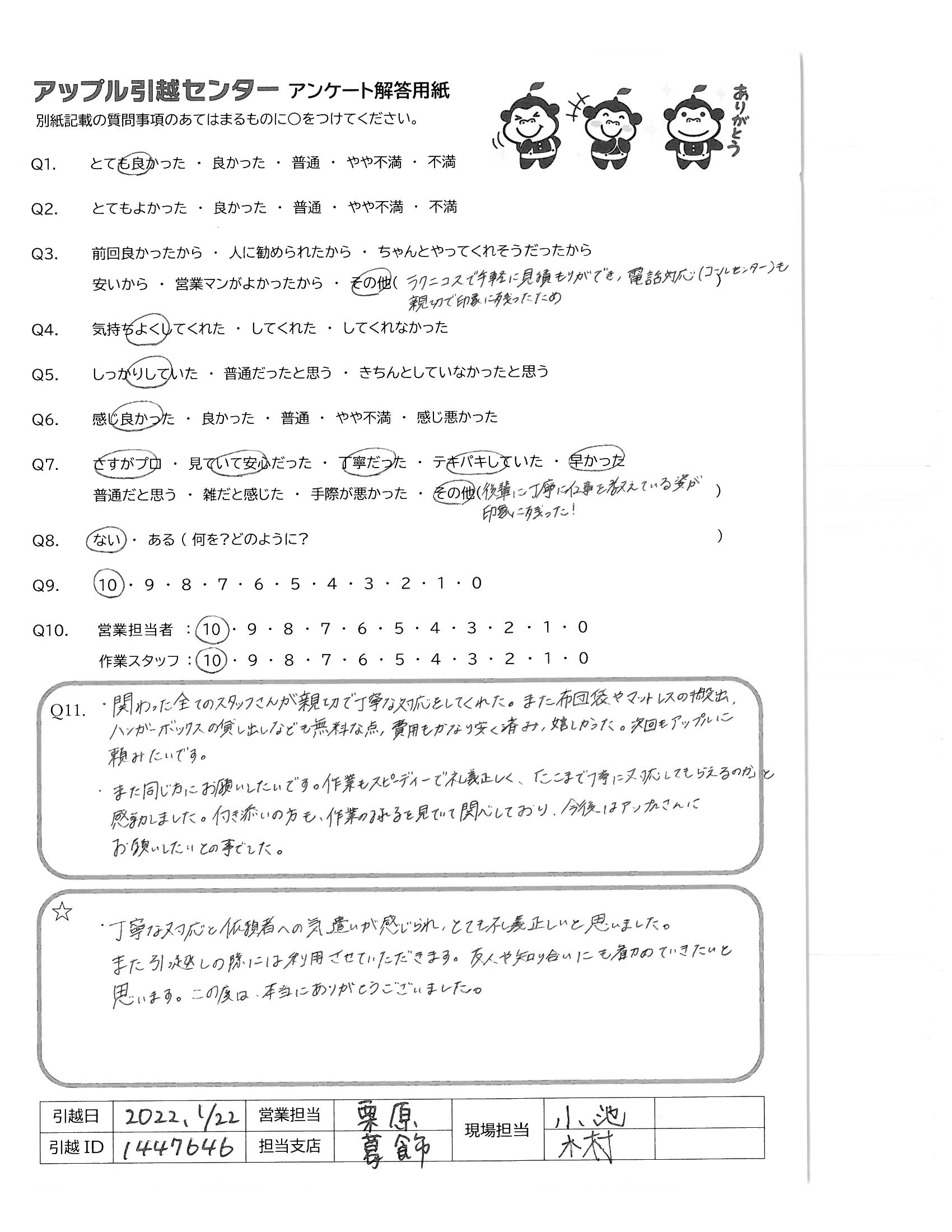 A.・関わった全てのスタッフさんが親切で丁寧な対応をしてくれた。また布団袋やマットレスの搬出、ハンガーボックスの貸し出しなども無料な点、費用もかならず安く済み、嬉しかった。次回もアップルに頼みたいです。 ・また同じ方にお願いしたいです。作業もスピーディーで礼儀正しく、「ここまで丁寧に対応してもらえるのか」と感動しました。付き添いの方も、作業の様子を見ていて関心しており、今後はアップルさんにお願いしたいとの事でした。